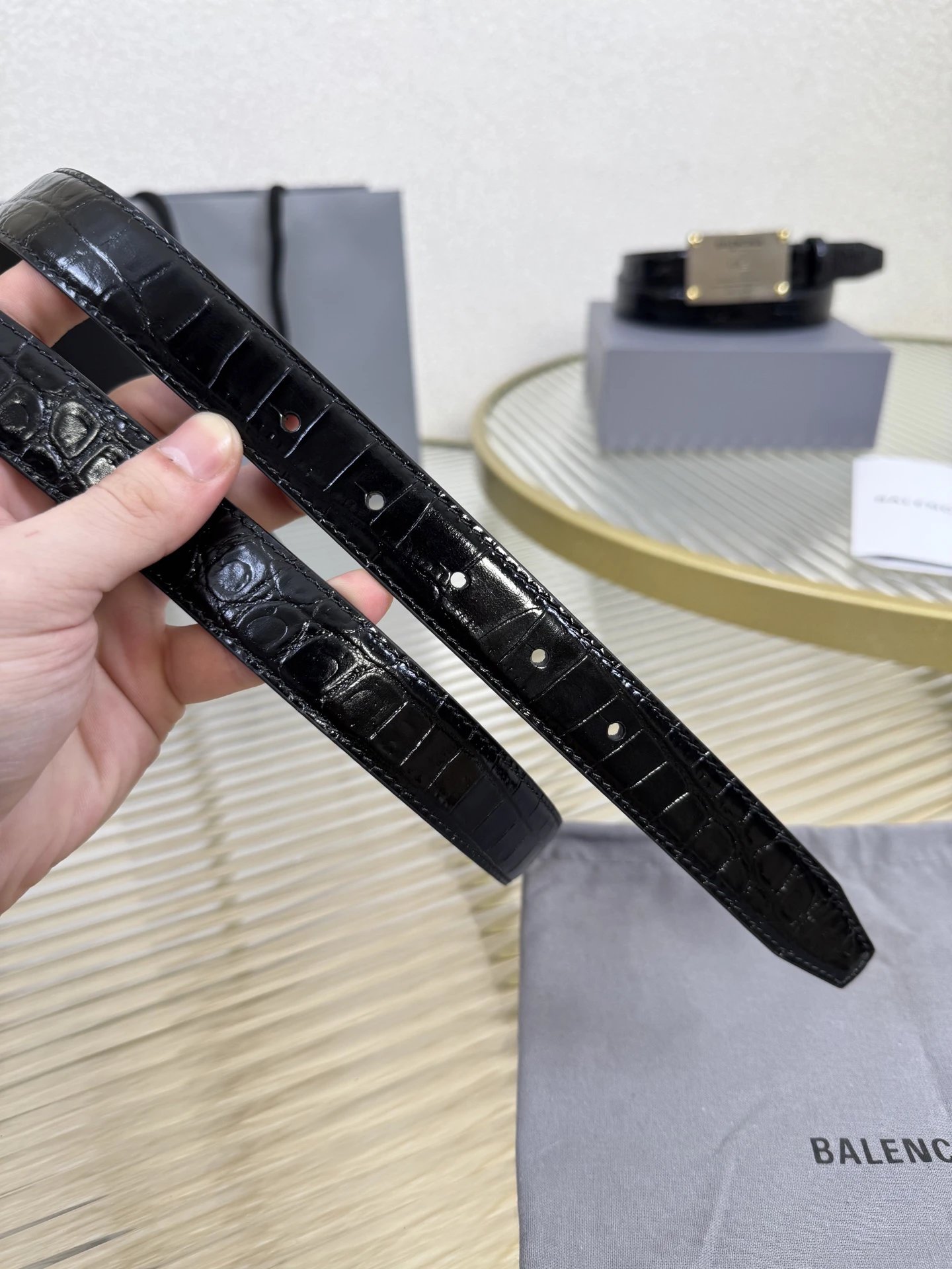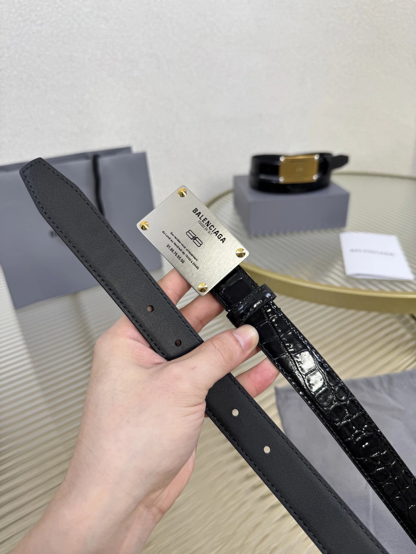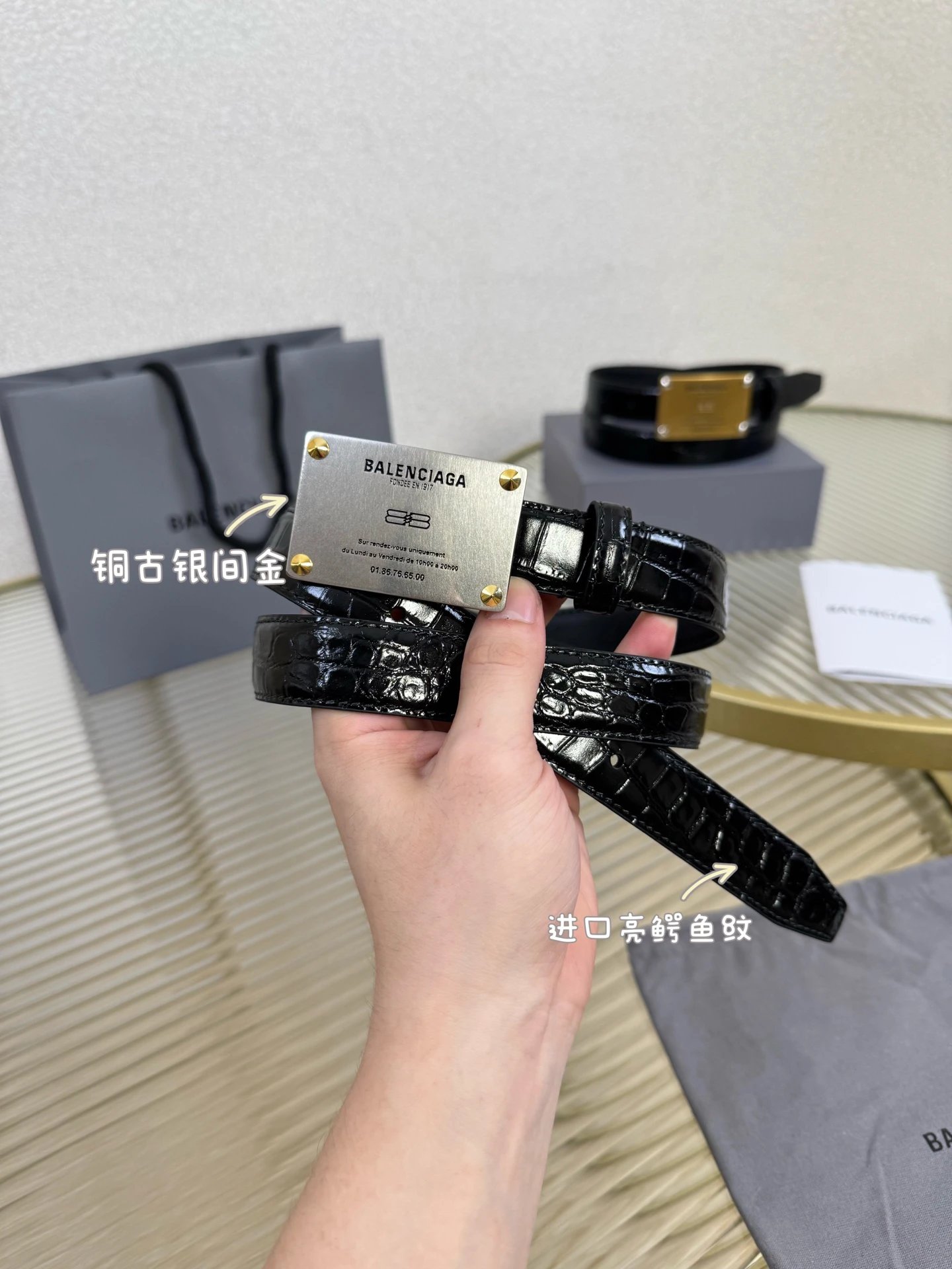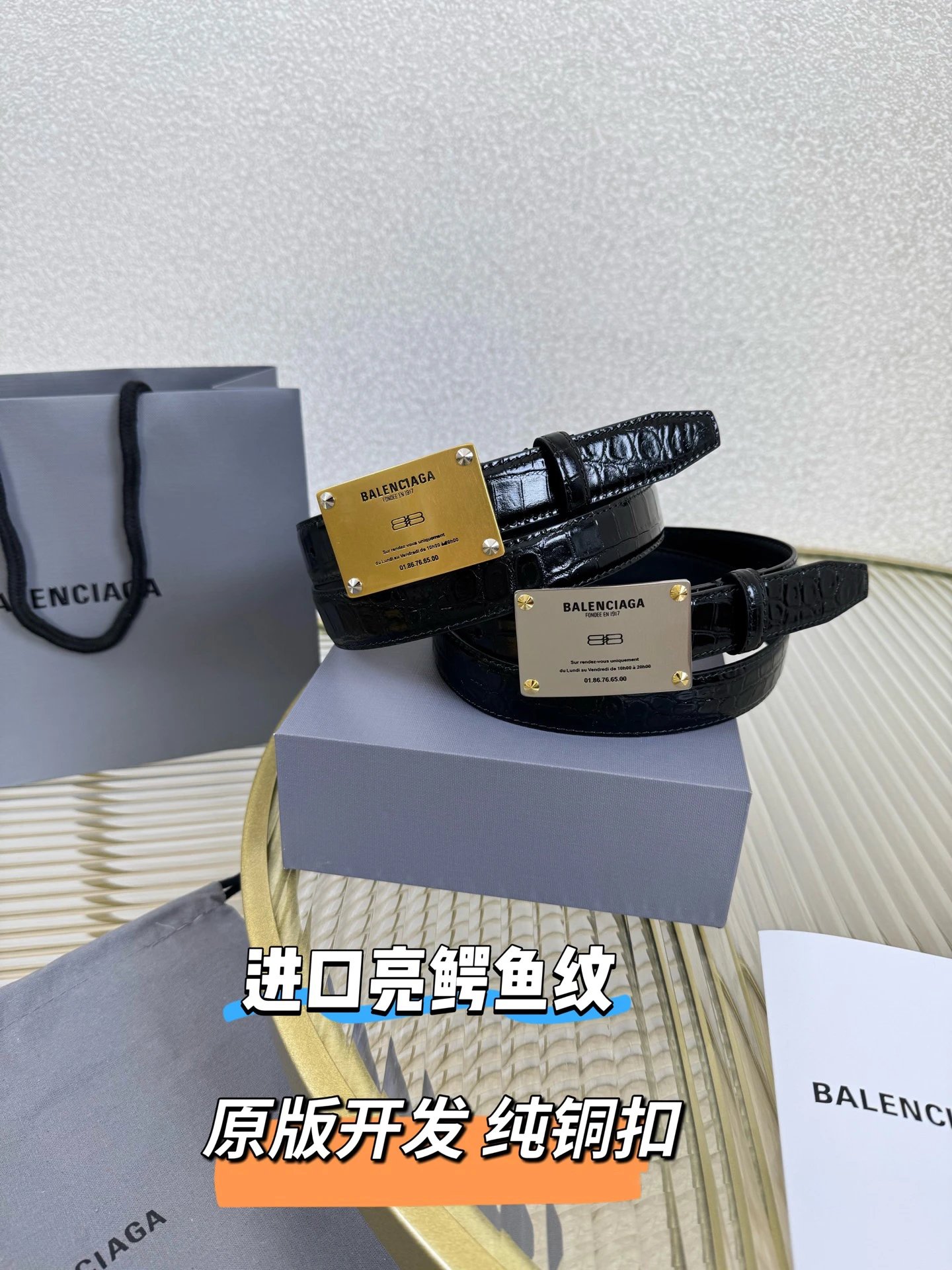Balenciaga is a leading French luxury brand. This accessory uses imported calfskin, 2.5cm width, vintage brass hardware, urban fashion design. Versatile and charming.