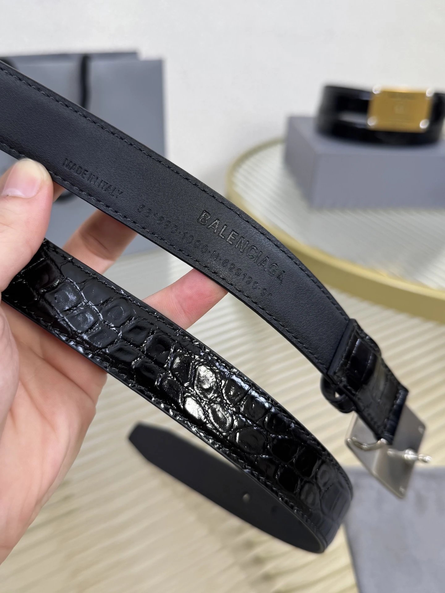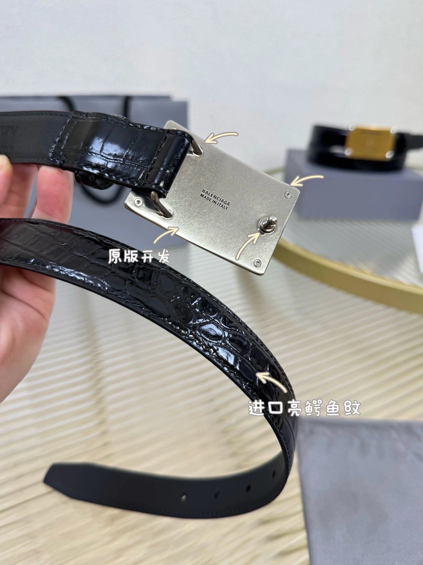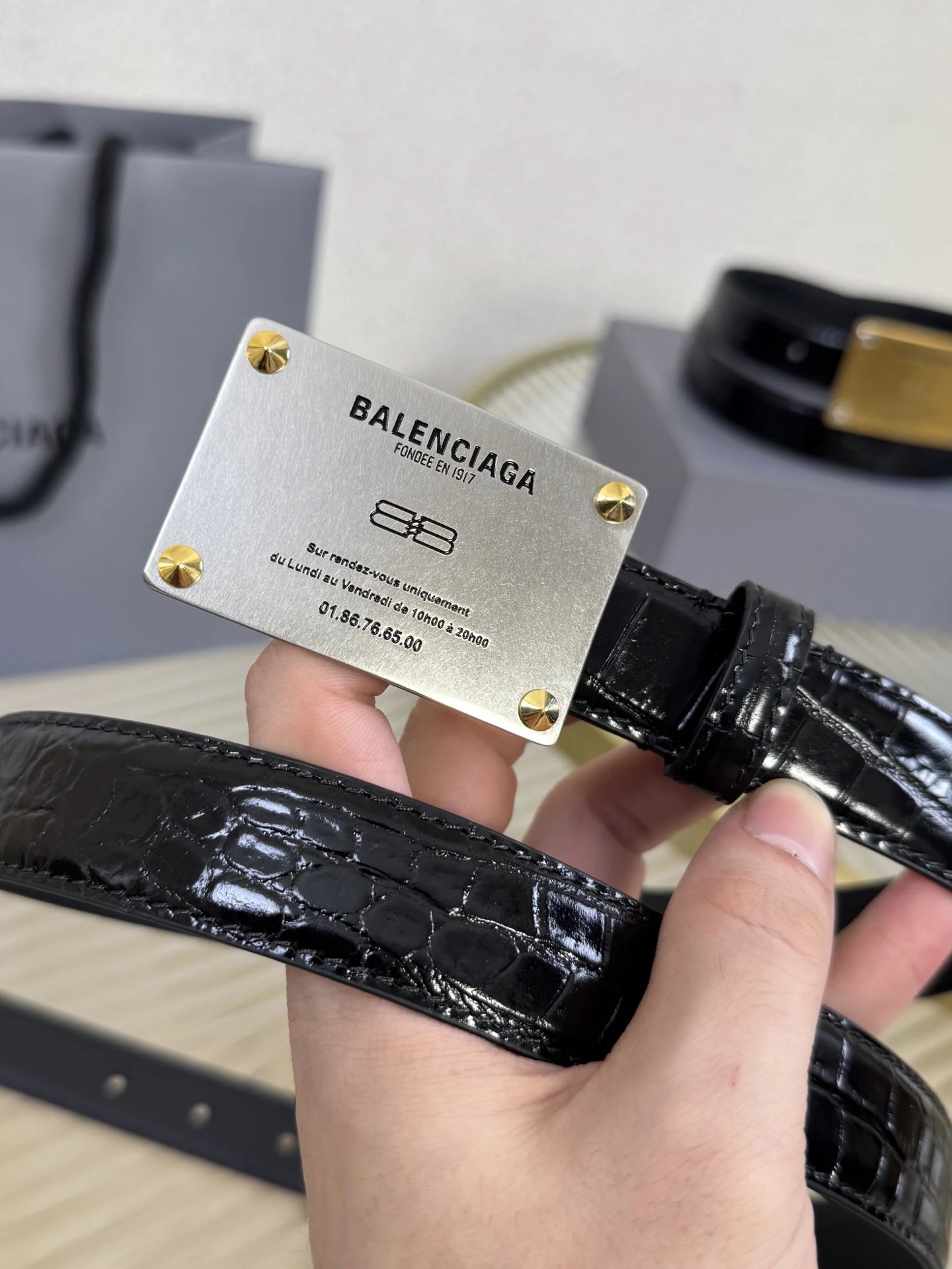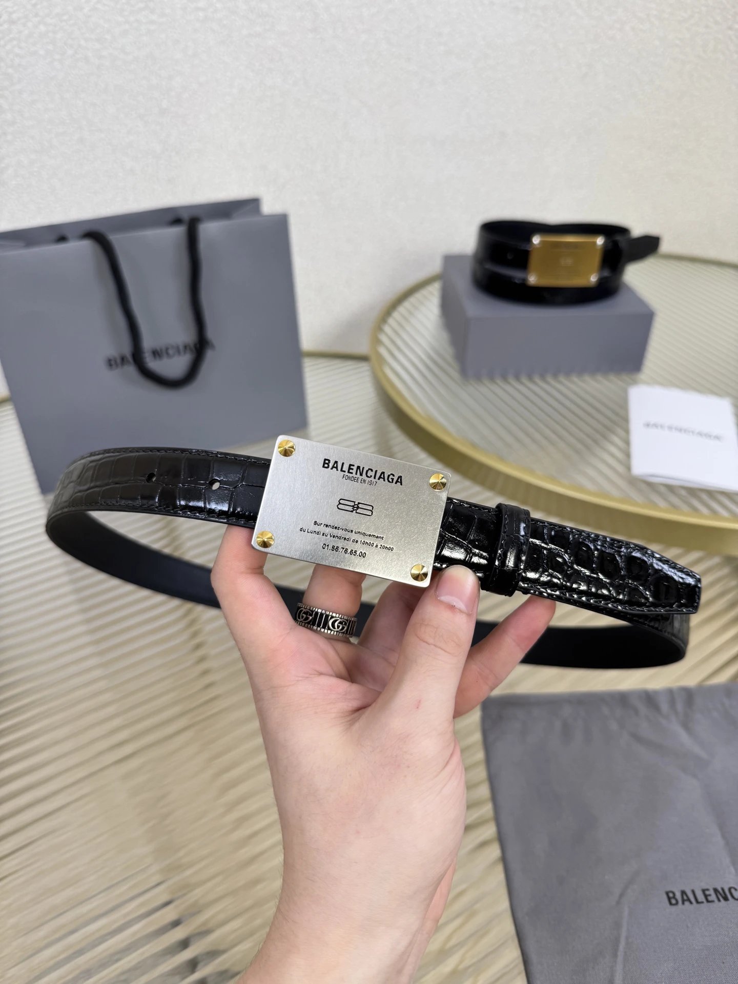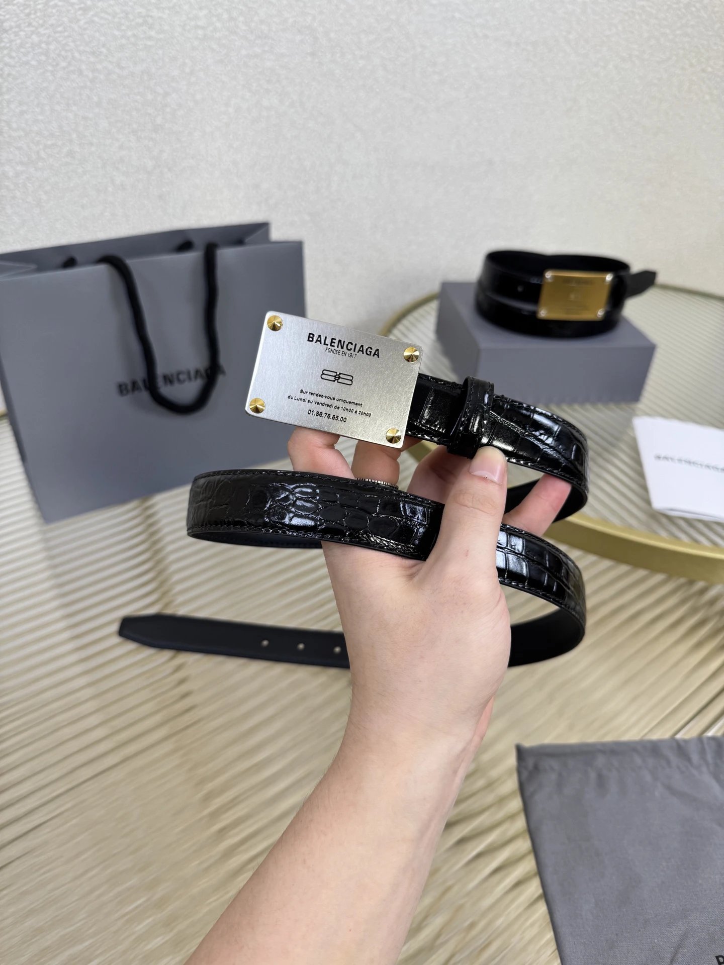 Balenciaga is a leading French luxury brand. This accessory uses imported calfskin, 2.5cm width, vintage brass hardware, urban fashion design. Versatile and charming.