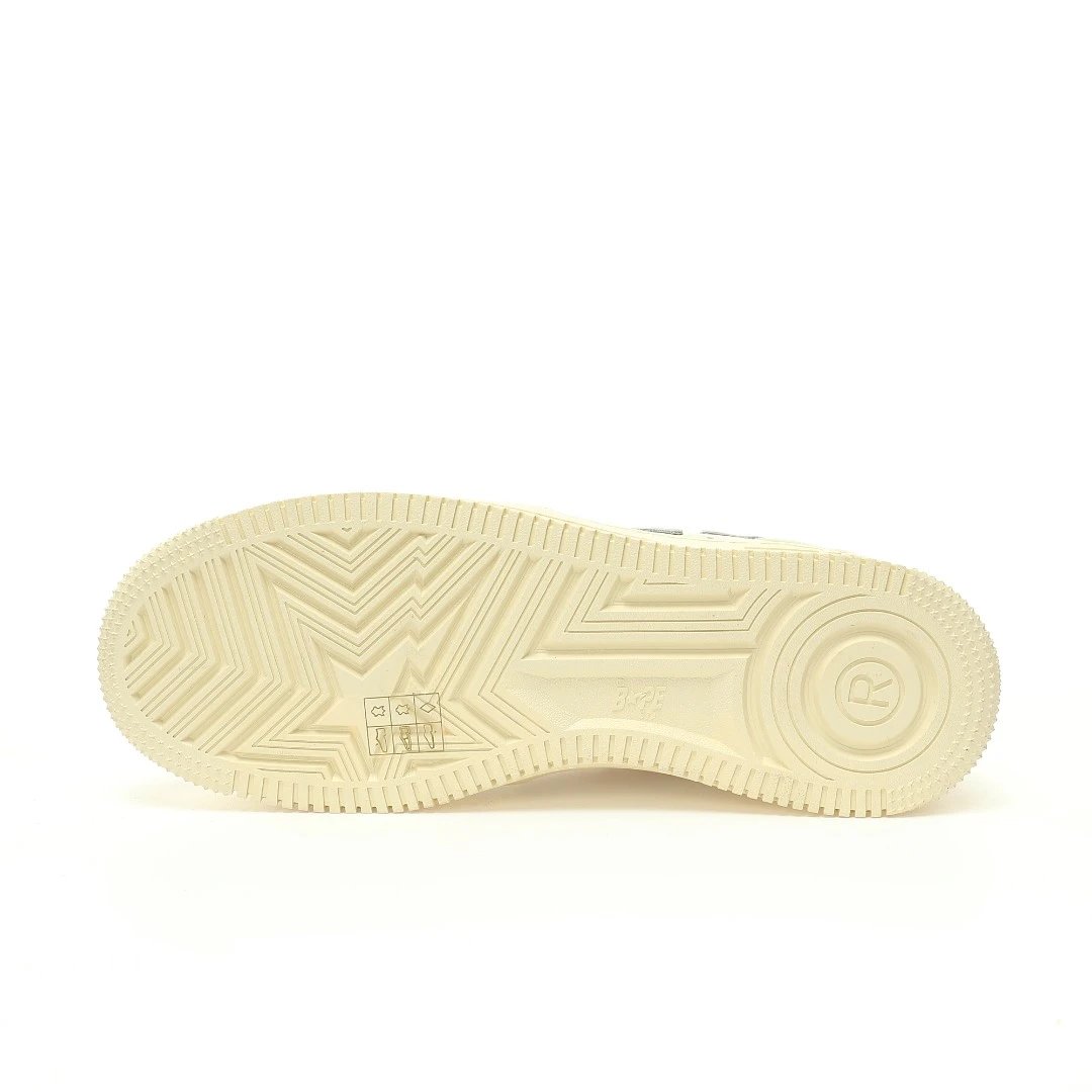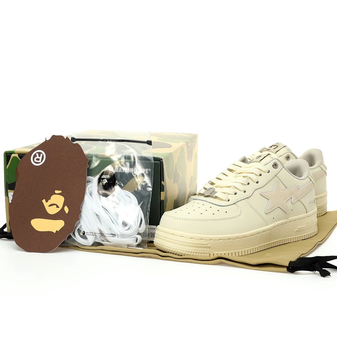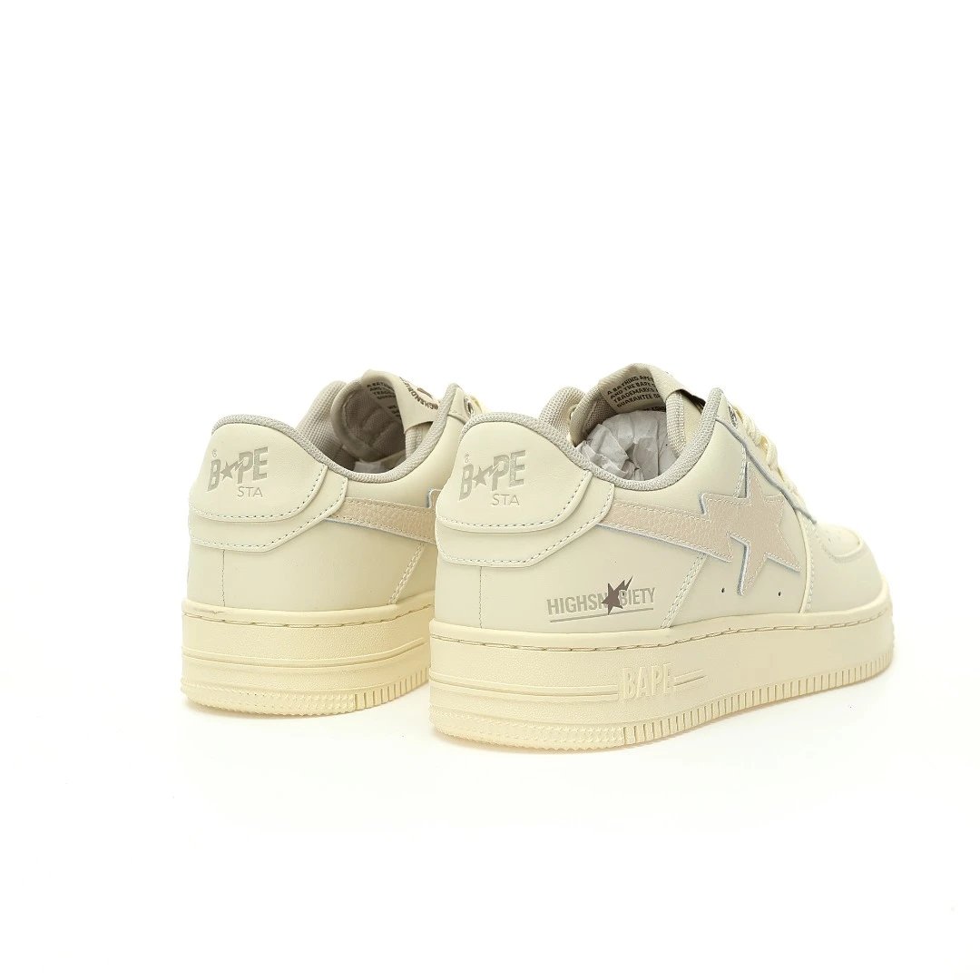 BAPE x HIGHSNOBIETY Sta Low Sand Beige Sneakers use premium calfskin & caviar leather upper, durable rubber outsole.