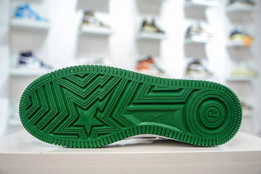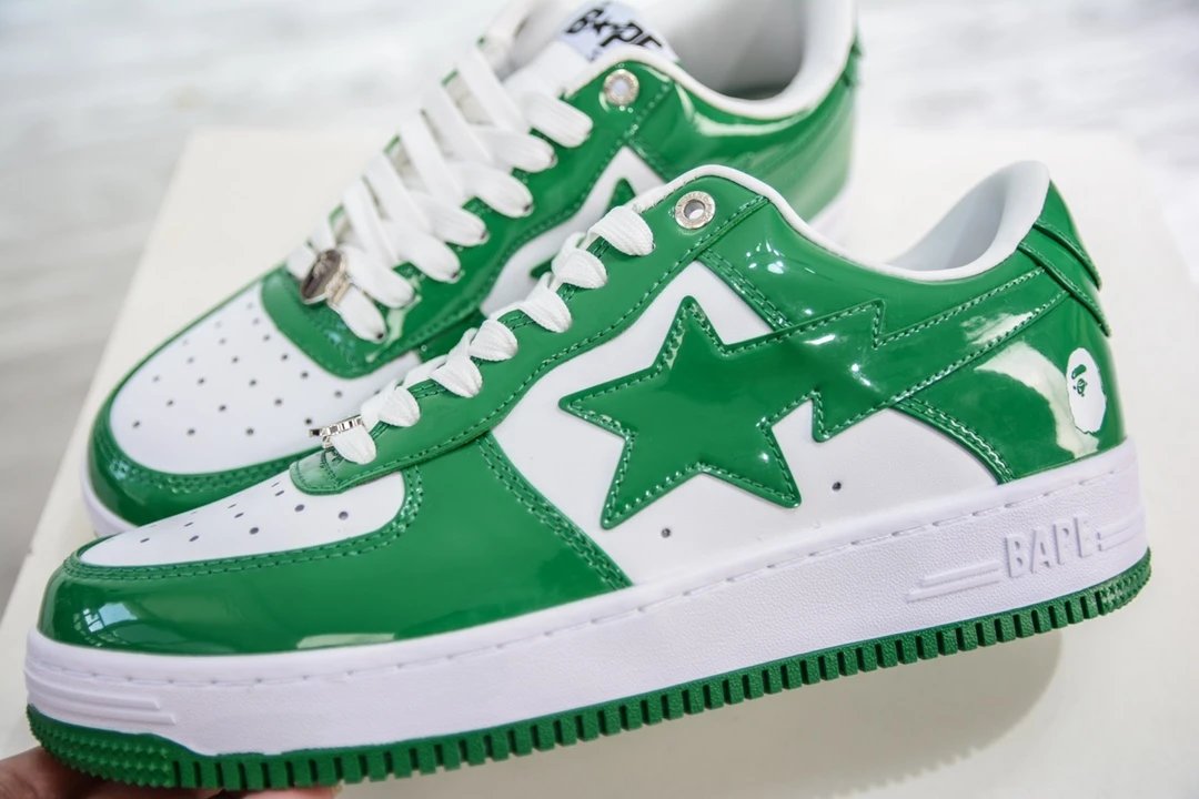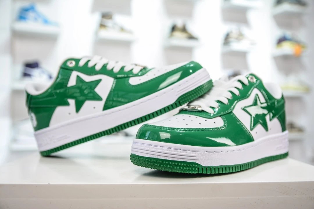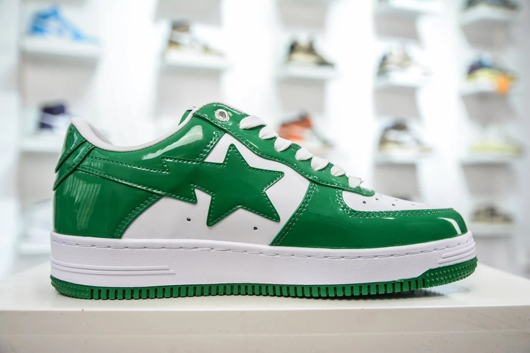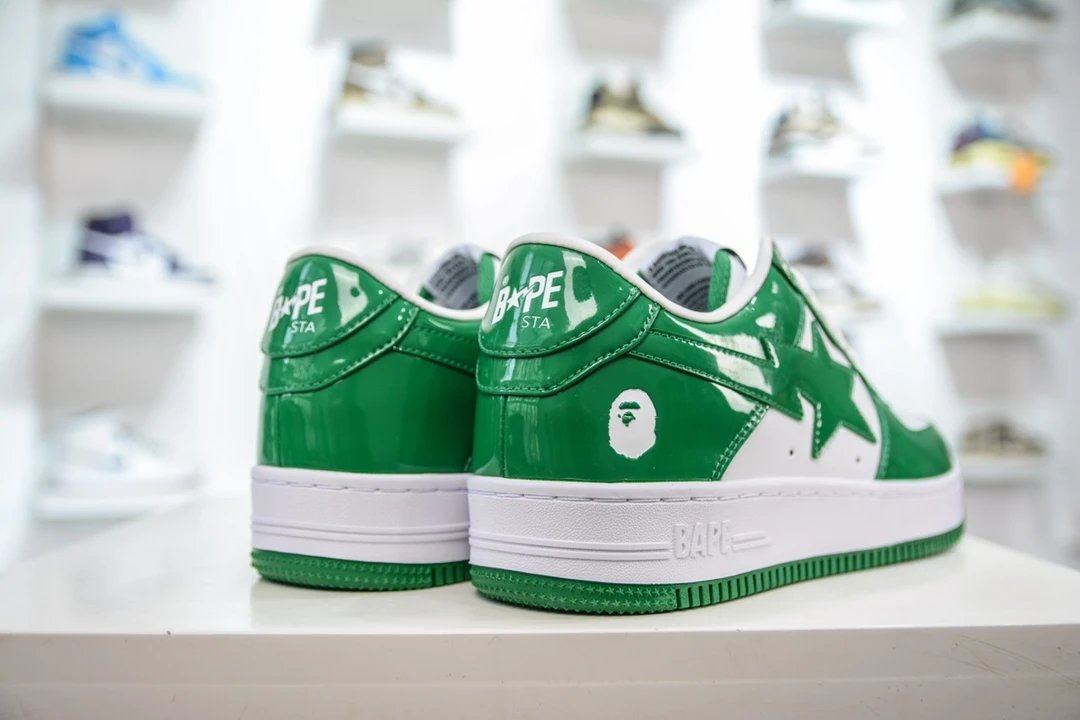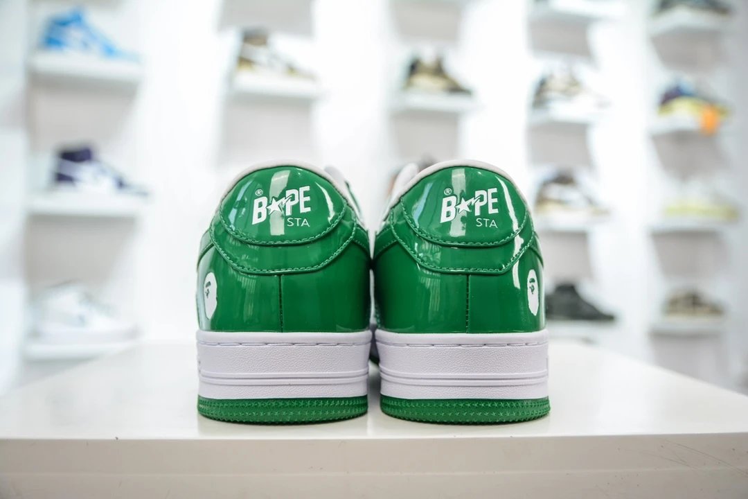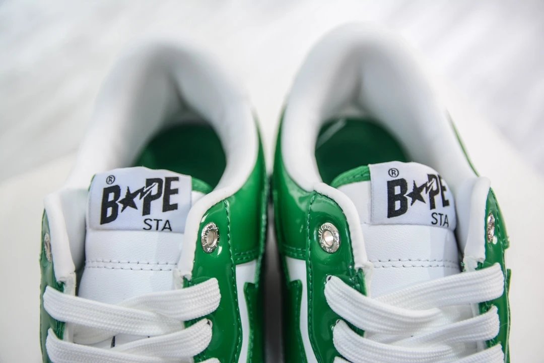BAPE Bape Sta To Low White Green Patent Leather Casual Sneakers use original cardboard lasts for authentic low-profile shape.