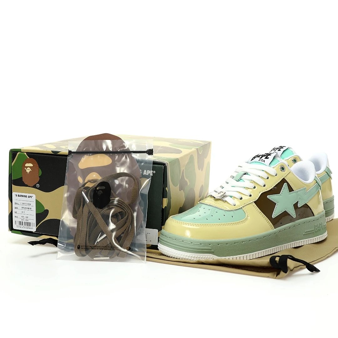 BAPE STA Low Unisex Sneakers feature hard lacquered leather upper, thick durable rubber outsole, and include a drawer box, dust bag, replacement laces.