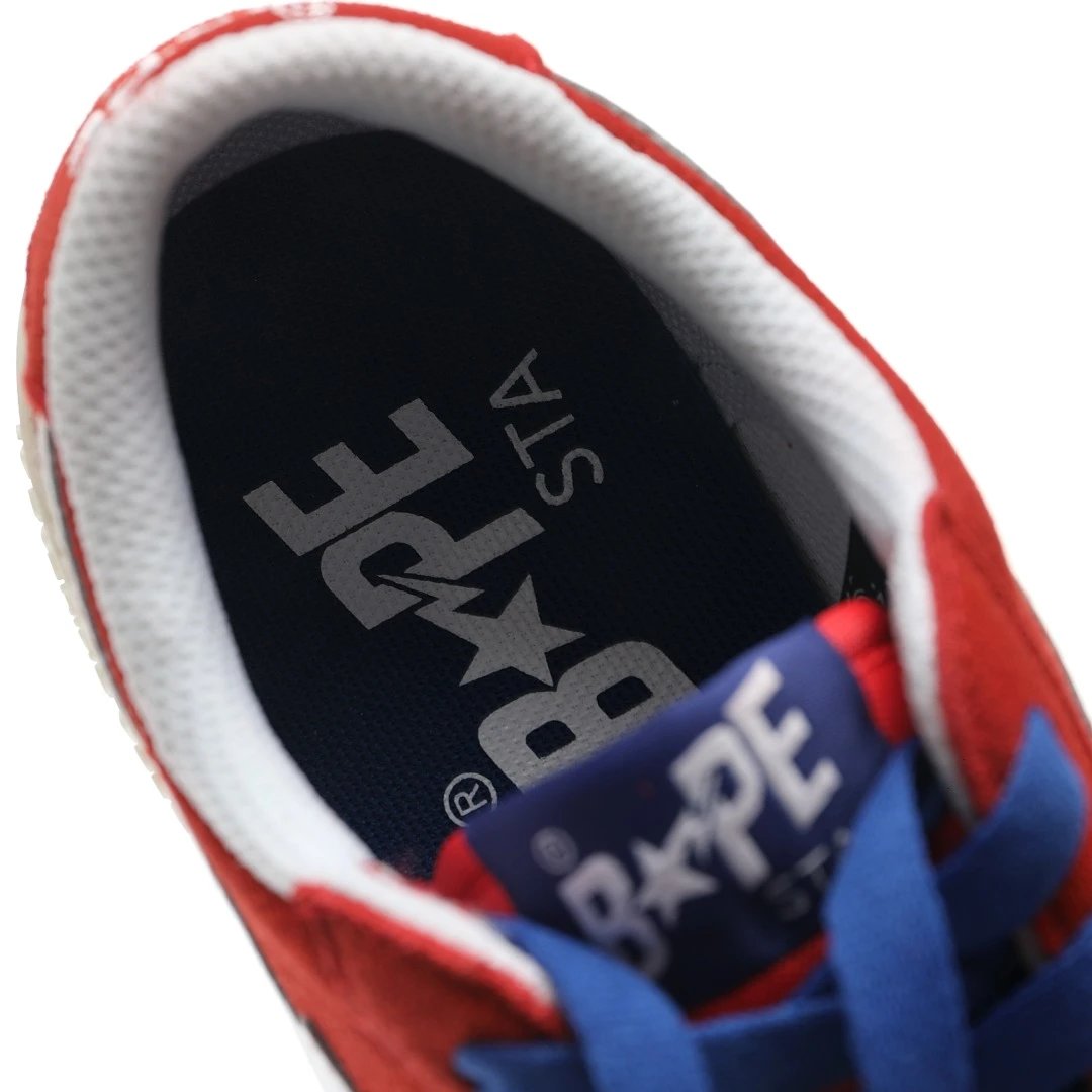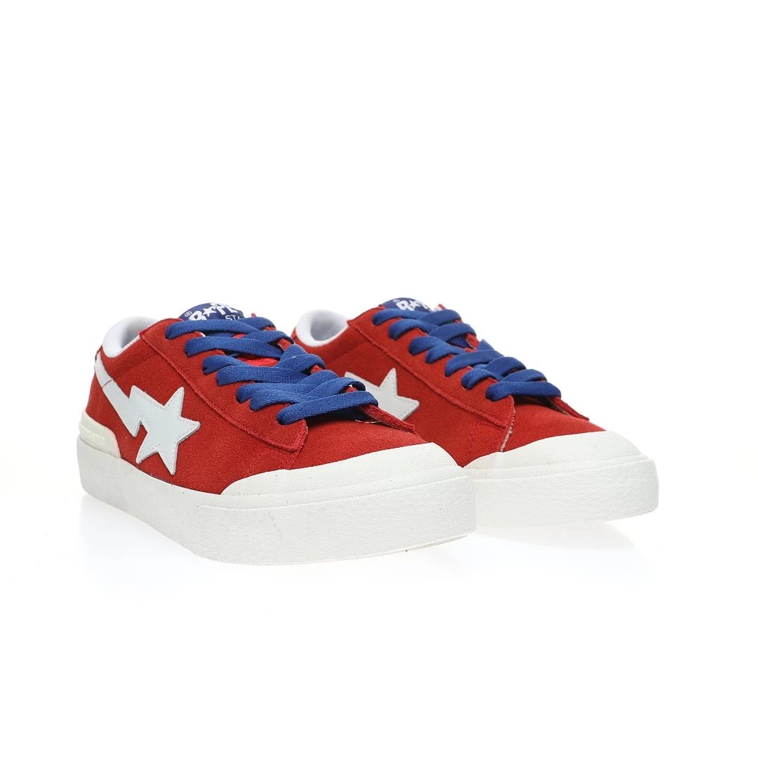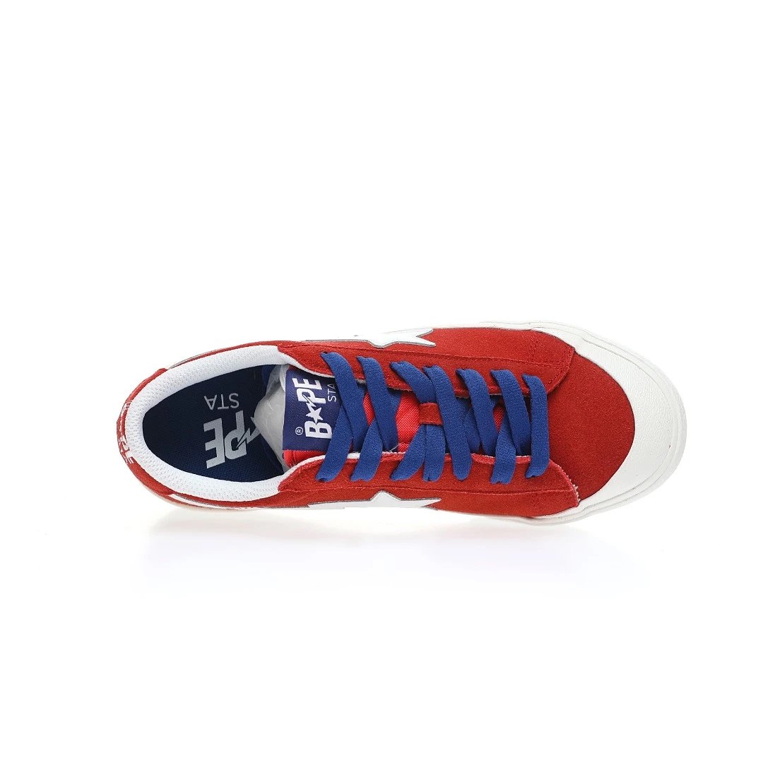 BAPE Mad STA Low Sneakers feature suede upper, vulcanized sole, PU cushion insole. Unisex retro style in RedWhite color, ideal for skateboarding & daily wear.