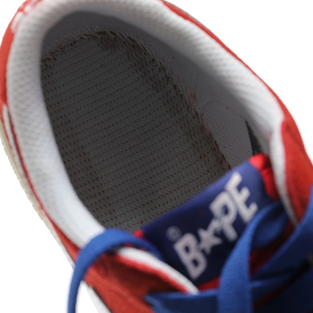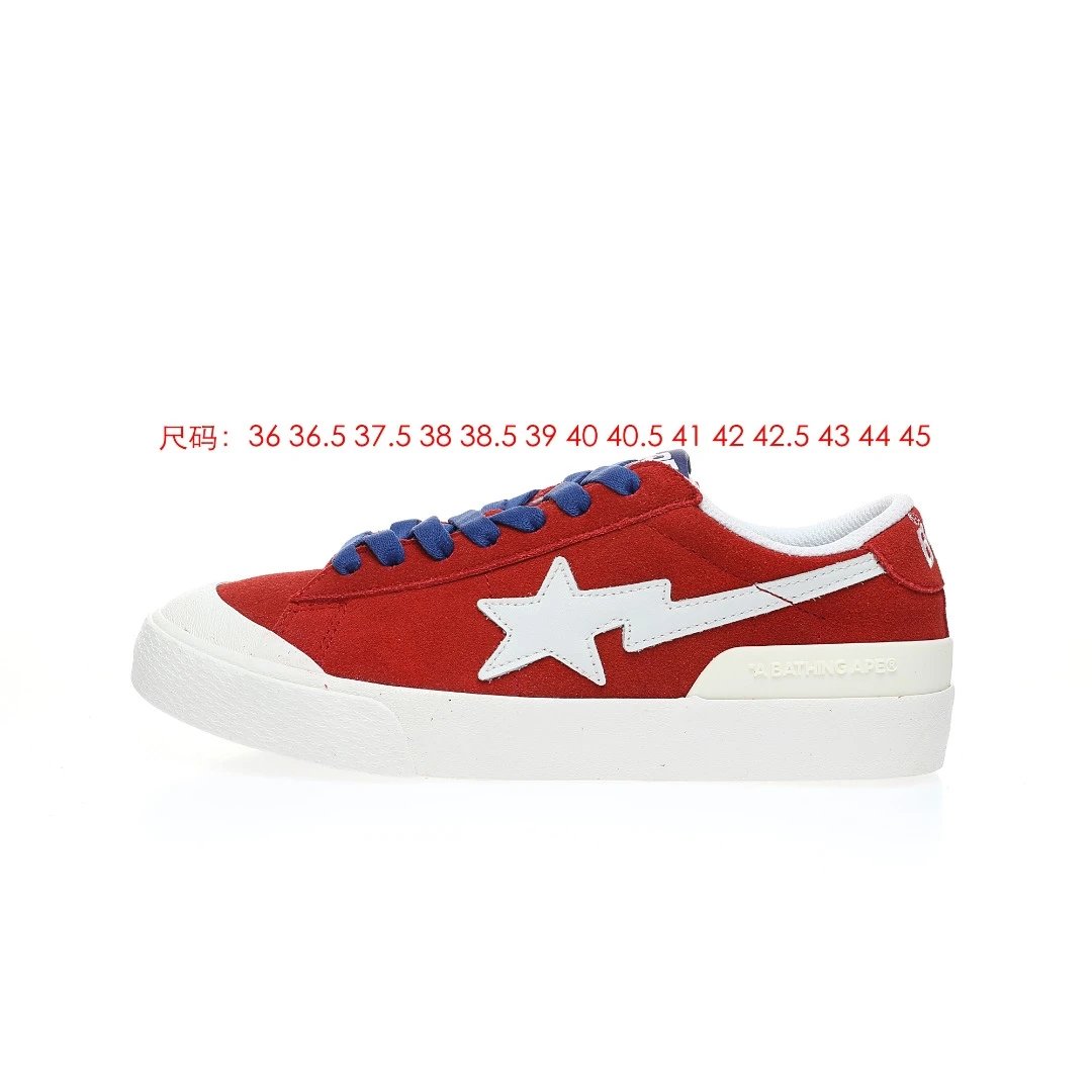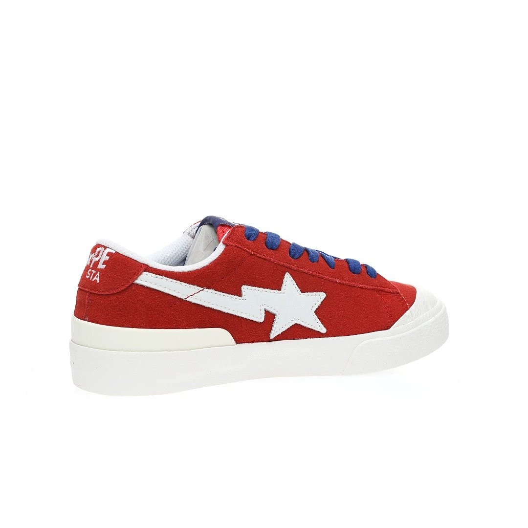 BAPE Mad STA Low Sneakers feature suede upper, vulcanized sole, PU cushion insole. Unisex retro style in RedWhite color, ideal for skateboarding & daily wear.