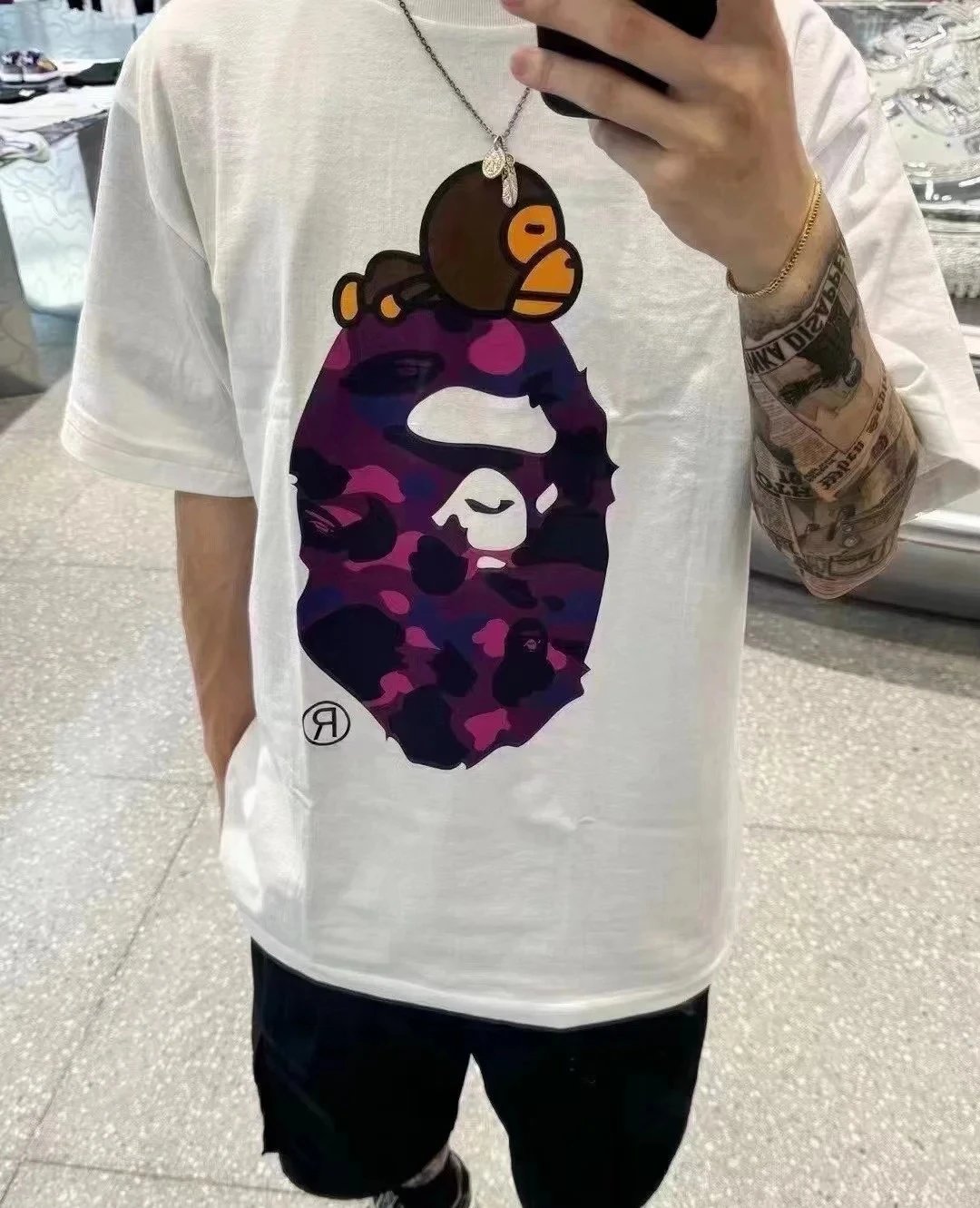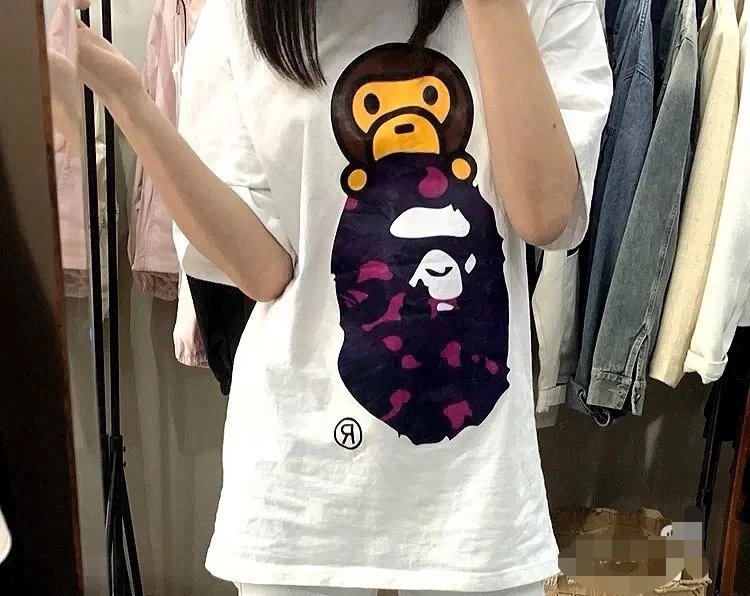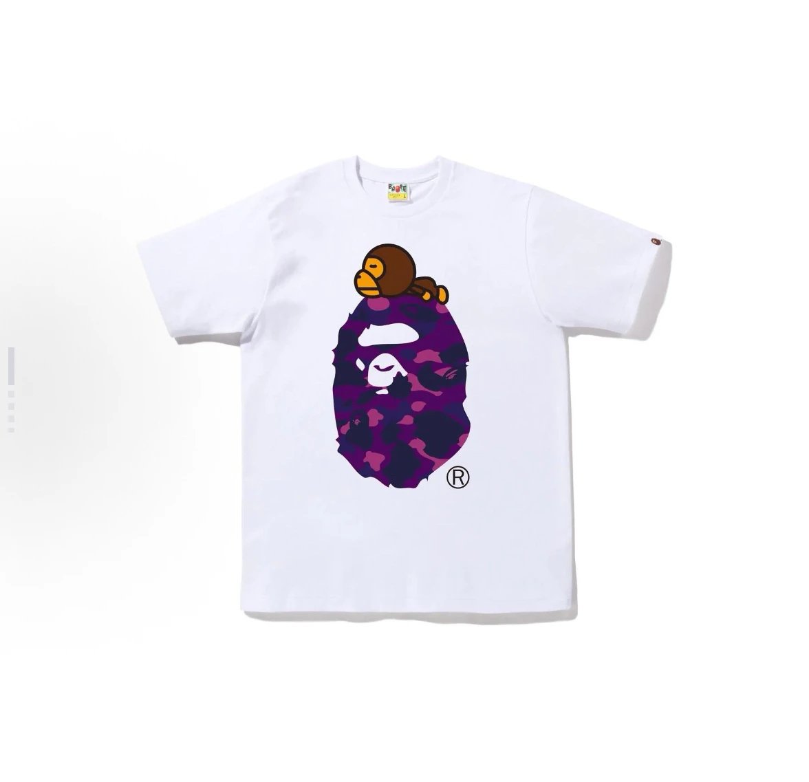 BAPE FW22 Color Camo Milo On Big Ape Tee is a unisex printed short-sleeve T-shirt. Available sizes: S, M, L, XL, 2XL. Colors: Black Purple, White Purple.