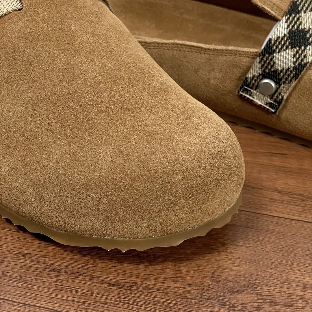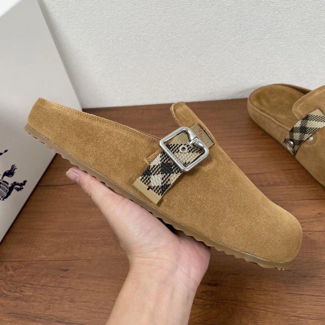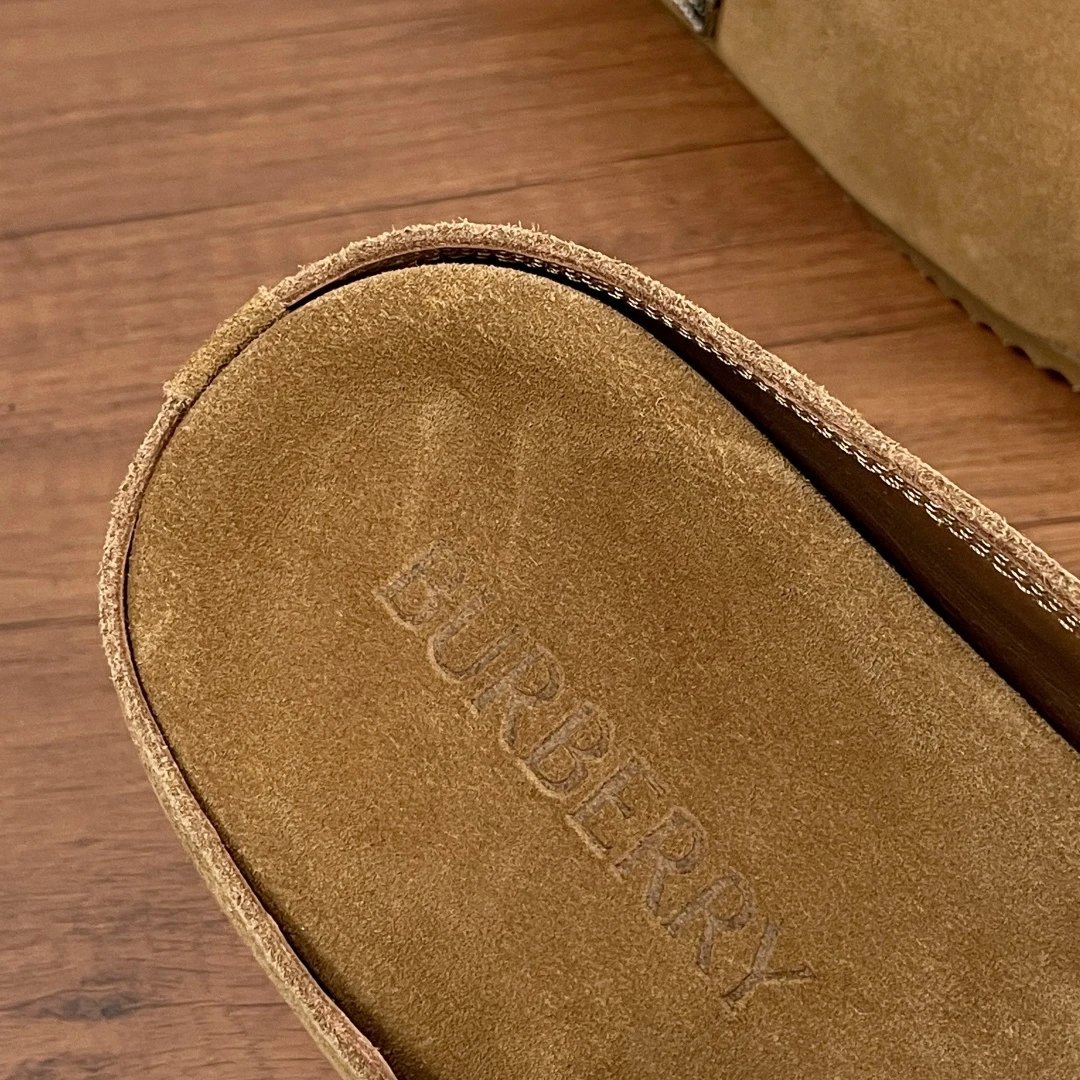 Soft suede cowhide & calfskin, adjustable B-buckle strap, iconic sand check print, wrapped midsole, embossed heel logo, wavy rubber outsole with Burberry lettering. Stylish casual, original packaging + dust bag.