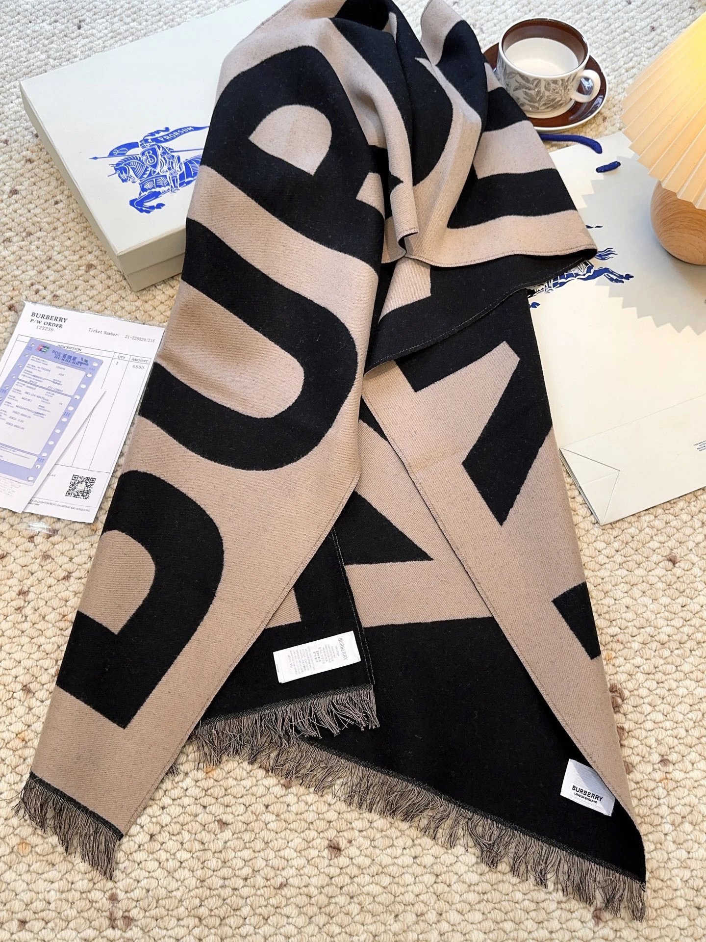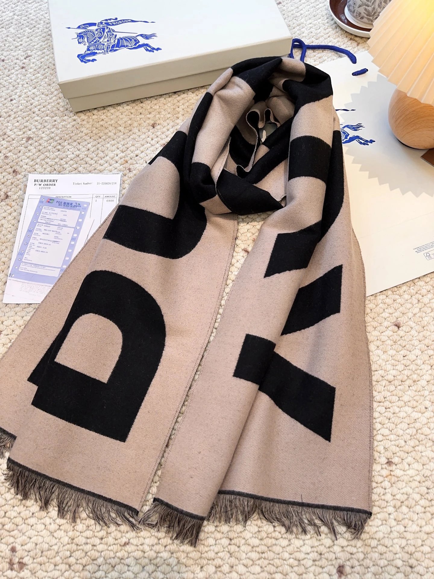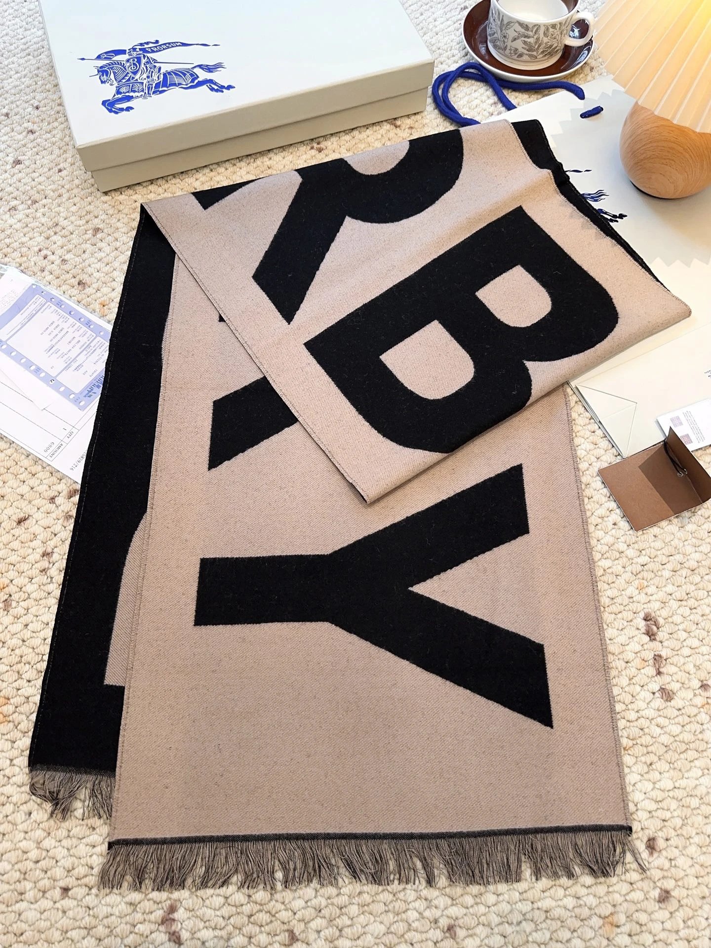 Burberry Double-sided Big Logo Wool Scarf is a popular accessory. Reversible design (2-in-1), soft 100% wool, super warm, classic minimal style. Size:33*188cm, 3 colors available.