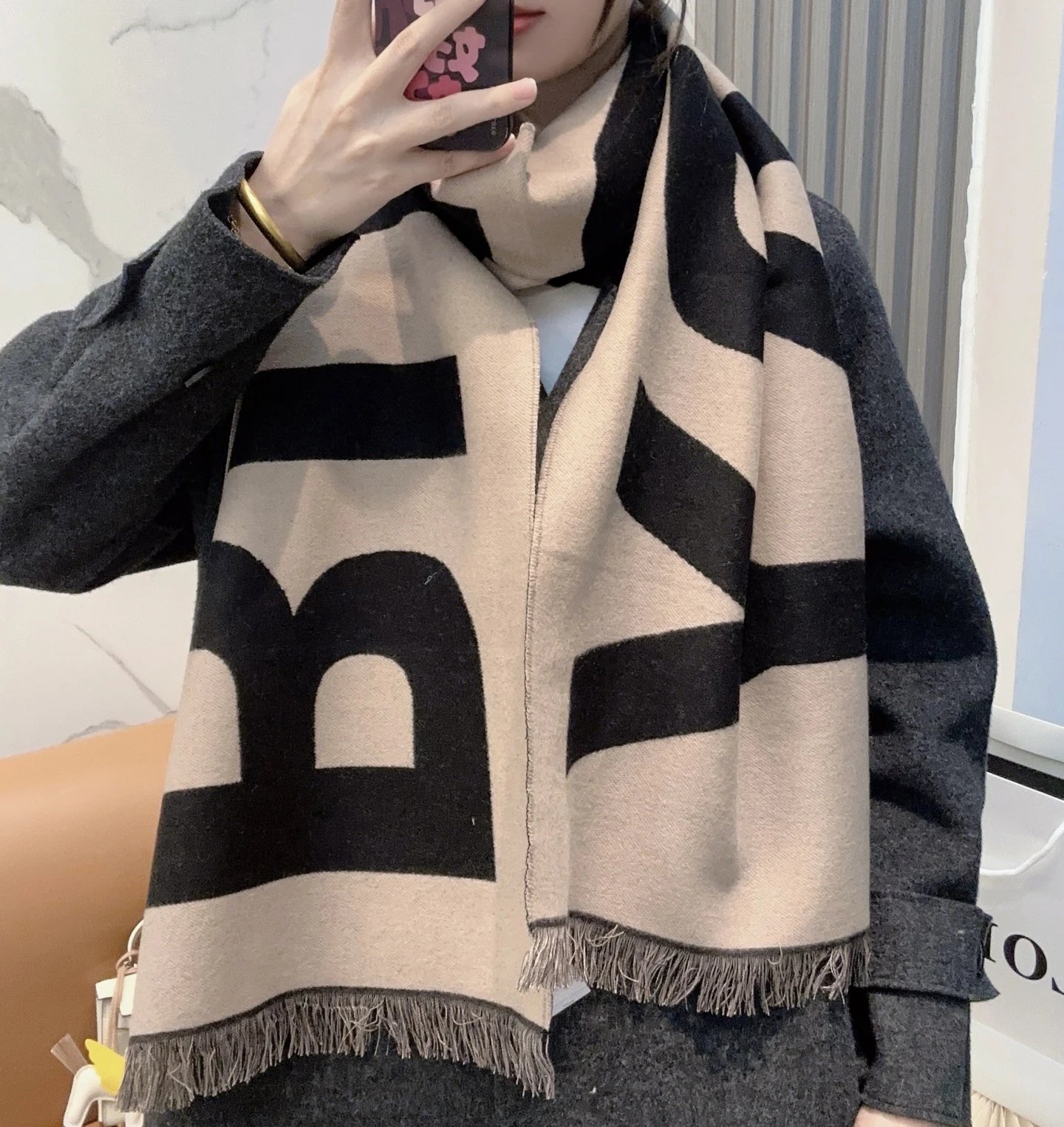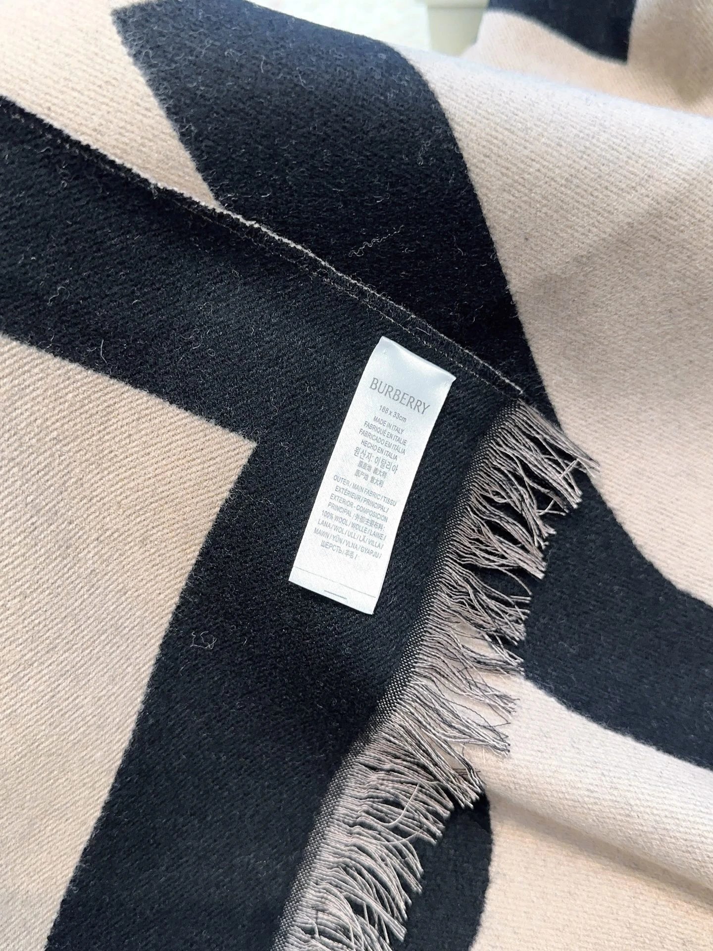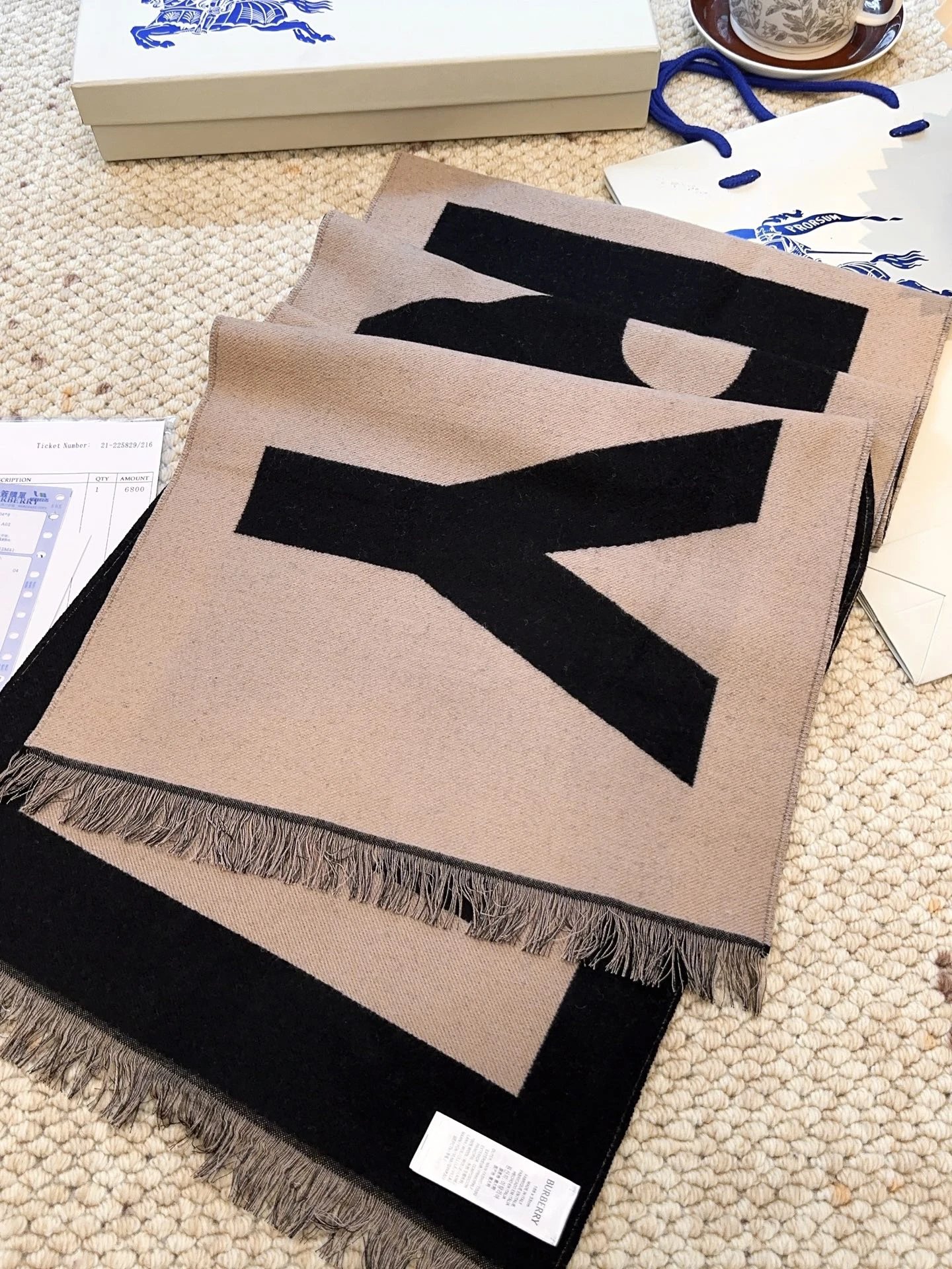 Burberry Double-sided Big Logo Wool Scarf is a popular accessory. Reversible design (2-in-1), soft 100% wool, super warm, classic minimal style. Size:33*188cm, 3 colors available.