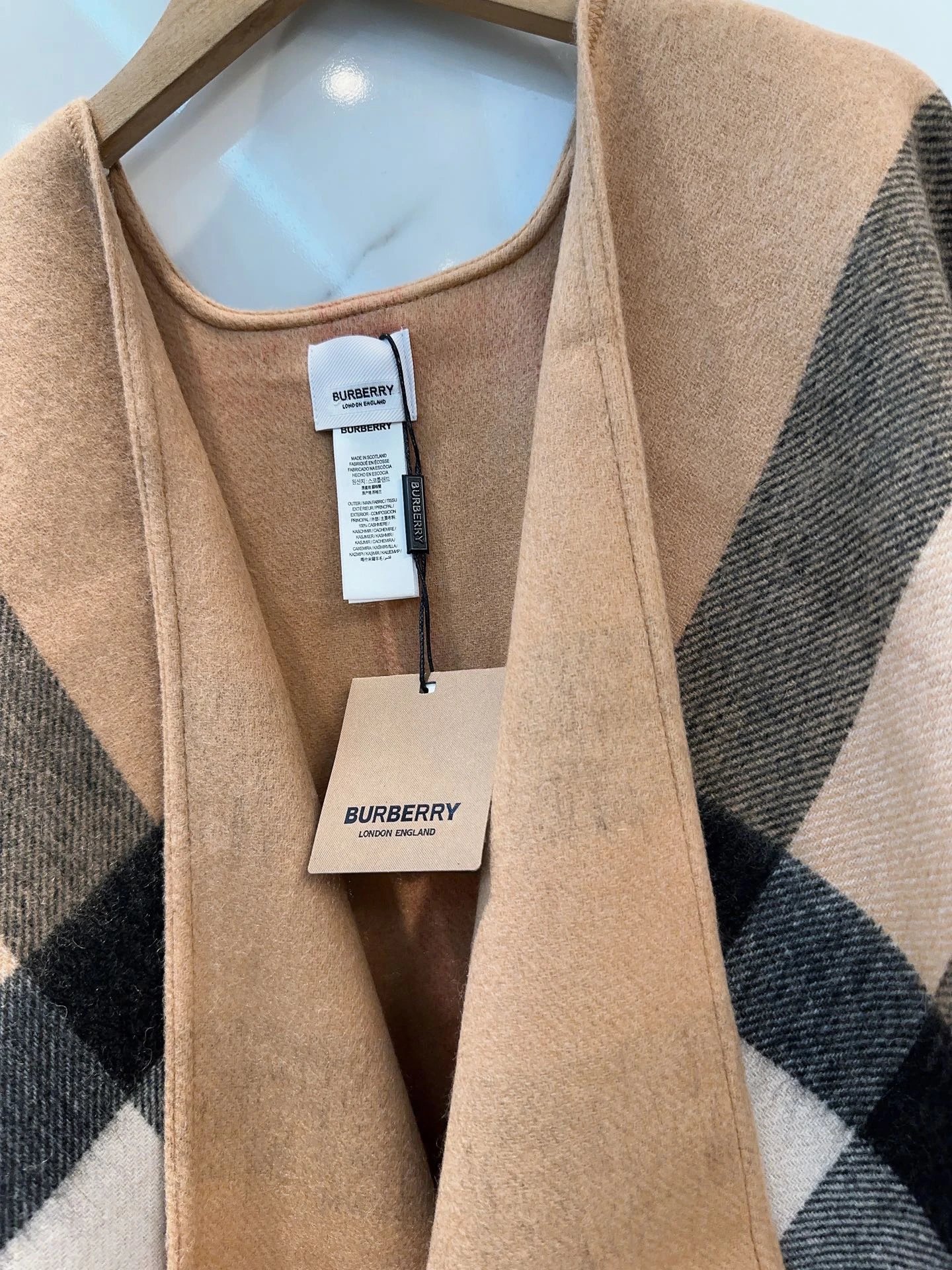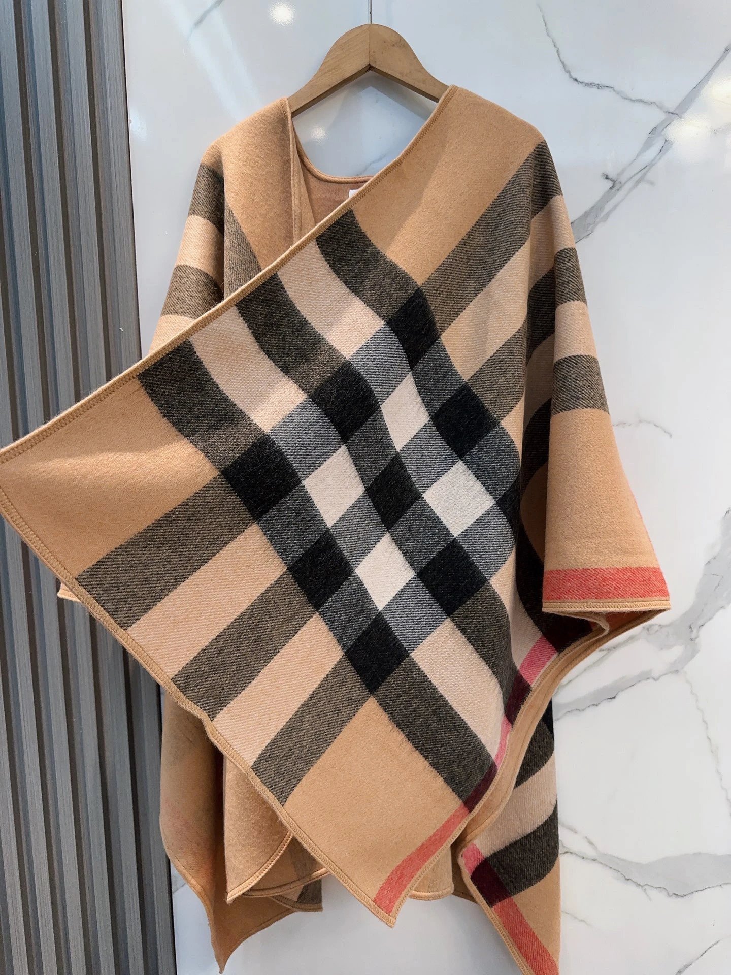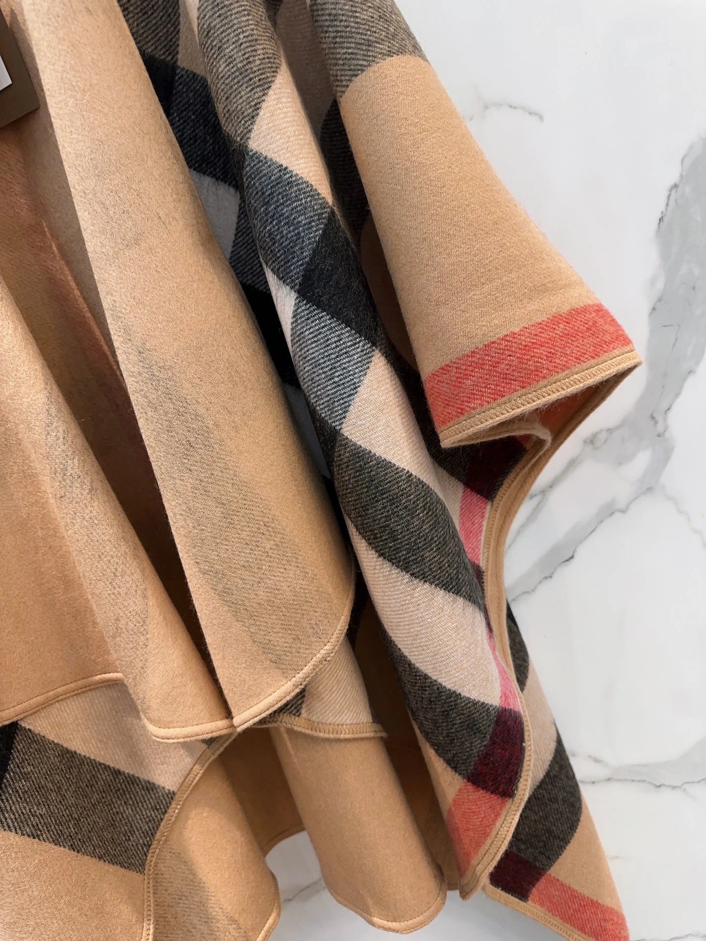 Burberry 100% Cashmere Double-Sided Cape features reversible wear. It’s 140x140 size, with original tags and anti-counterfeit details.