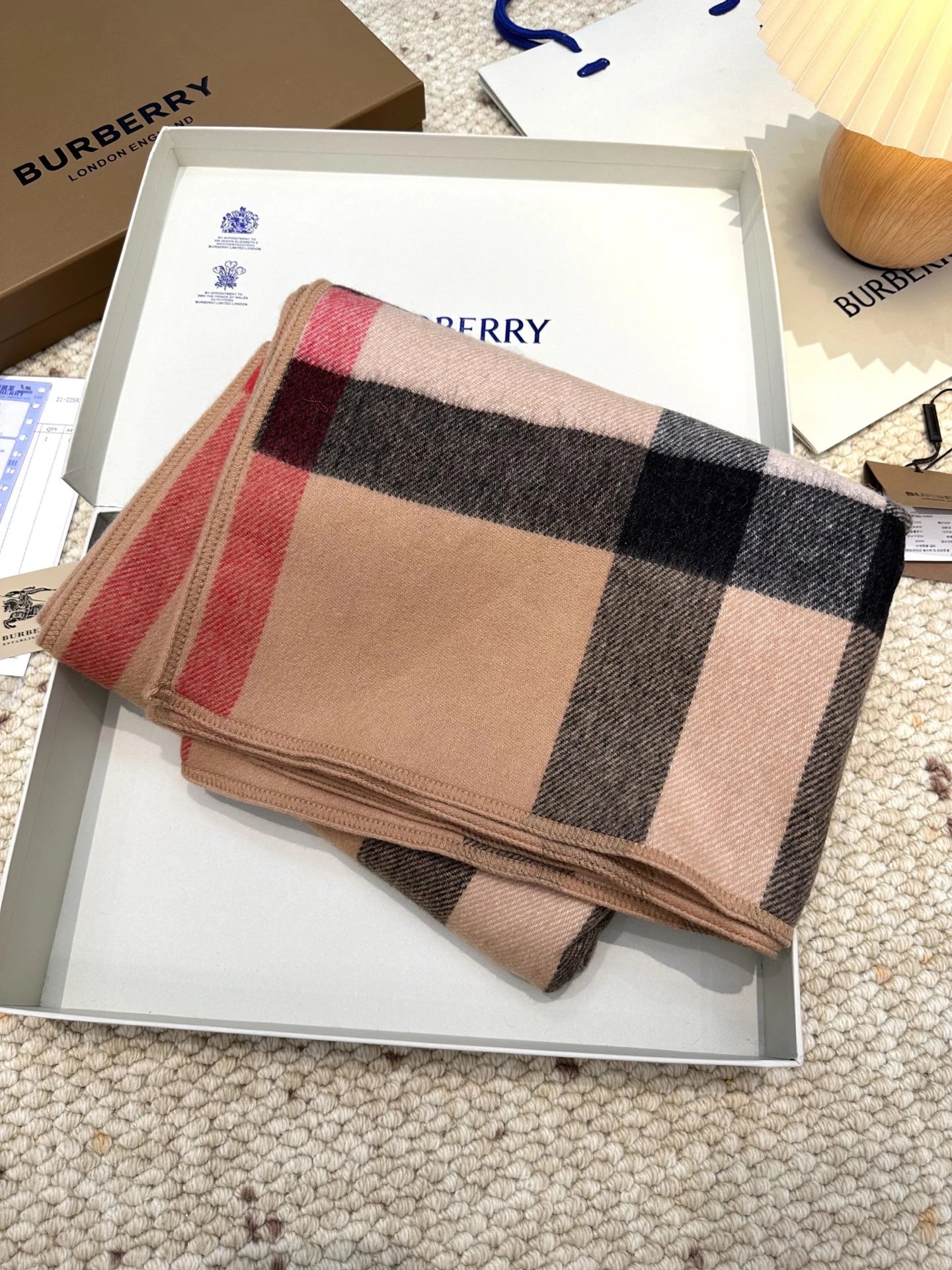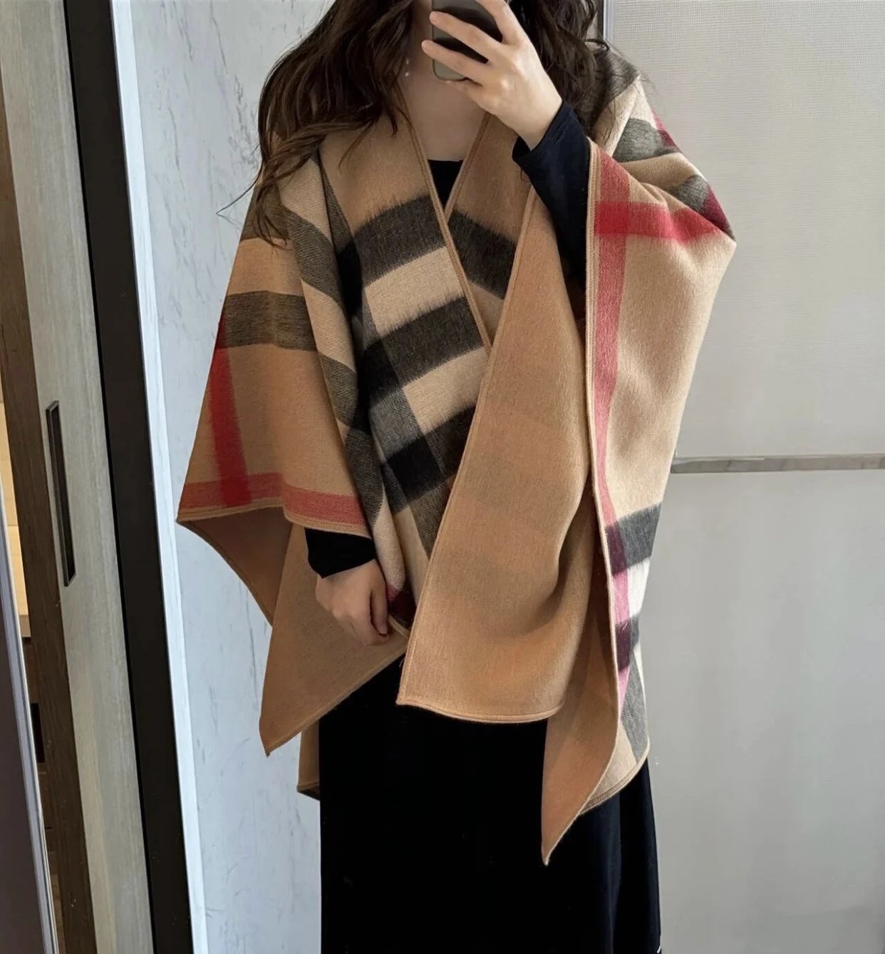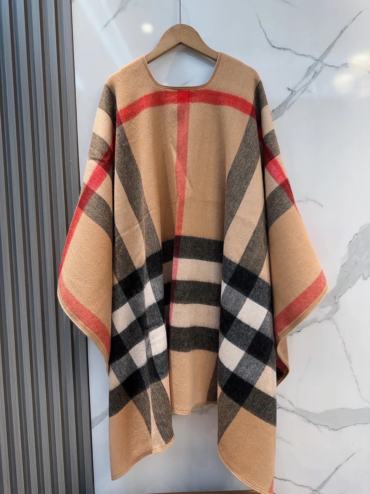 Burberry 100% Cashmere Double-Sided Cape features reversible wear. It’s 140x140 size, with original tags and anti-counterfeit details.