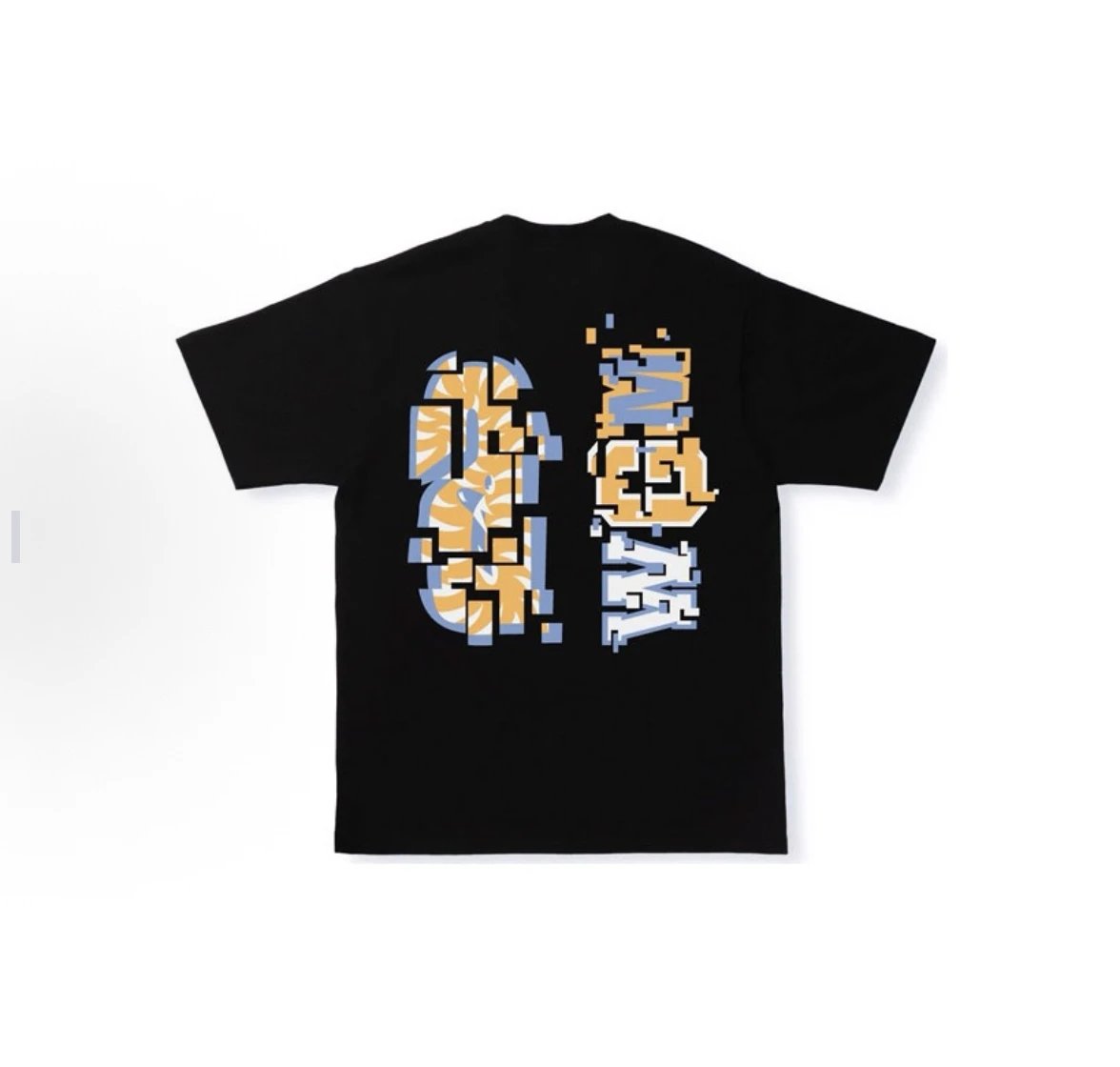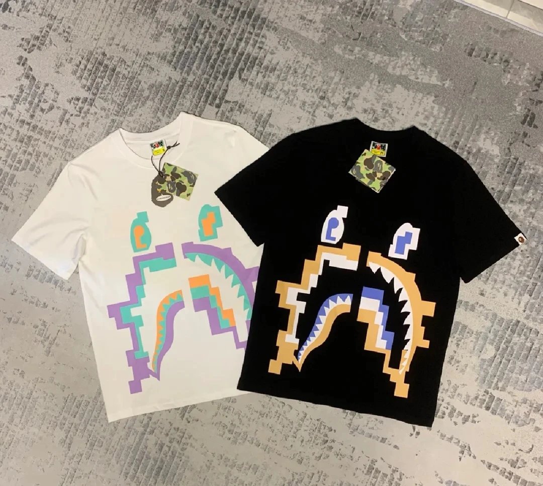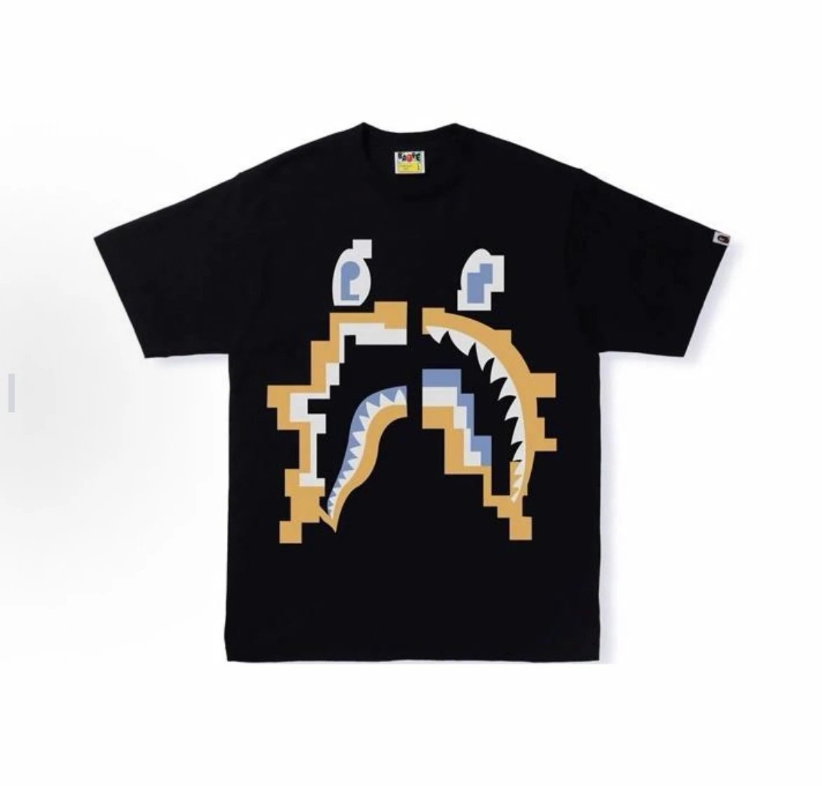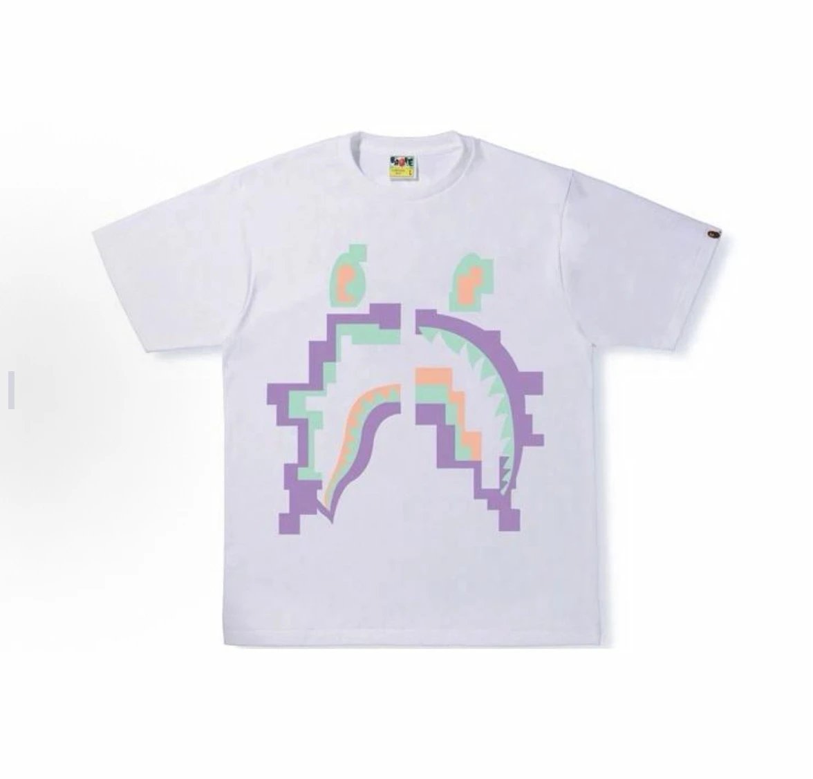 BAPE 00191 Digital Shark Tee has digital shark print, crew neck, short sleeves, unisex fit. Available in Black & White, sizes S/M/L/XL/XXL.