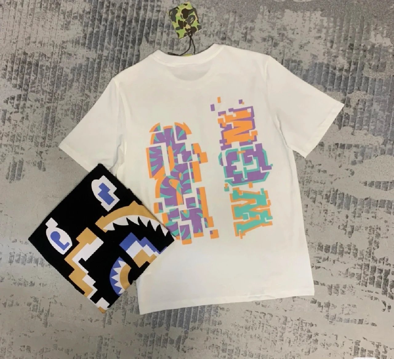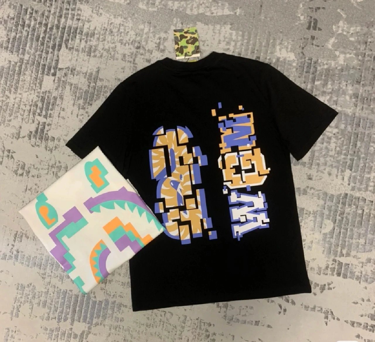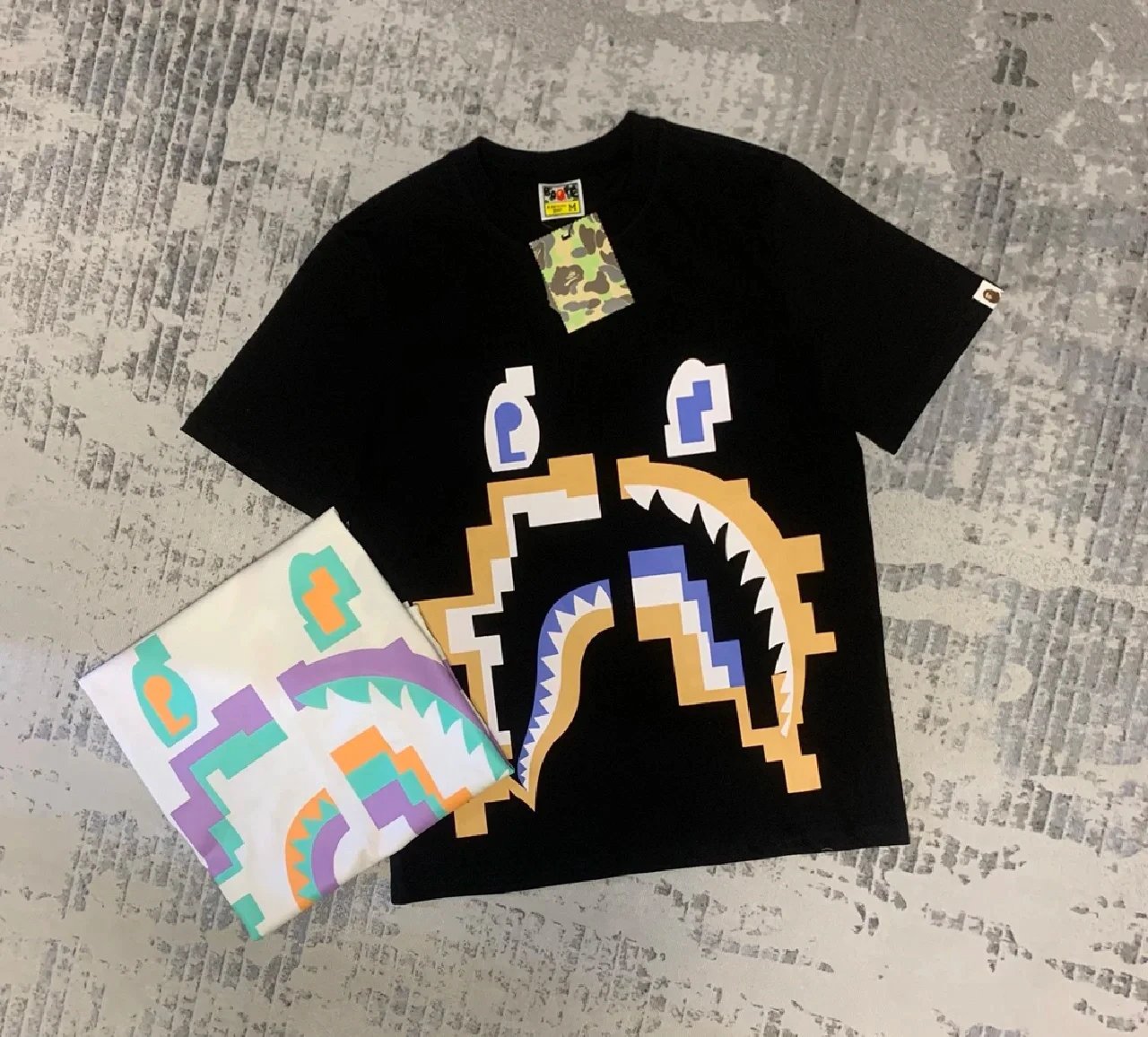 BAPE 00191 Digital Shark Tee has digital shark print, crew neck, short sleeves, unisex fit. Available in Black & White, sizes S/M/L/XL/XXL.