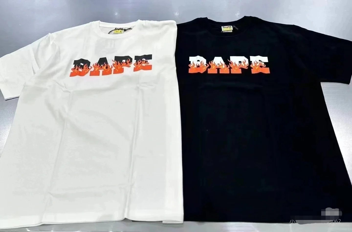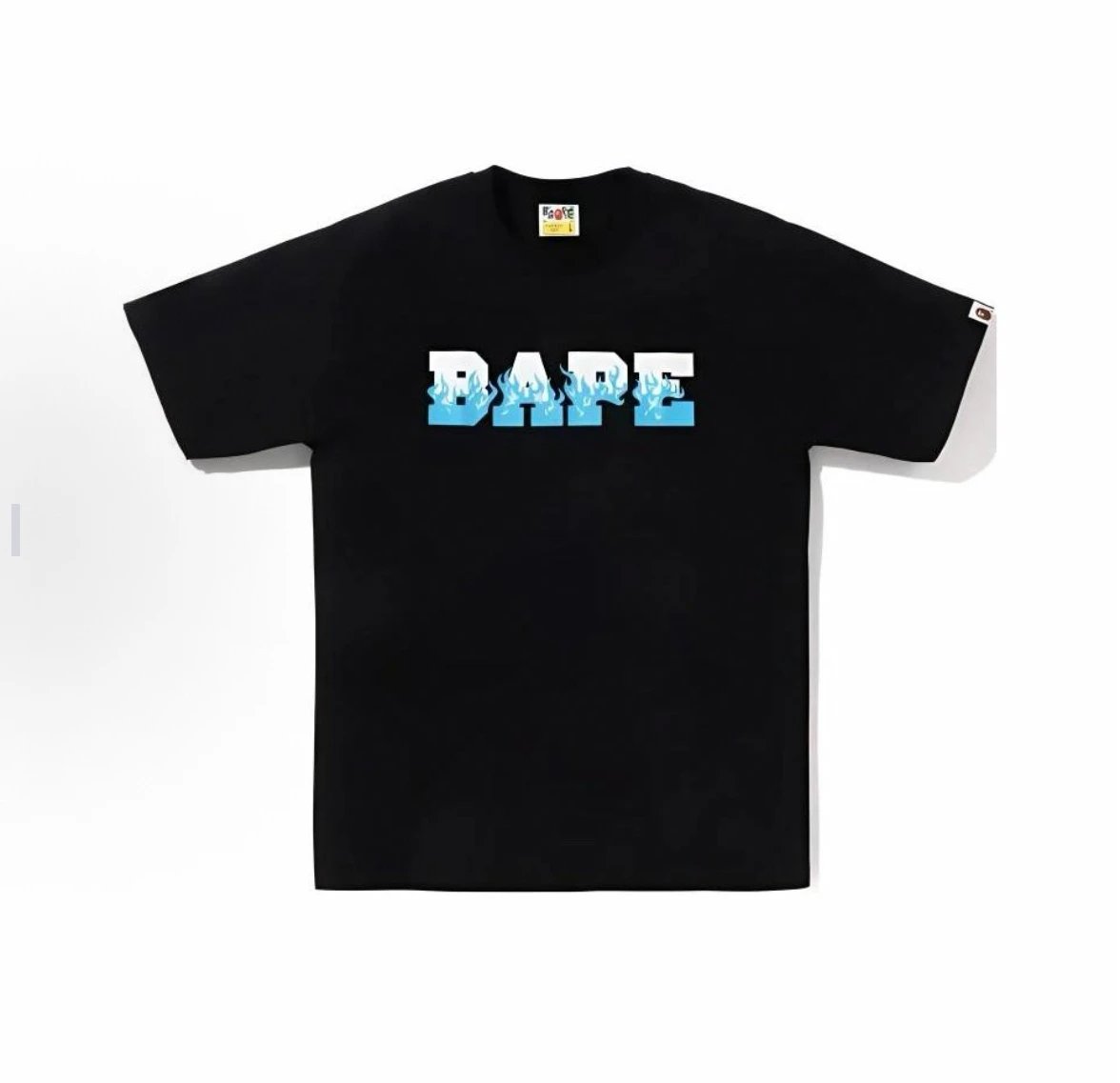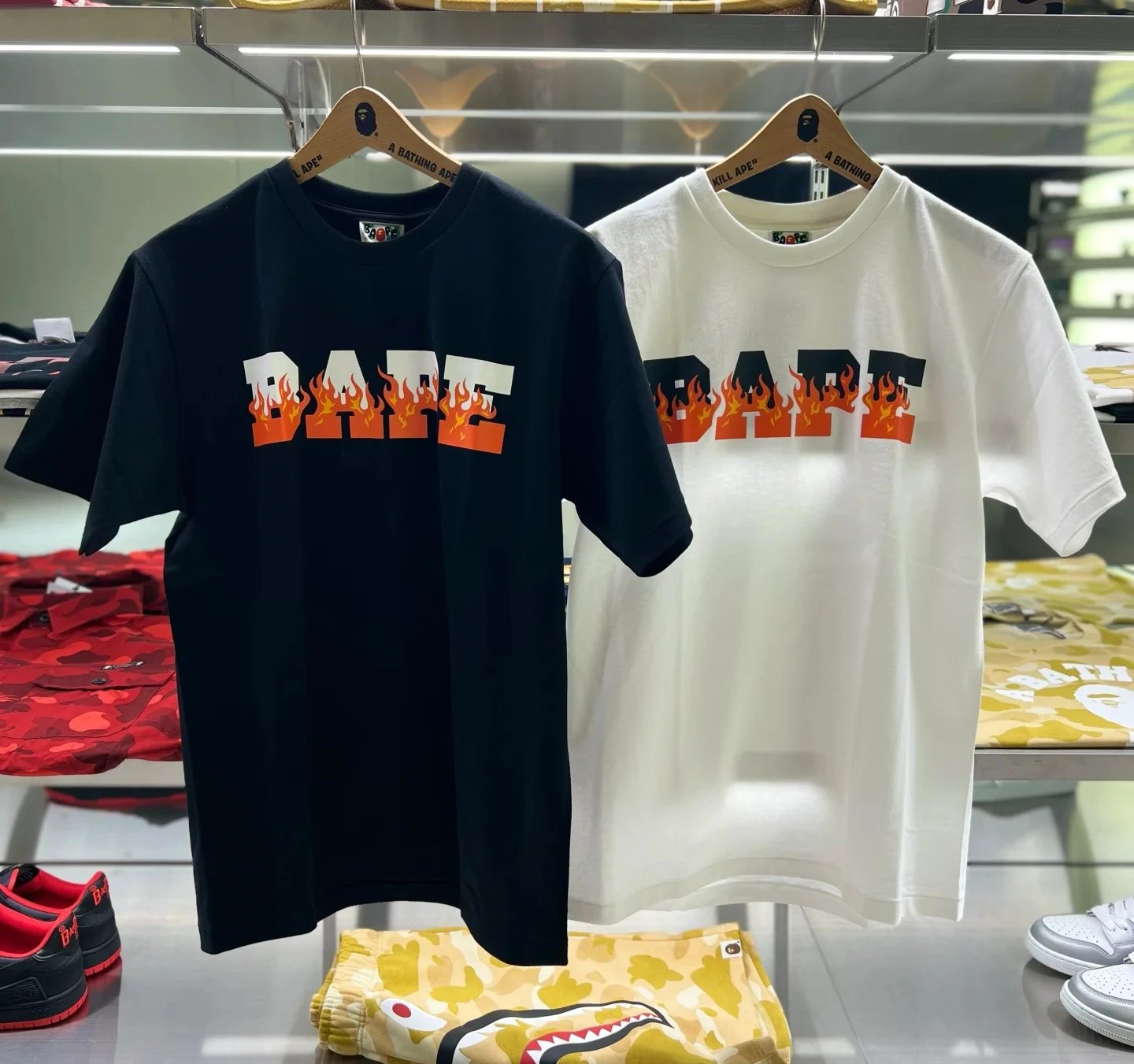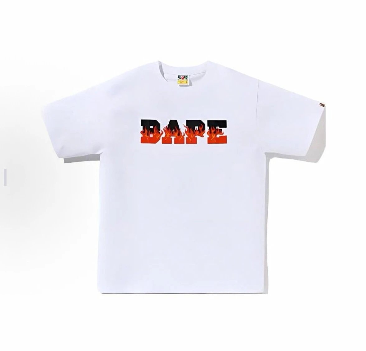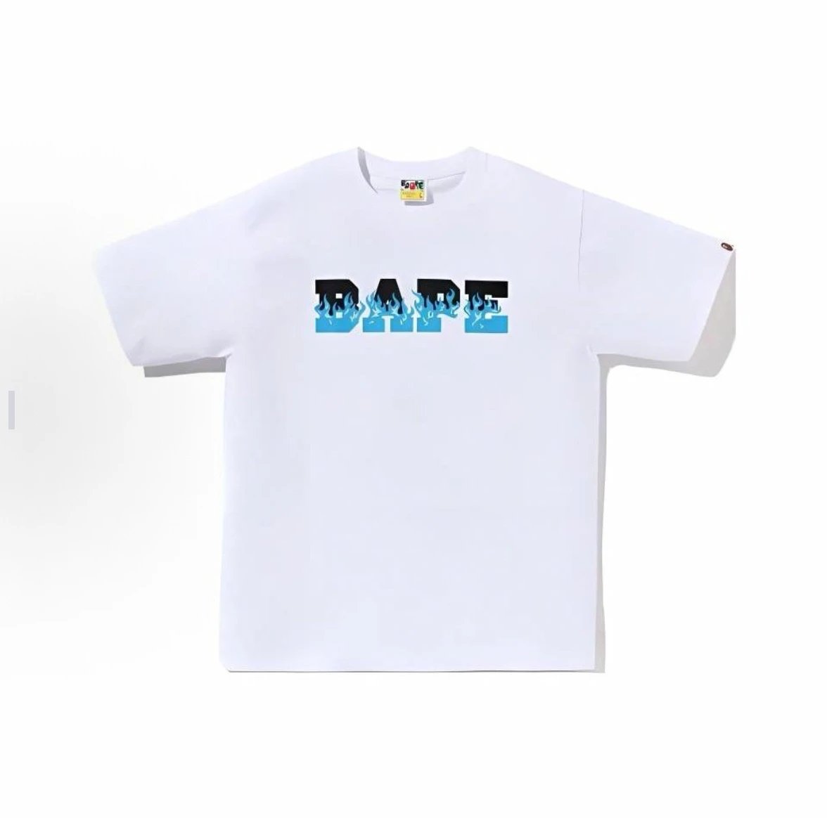 A BATHING APE 00197 SS24 collection offers unisex crew neck short sleeve T-shirts with flame letter print design.