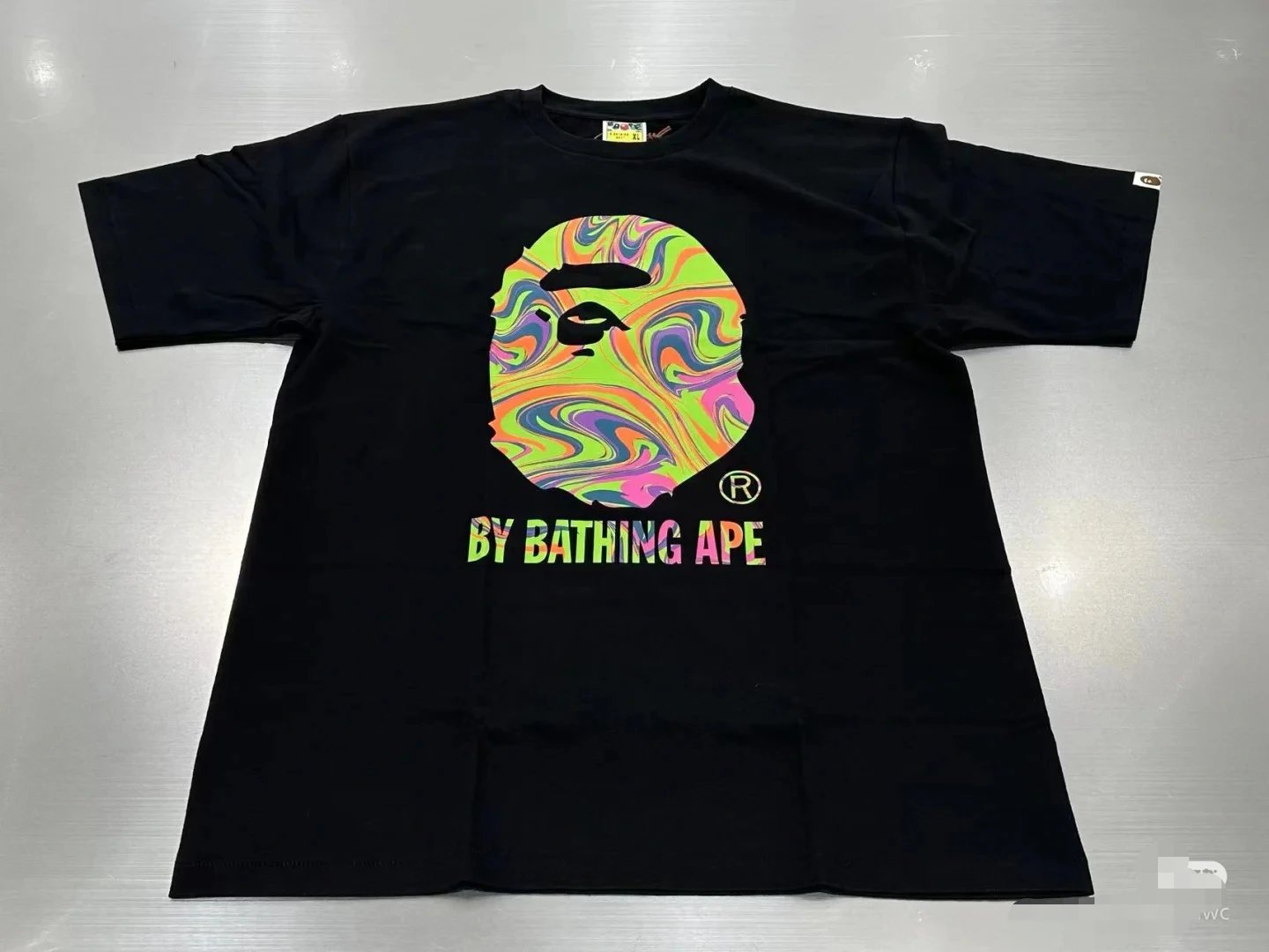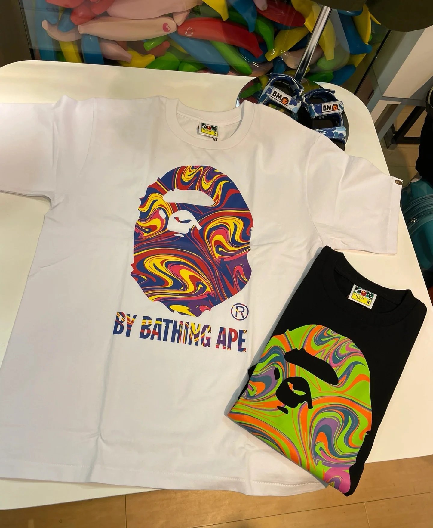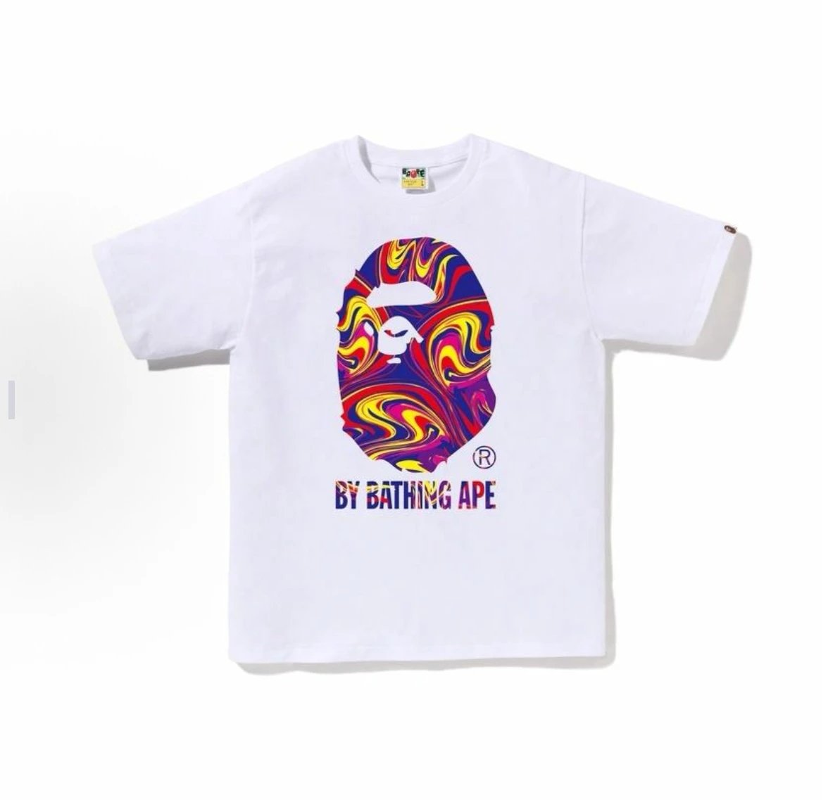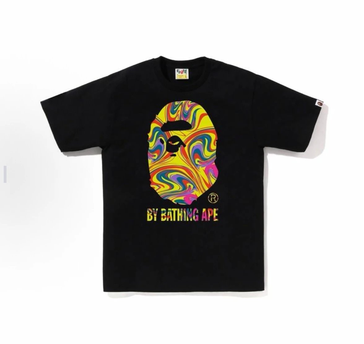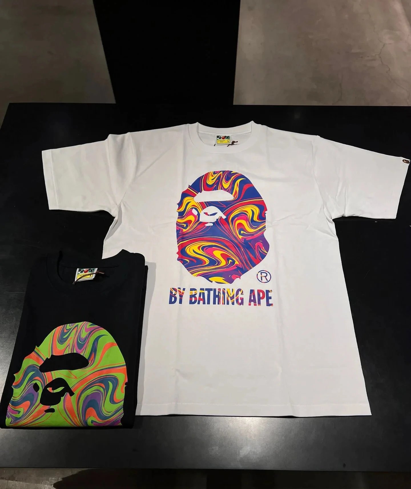 A BATHING APE FW23 00152 Marble Camo Ape Head Crew Neck T-Shirt is unisex, available in Black & White, sizes S/M/L/XL/2XL.