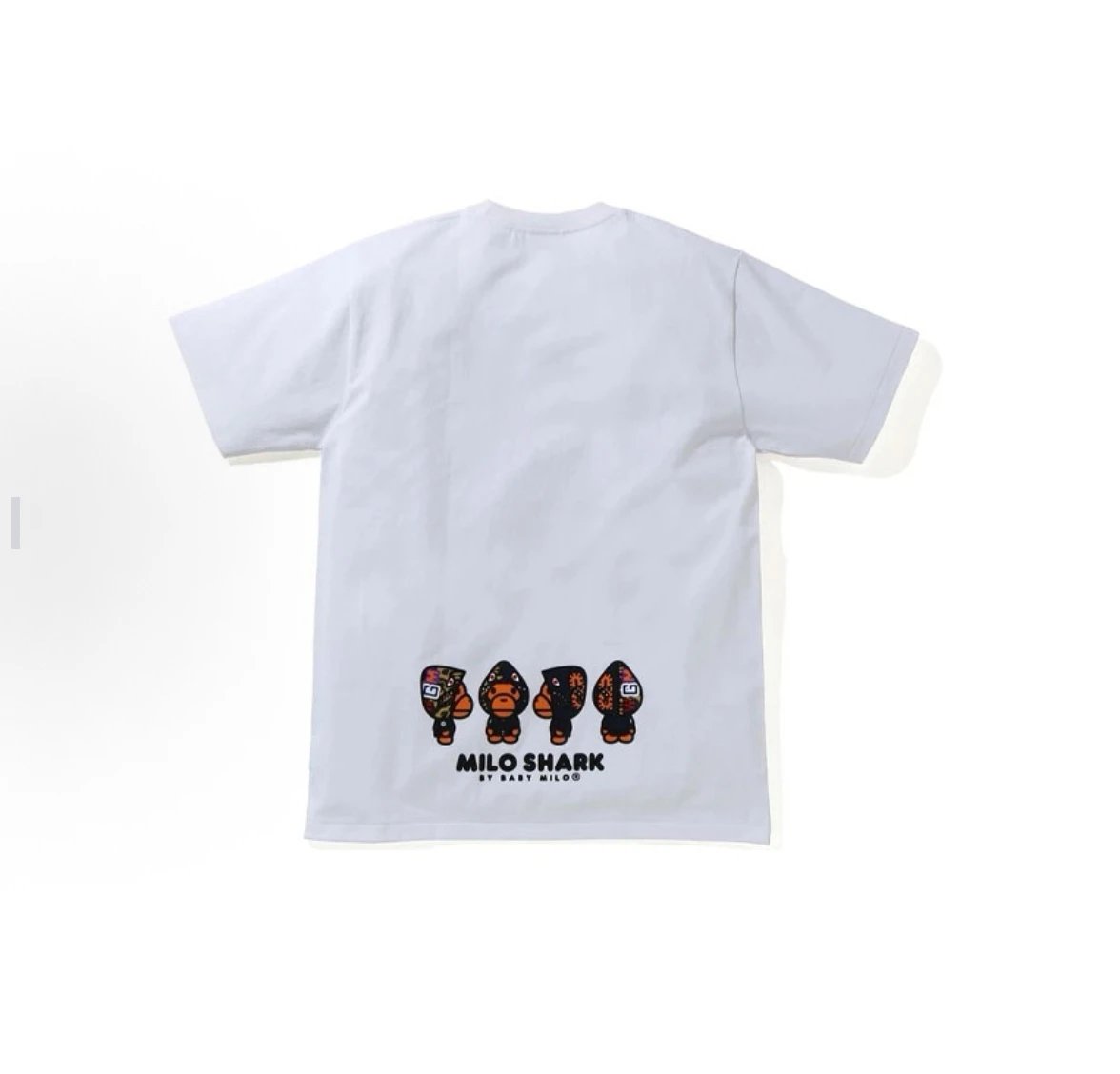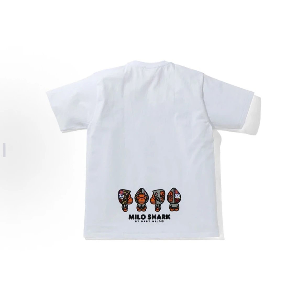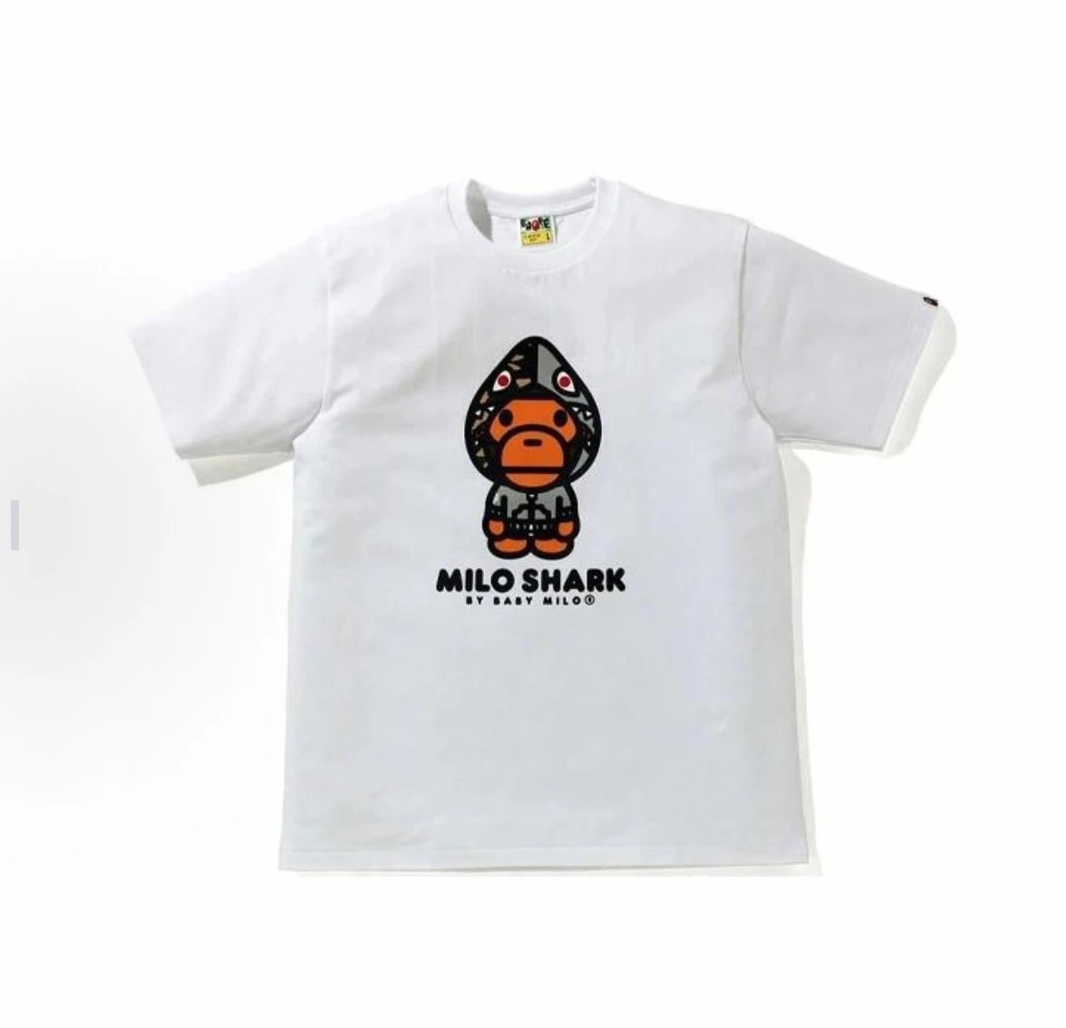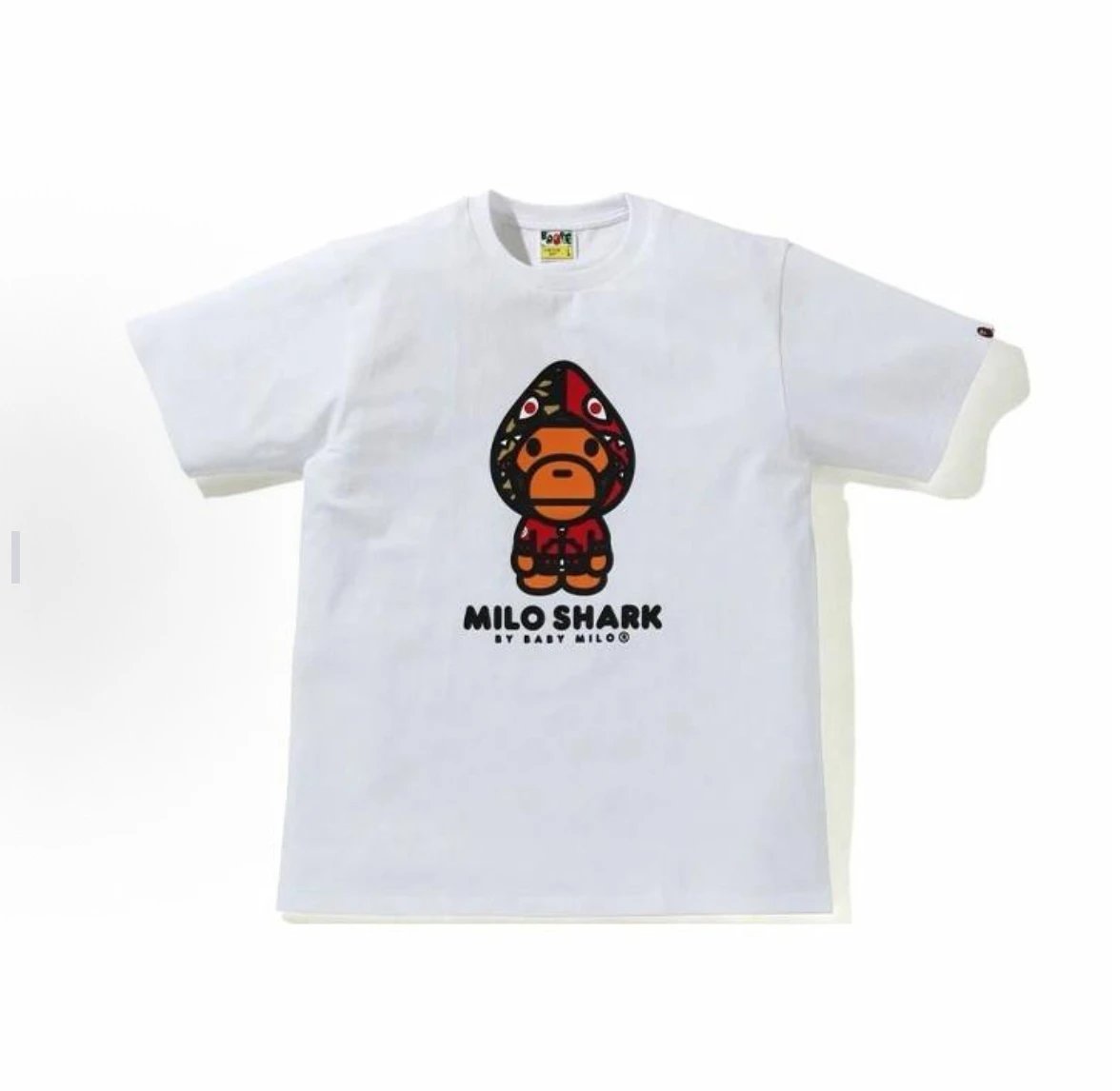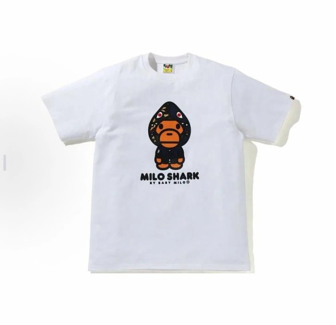 A BATHING APE 00150 Milo Shark Cap Print Unisex T-Shirts have a trendy shark cap print design.