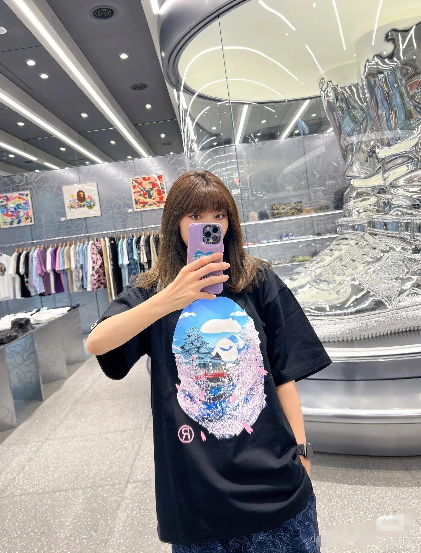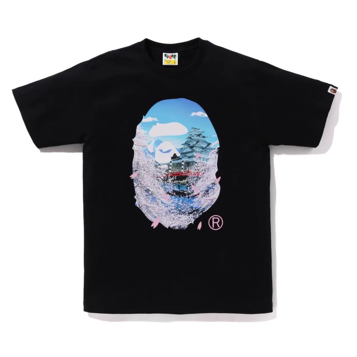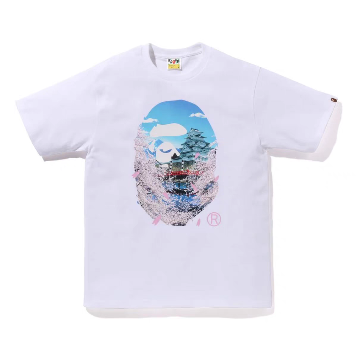 A BATHING APE 00120 SS23 Sakura T-Shirt features cherry blossom print, crew neck, loose fit, unisex design.