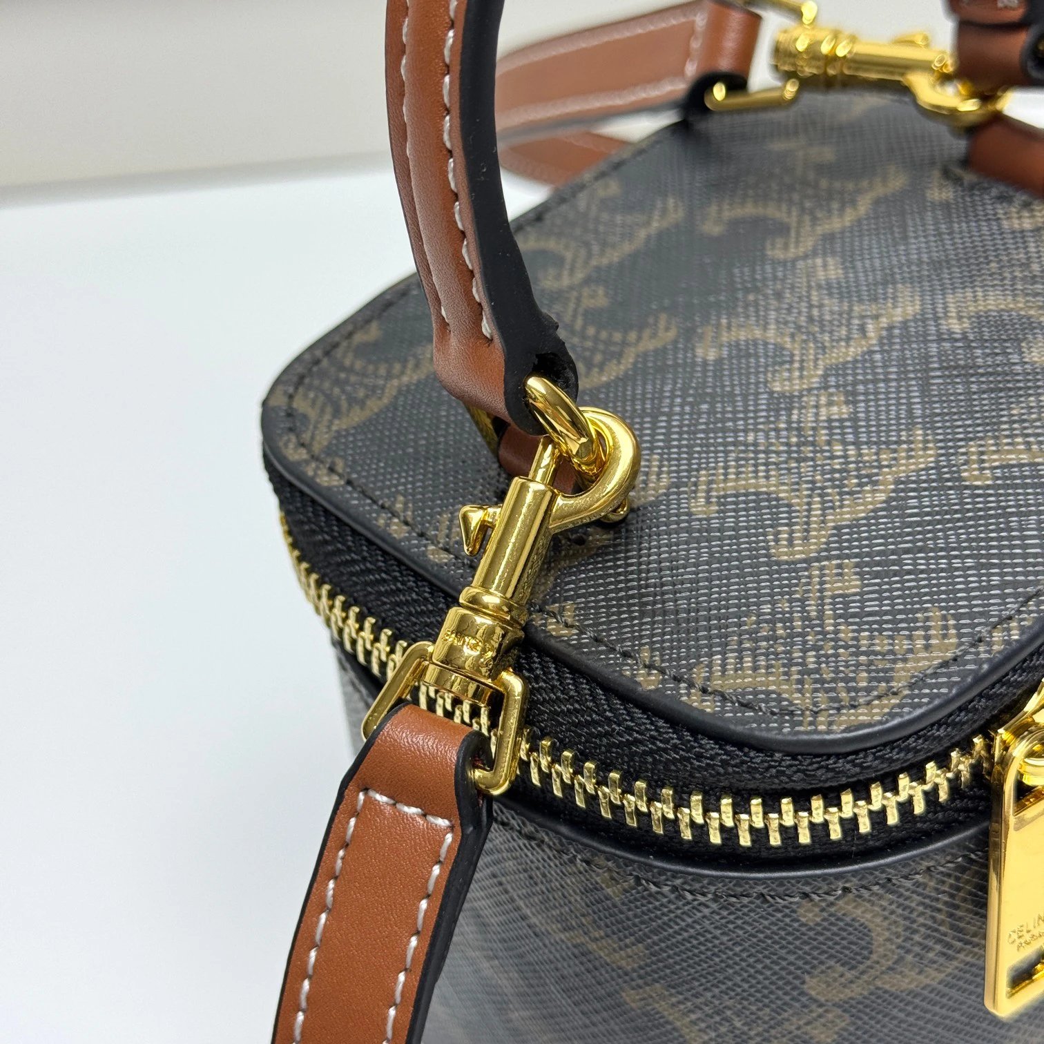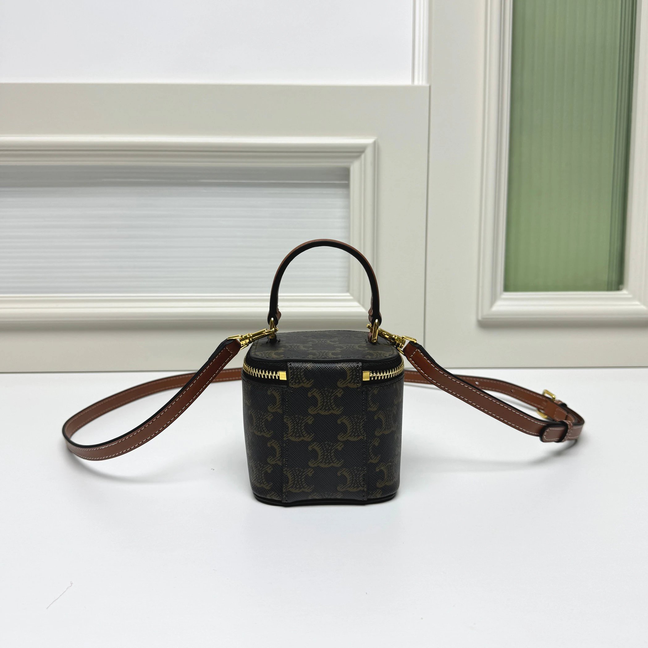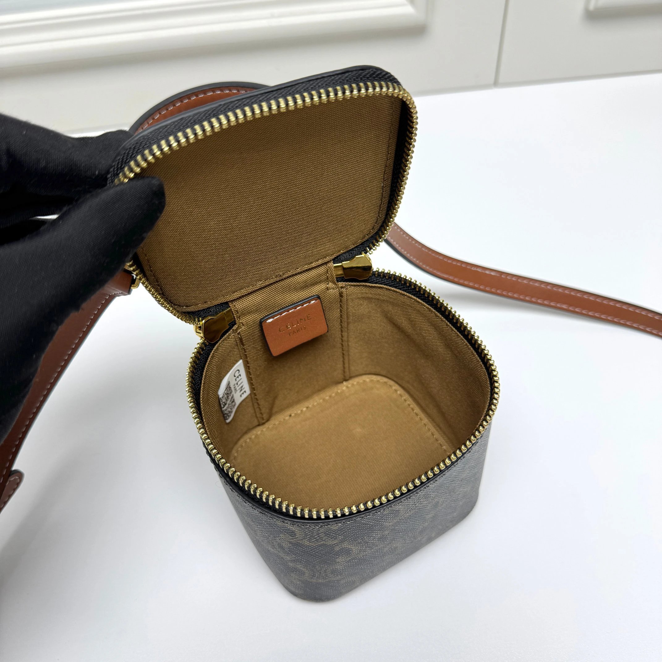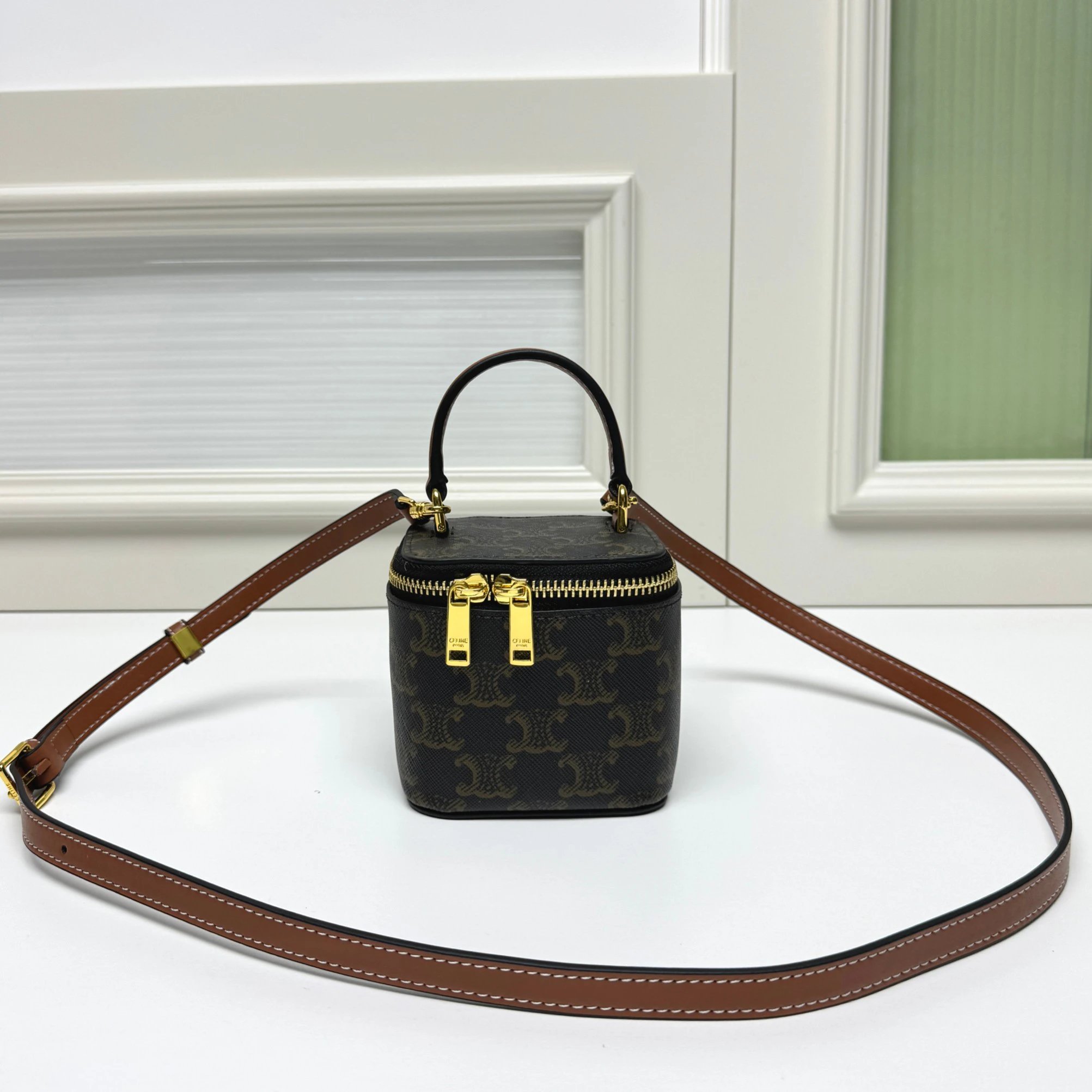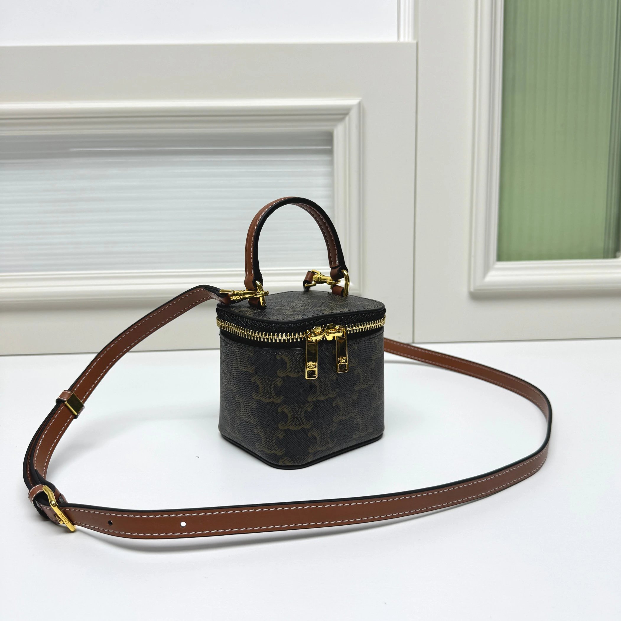 CELINE's new BOXTRIOMPHE bag has an iconic Triomphe logo lock, unique retro box shape—great for evenings. Fits powder, lipstick & car keys (no phone).