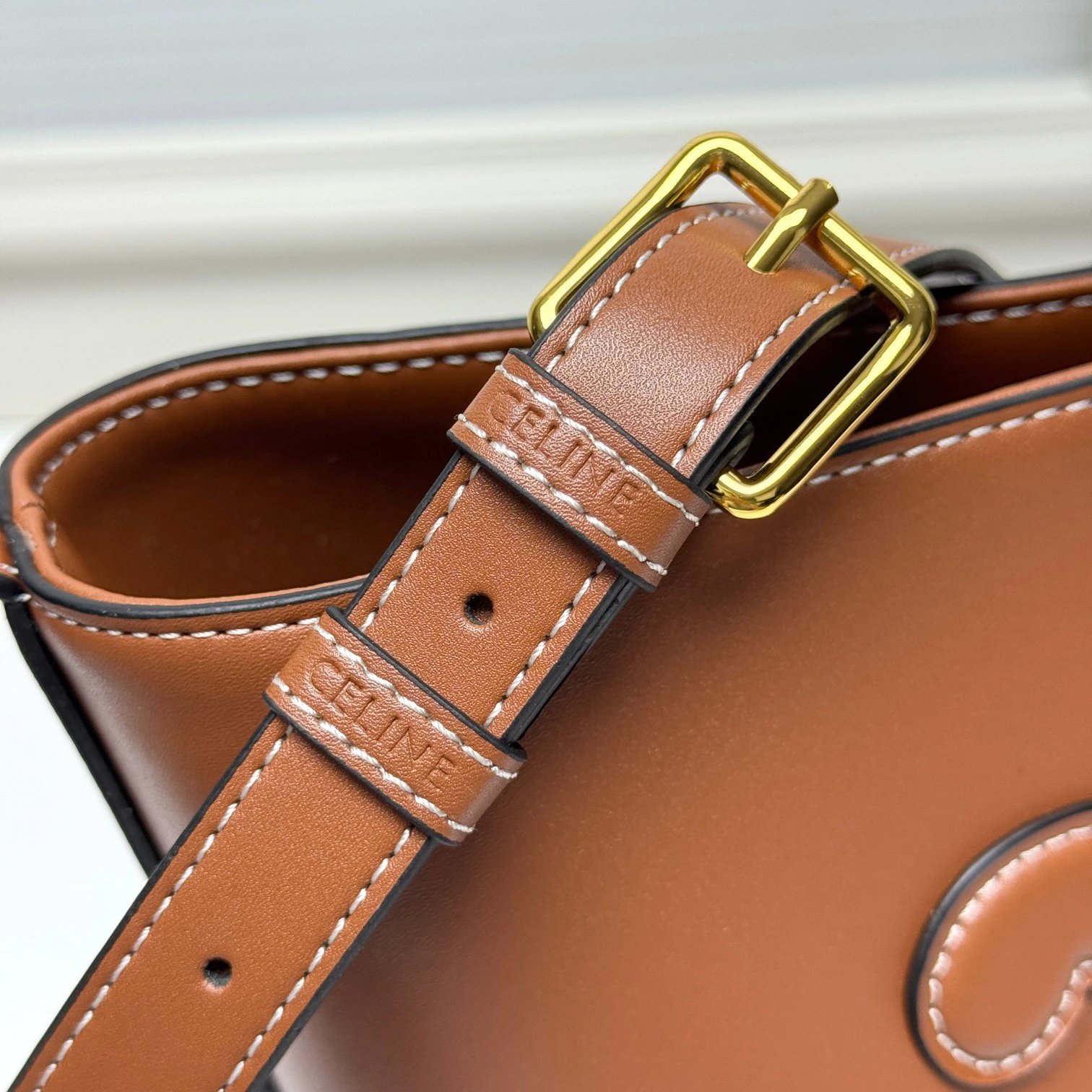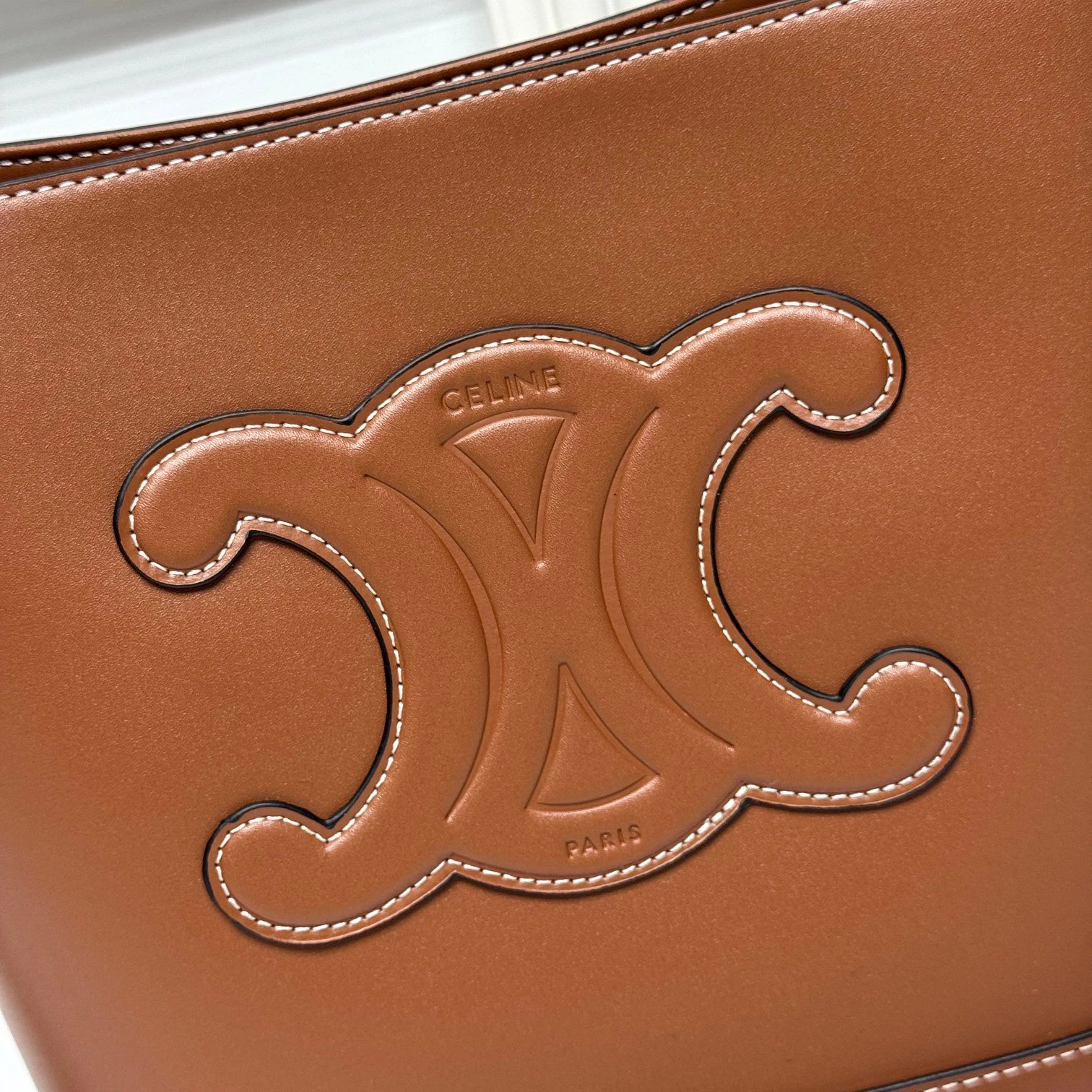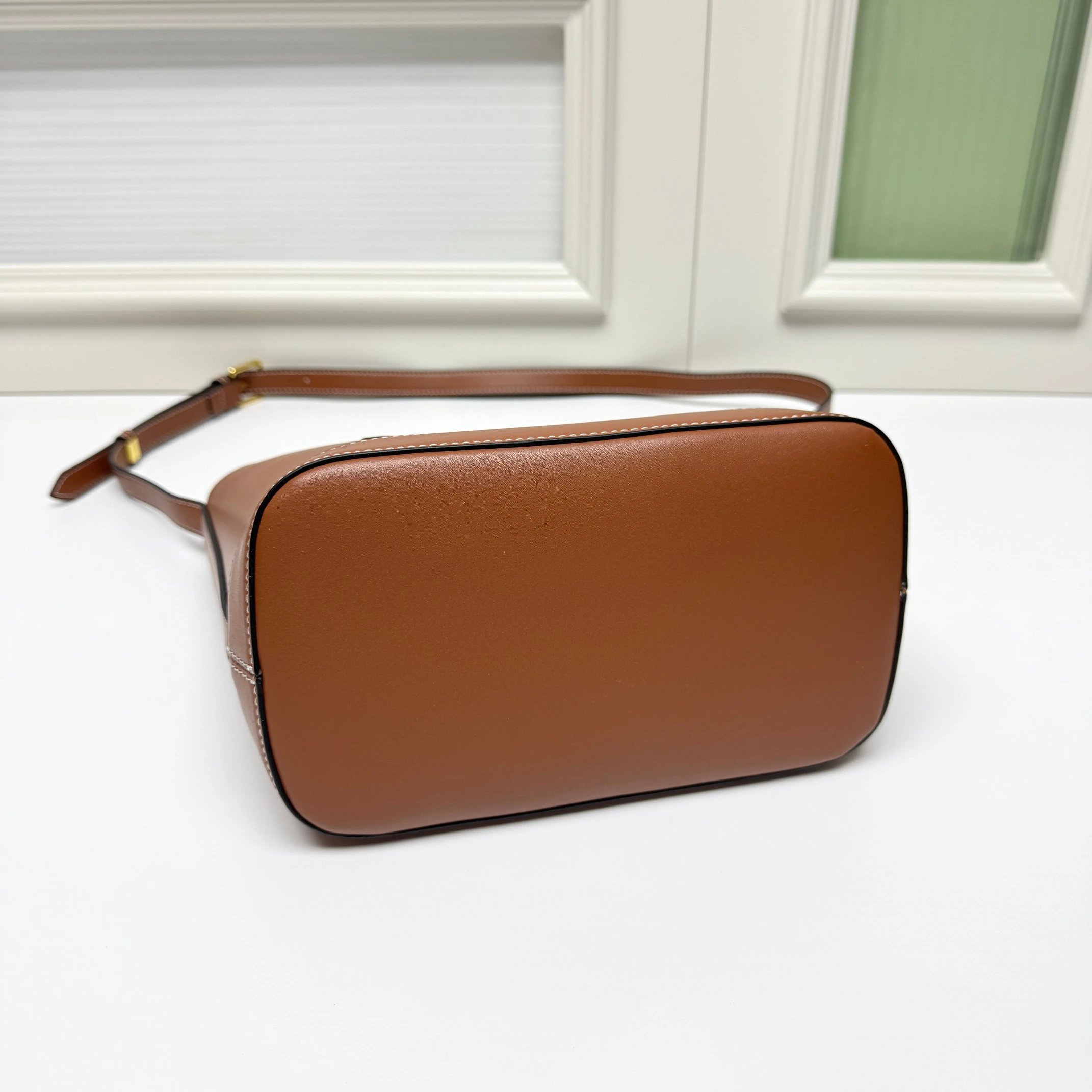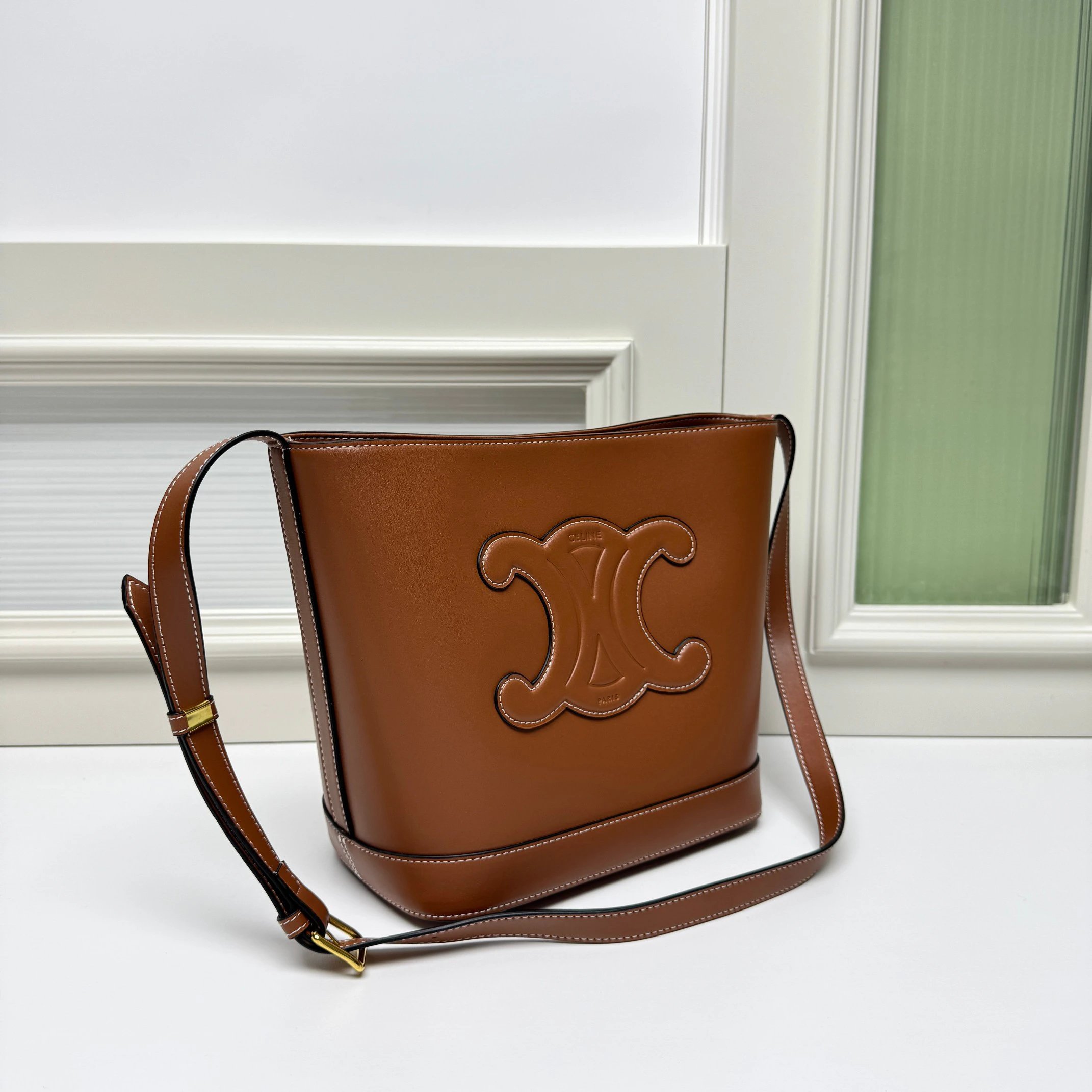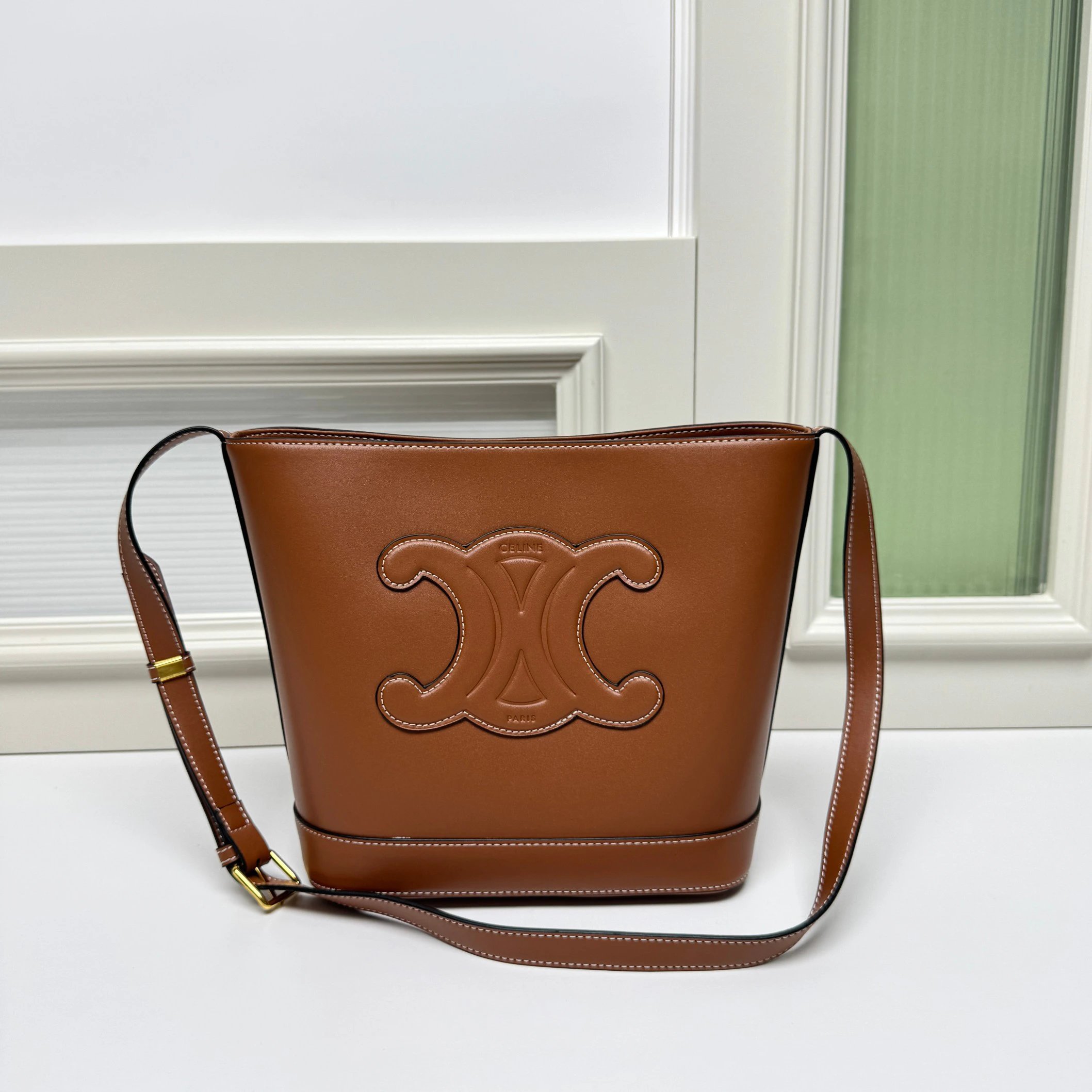 CELINE 2022 Spring Summer CUIR Bucket Bag features a 3D Triomphe logo for elegance.