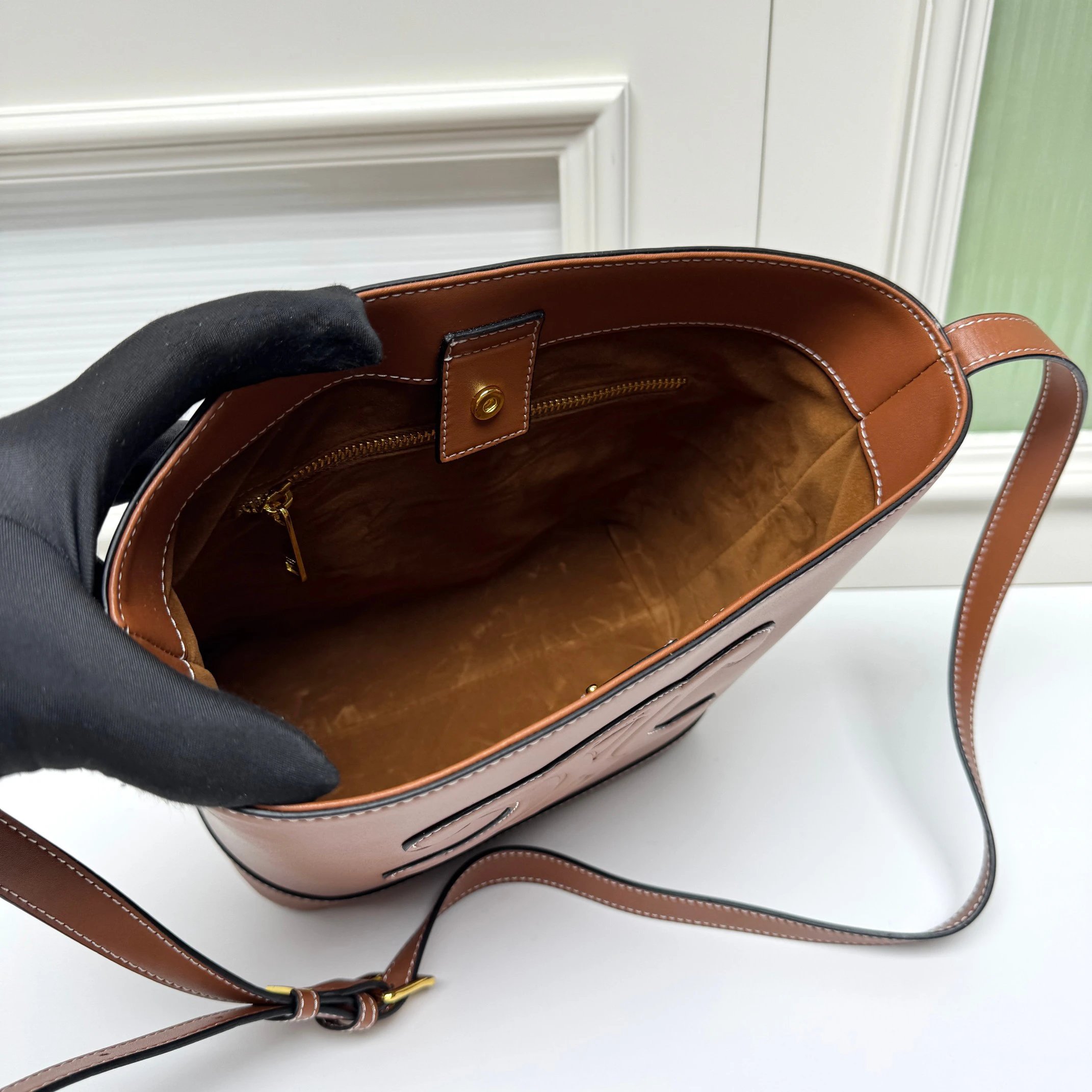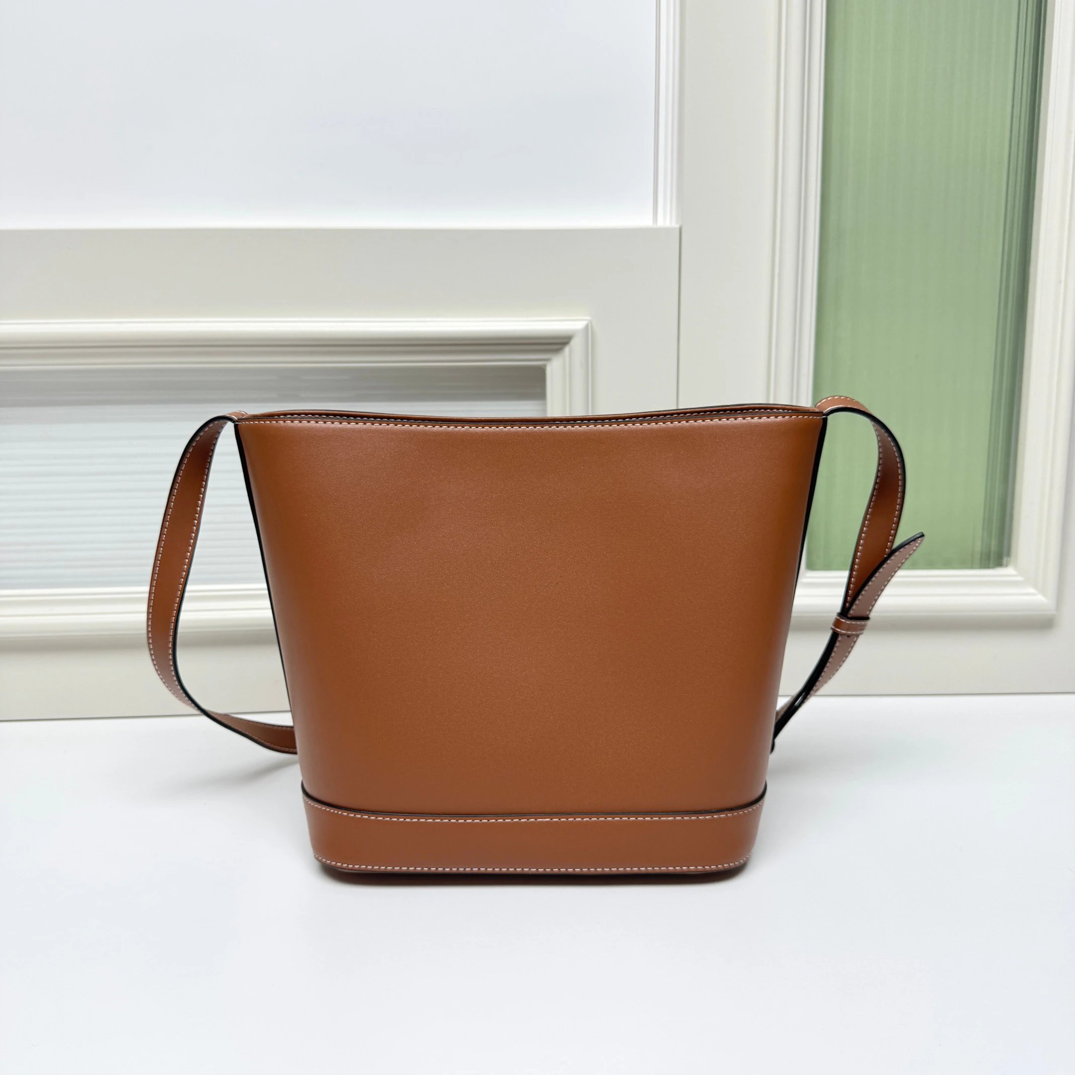 Cowhide leather, lightweight, adjustable strap (crossbody/shoulder), inner buckle closure.