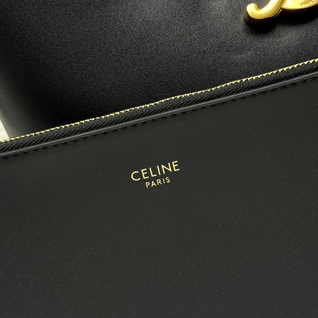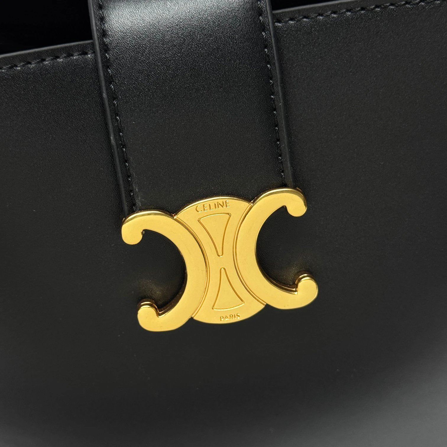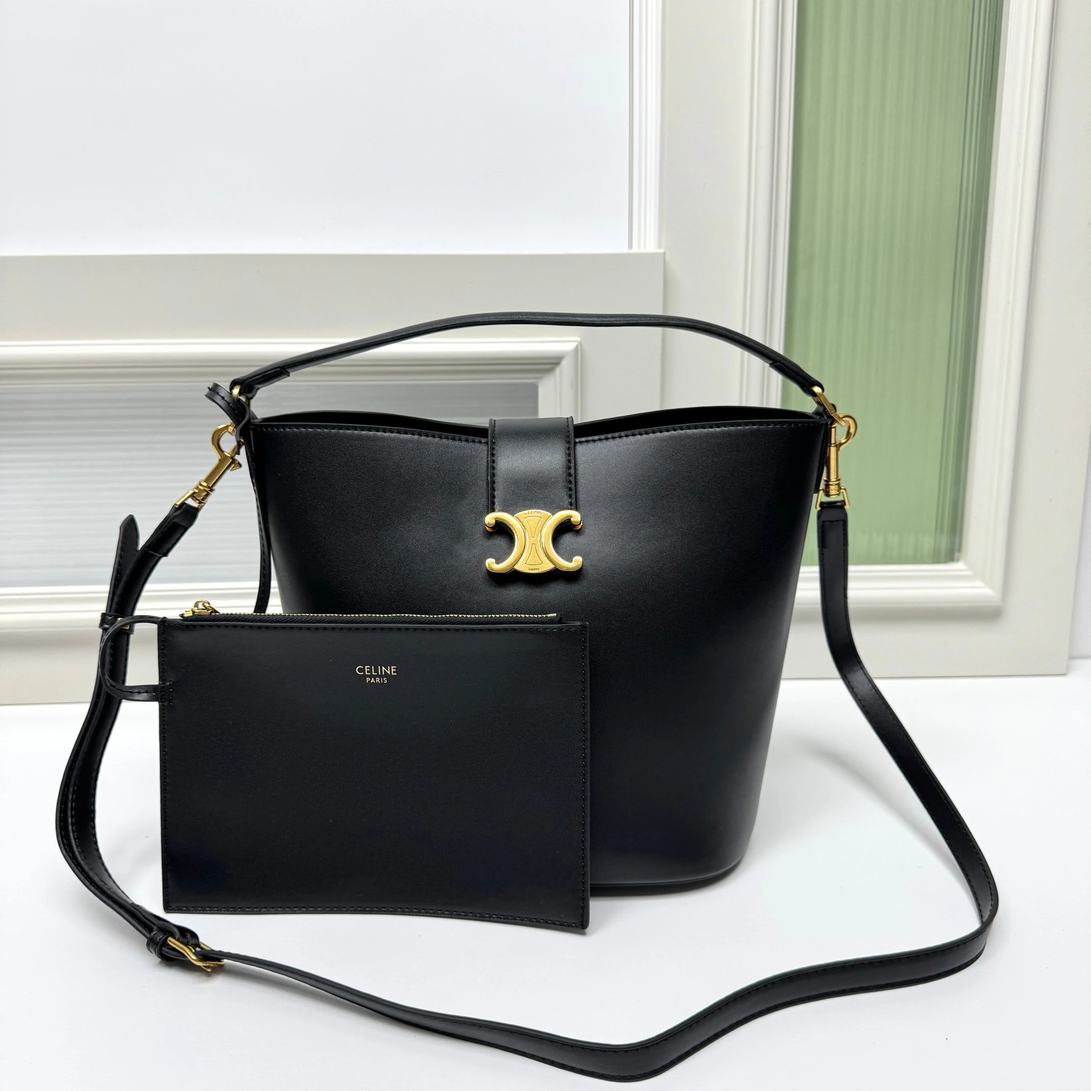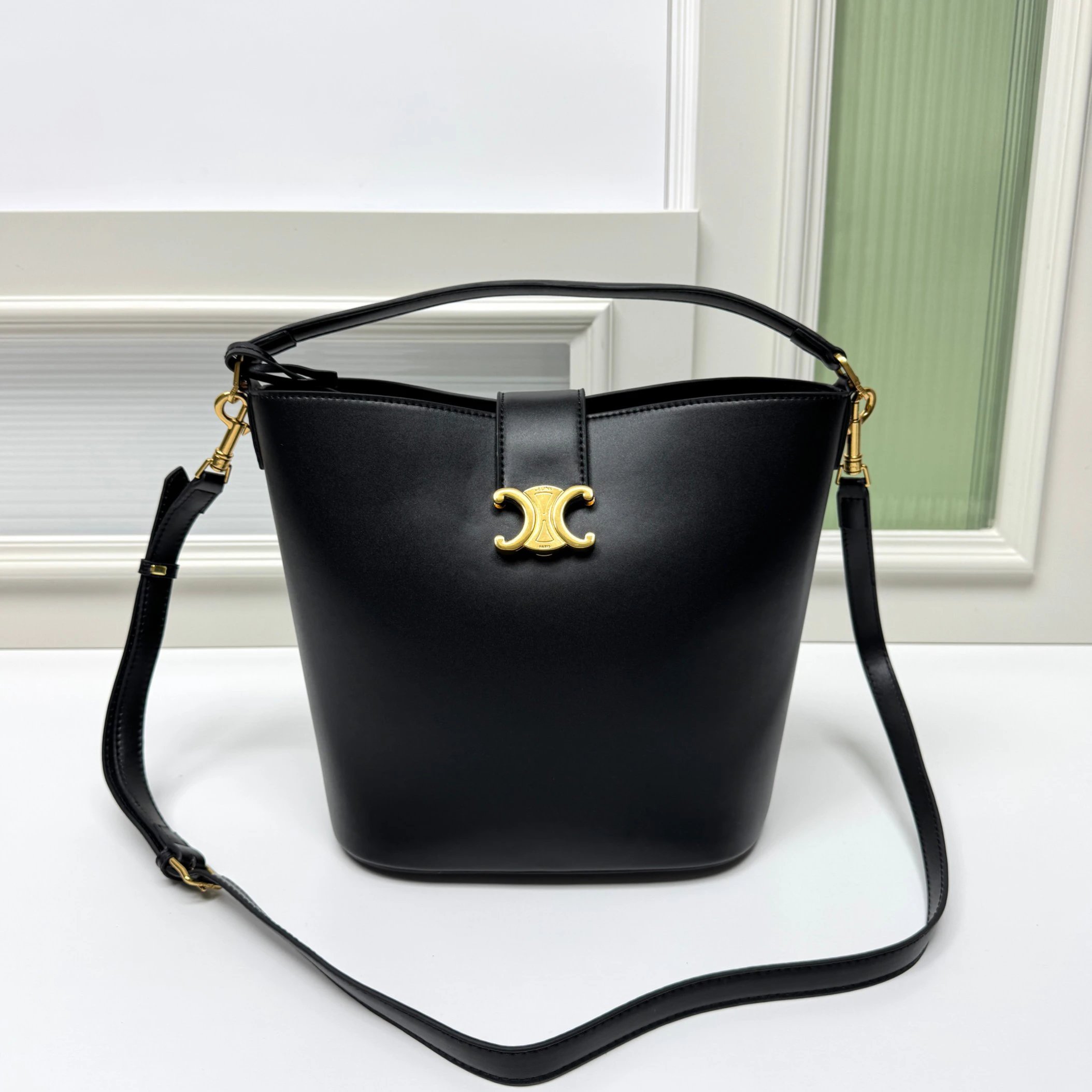 CELINE Louise bucket bag is crafted from glossy fine calfskin, featuring a sleek silhouette with a shiny gold Triomphe logo.