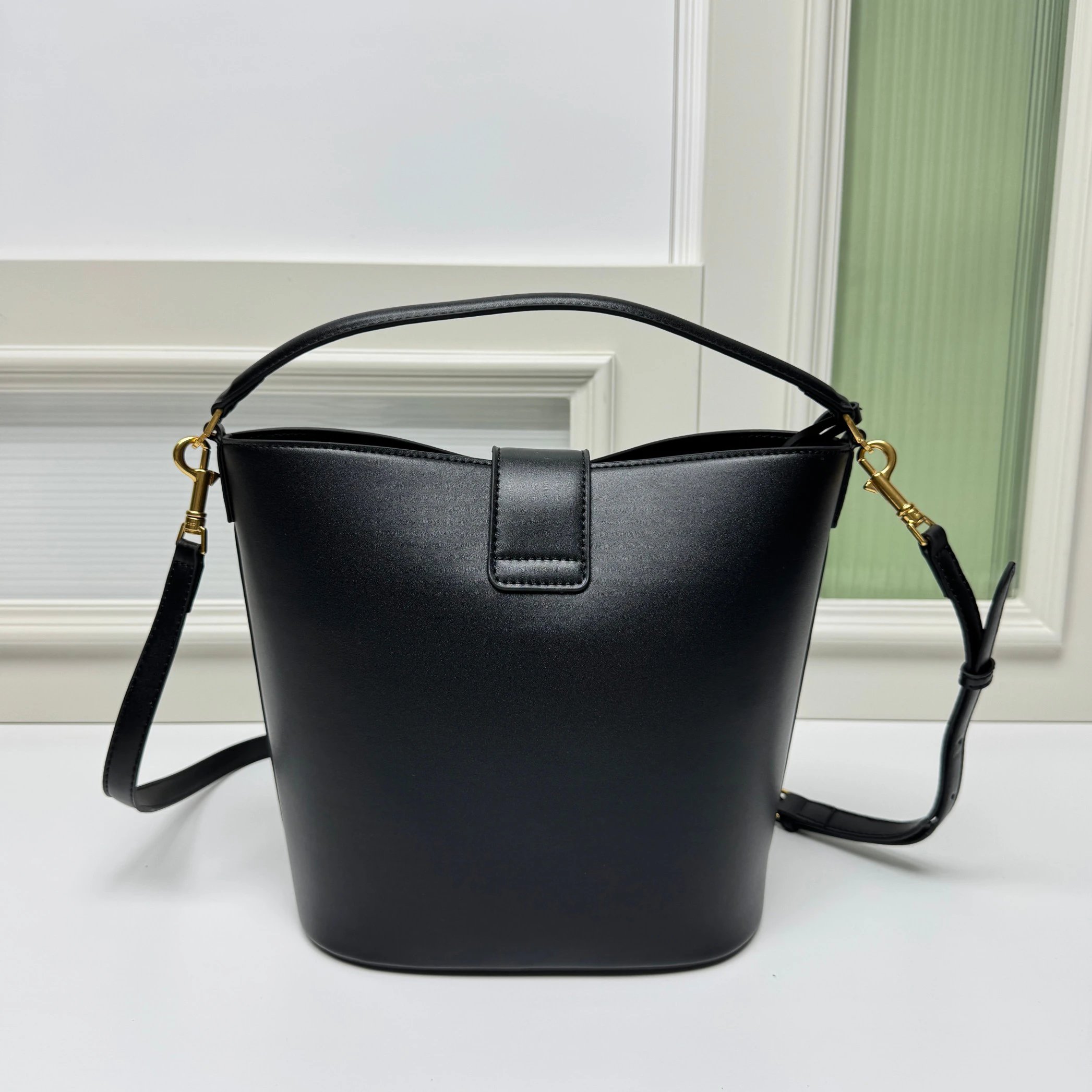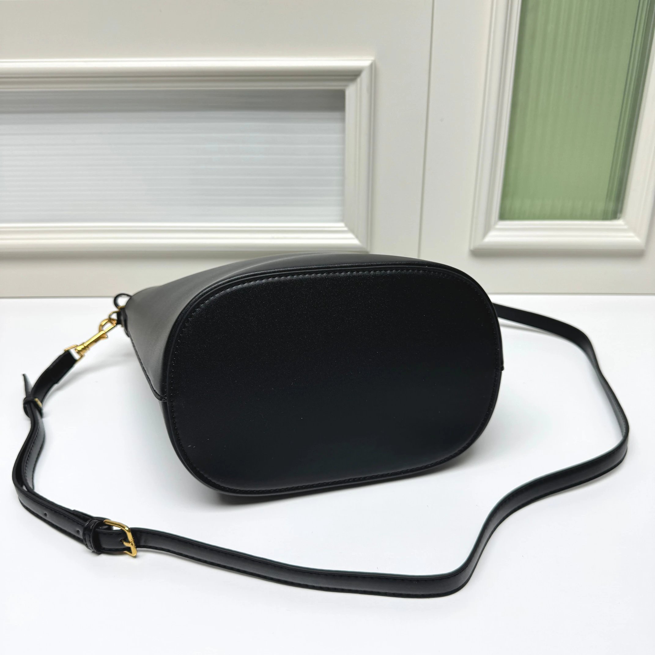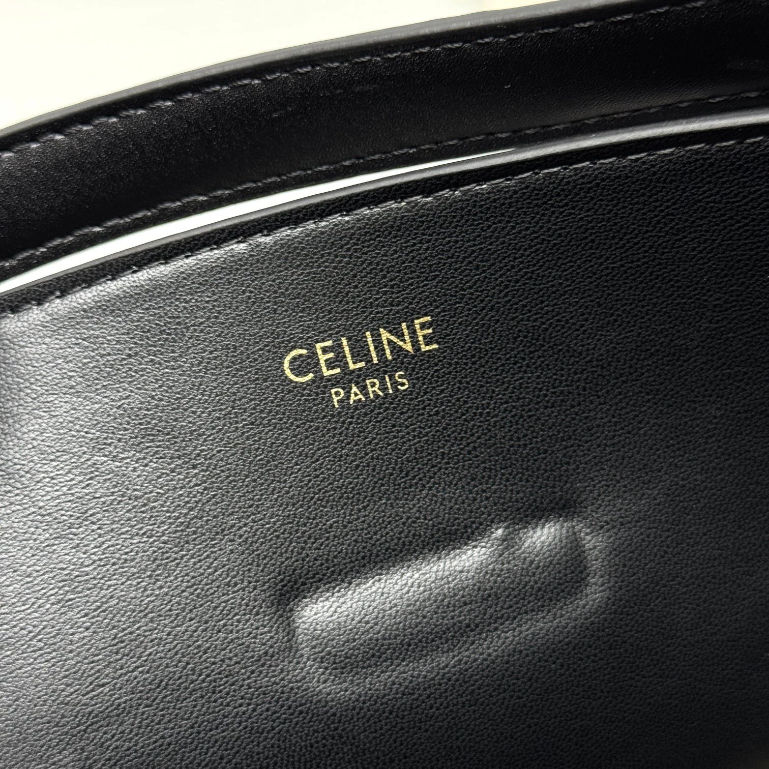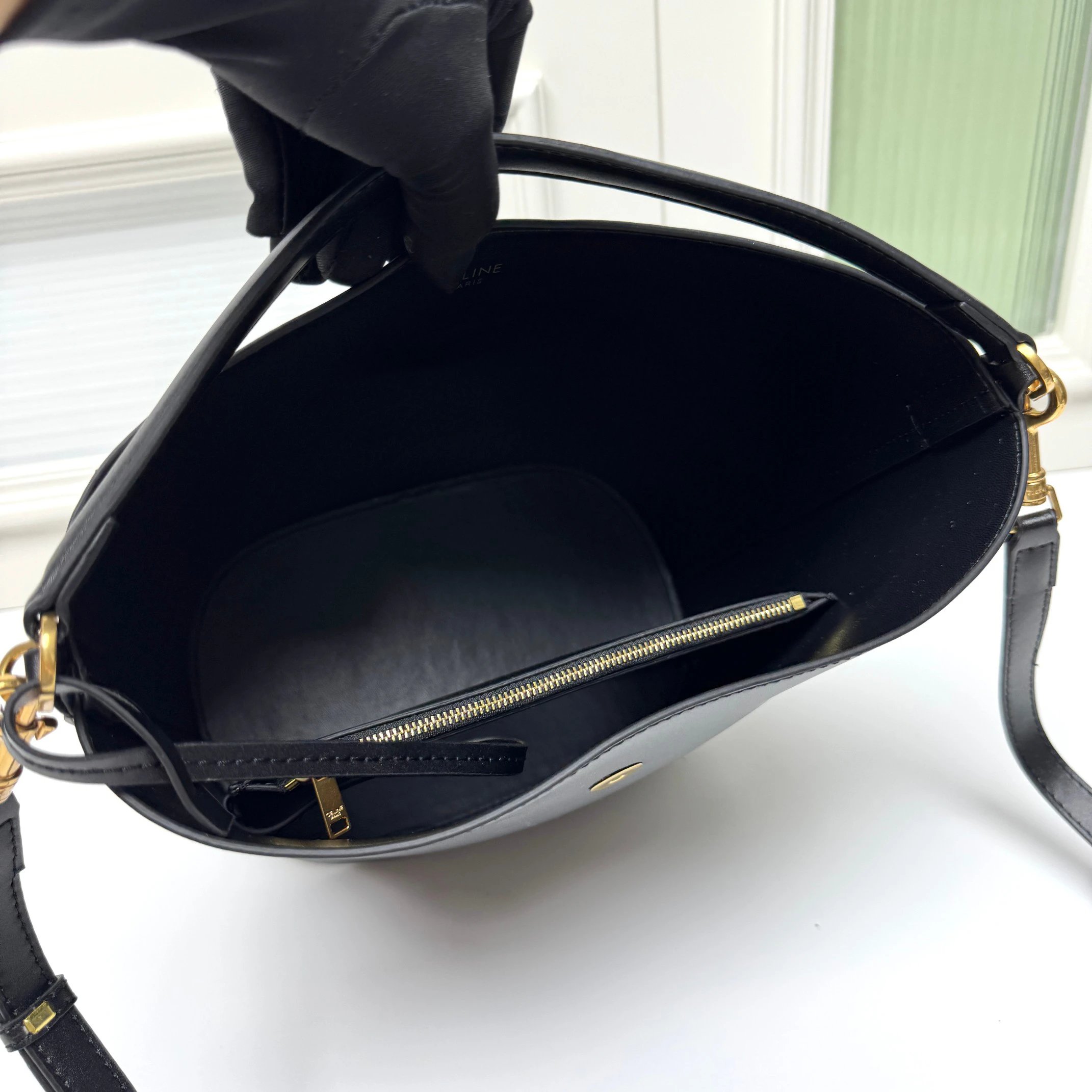 CELINE Louise bucket bag is crafted from glossy fine calfskin, featuring a sleek silhouette with a shiny gold Triomphe logo.