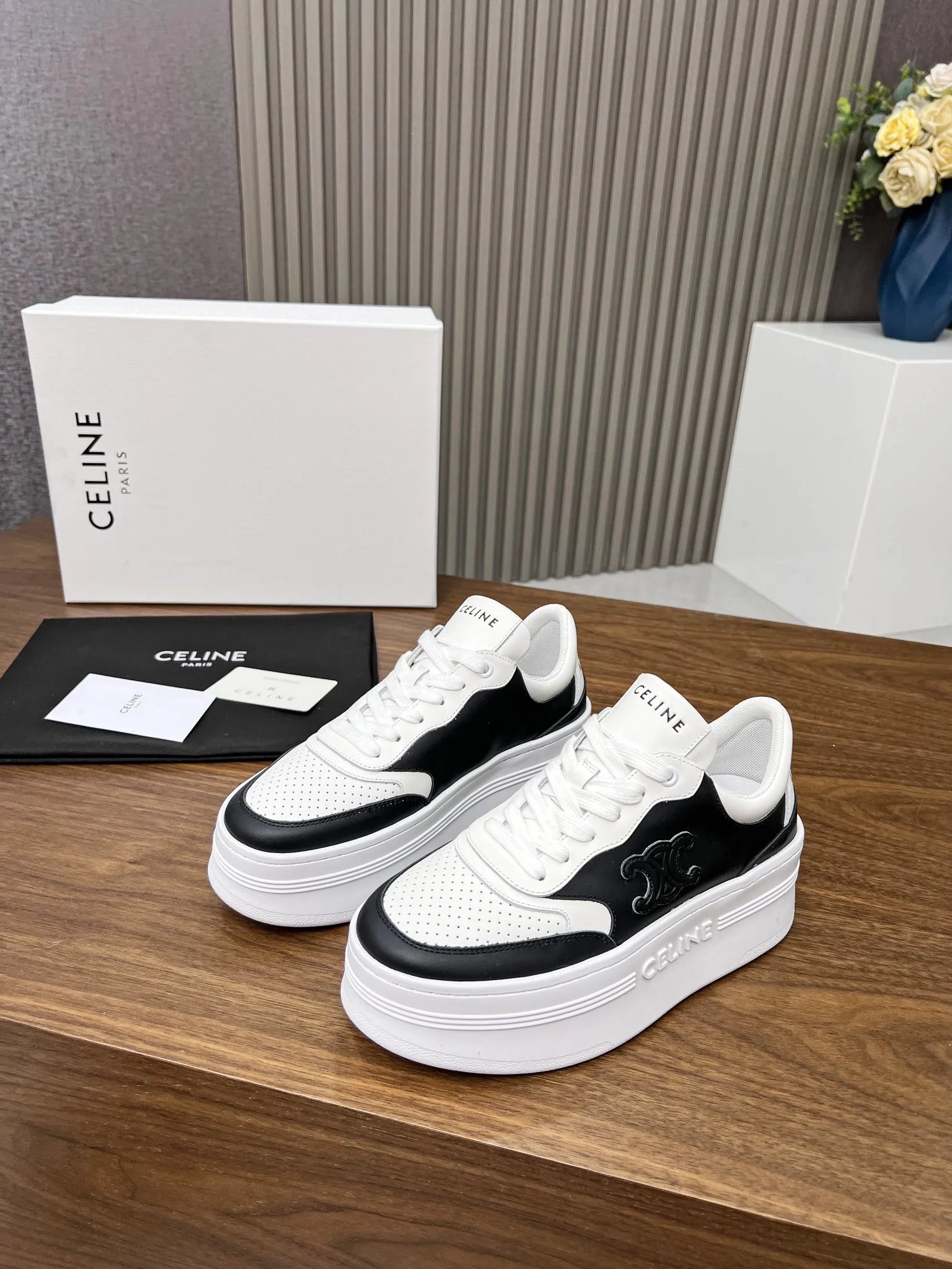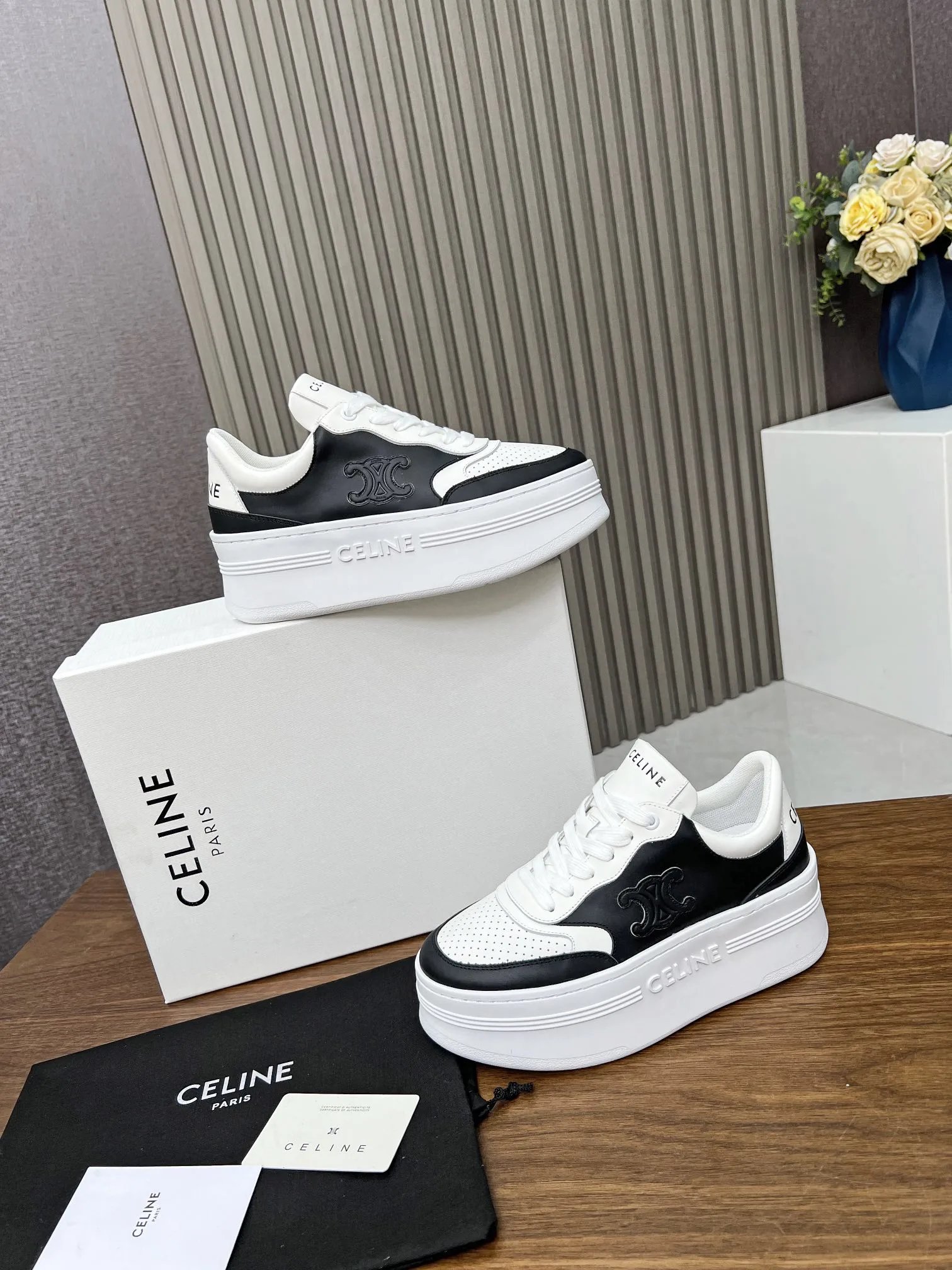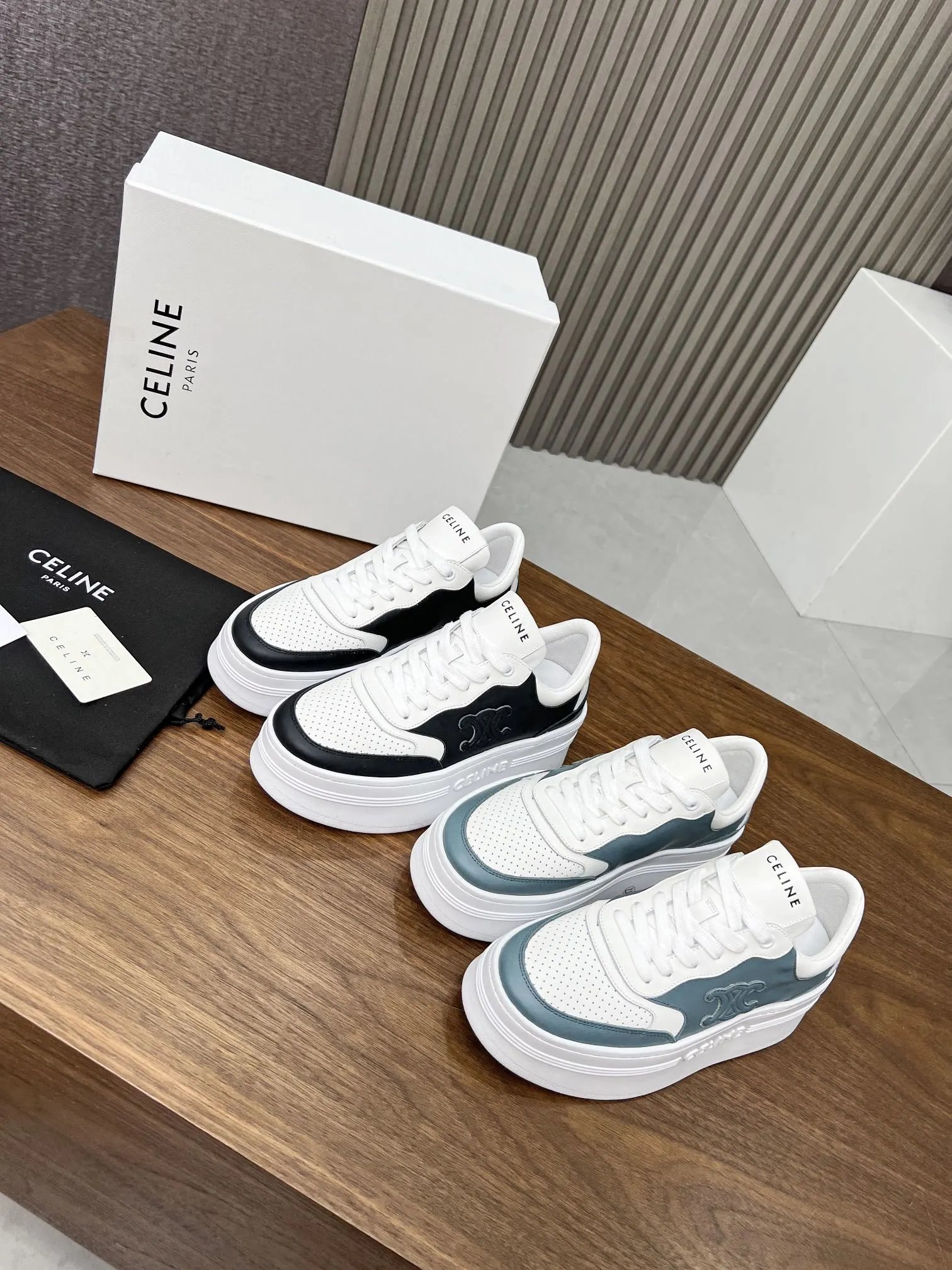 CELINE BLO TRIOMPHE Calfskin Platform Wedge Sneakers: embossed logos, thick bread sole.