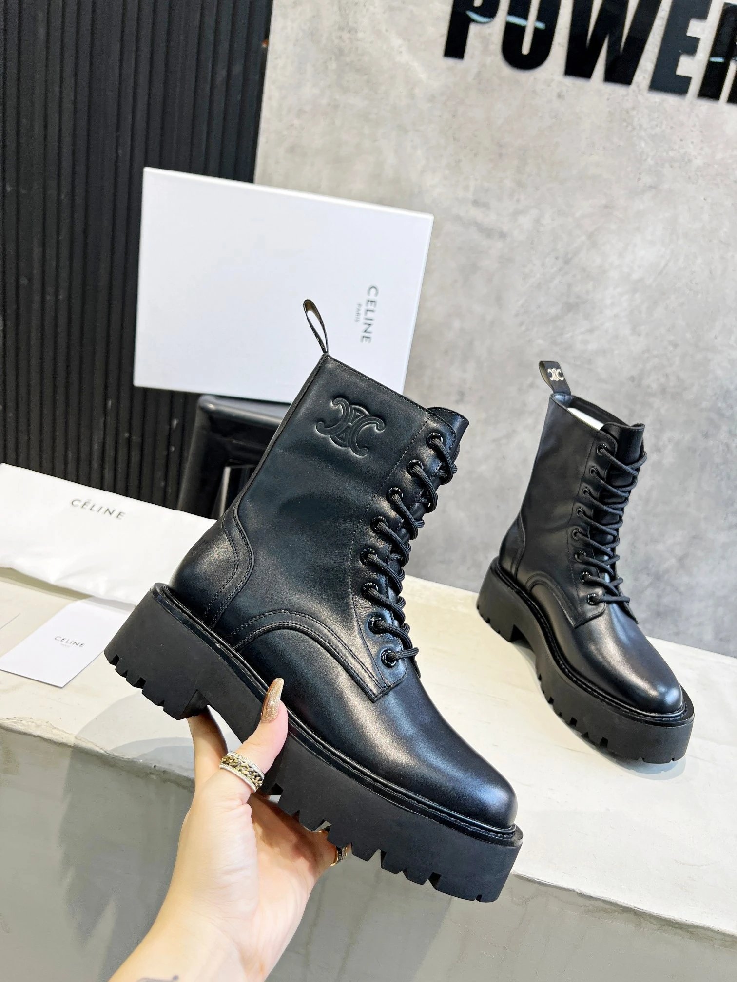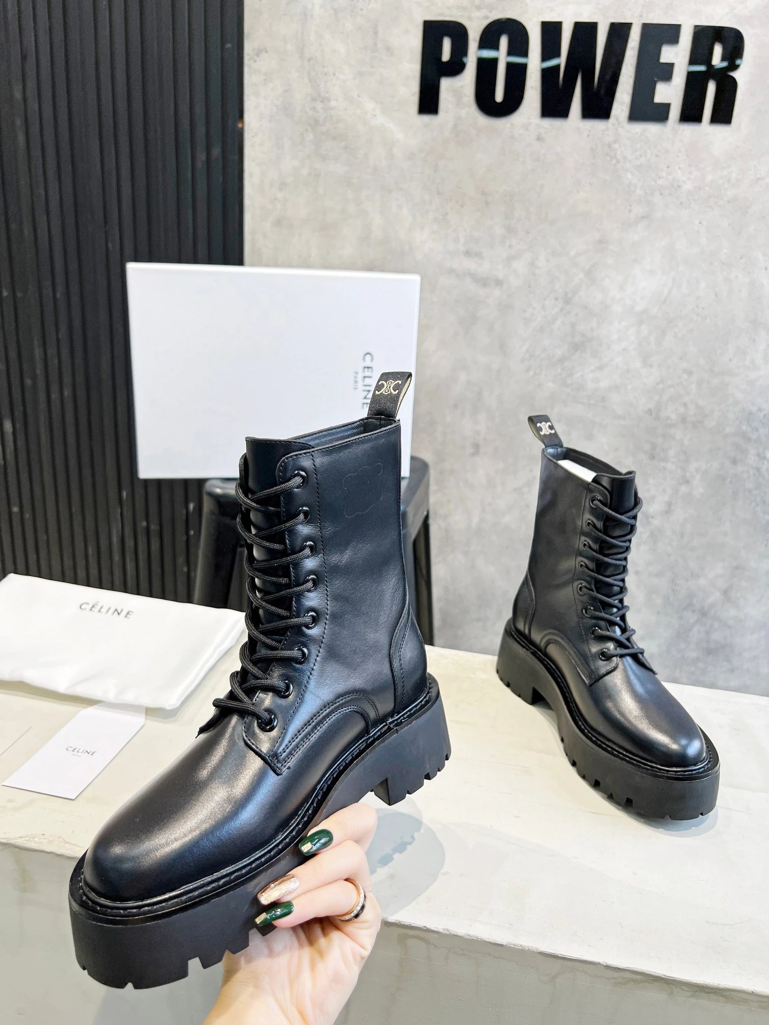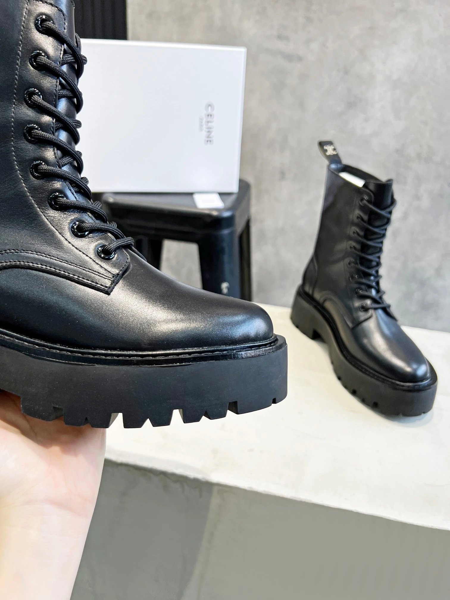 Home > Goods List CELINE New Lace-Up Marten Ankle Boots, Italian Leather, Sizes 35-40