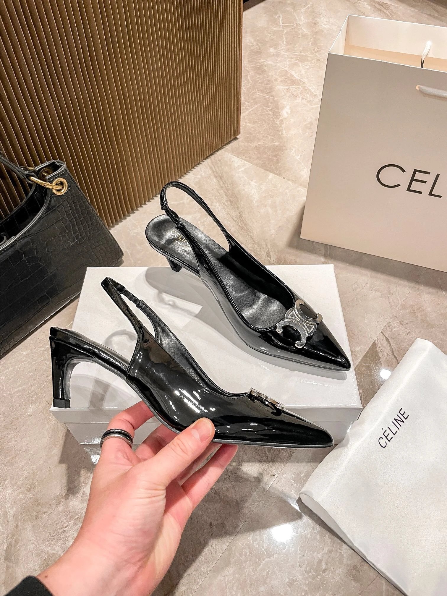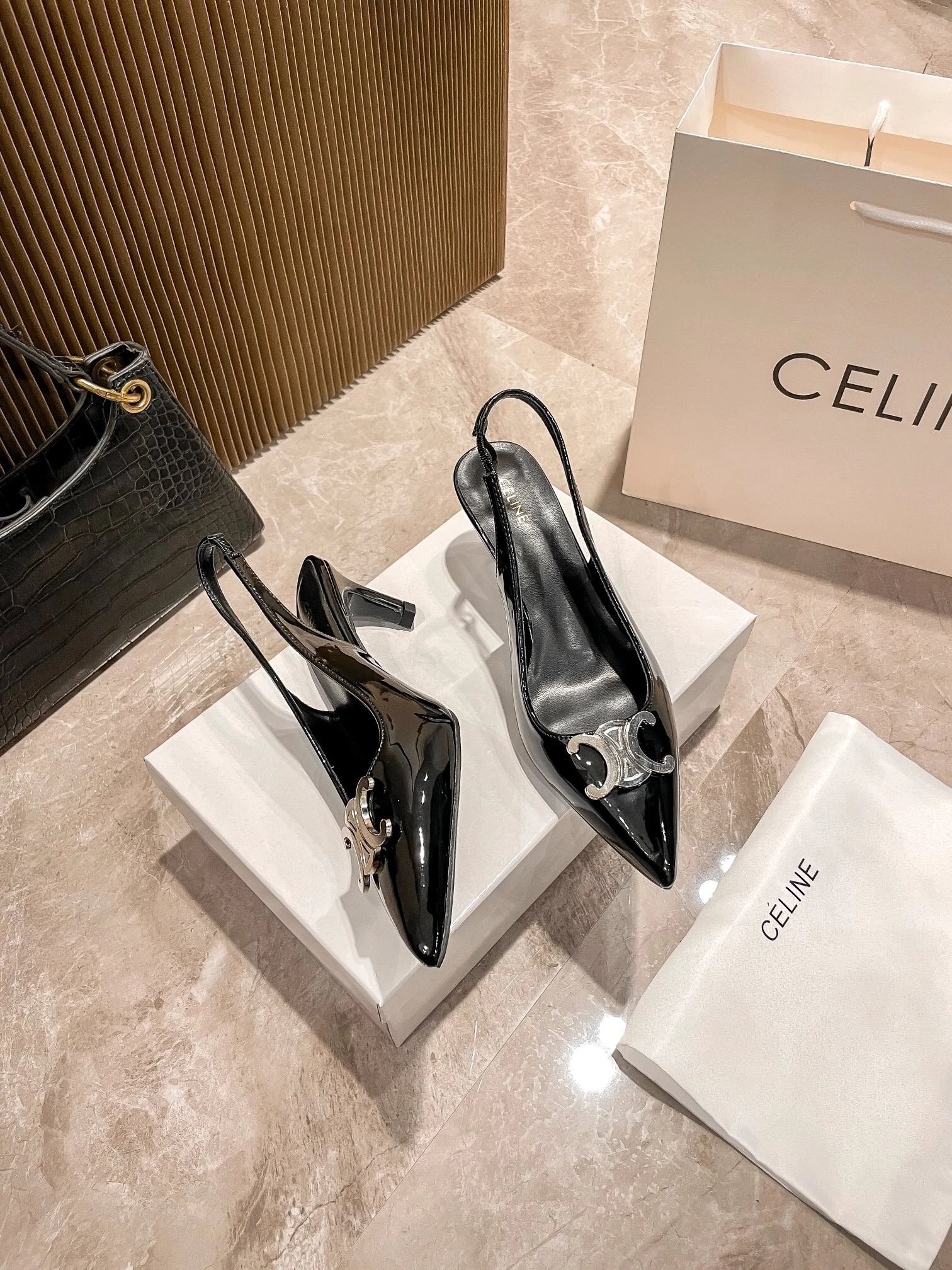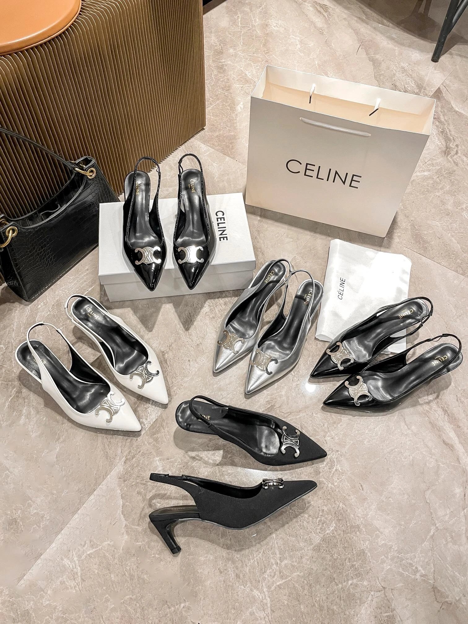 Colors: Black Shiny, Matte, White, Silver; Black fabric upper, large silver Triomphe buckle.