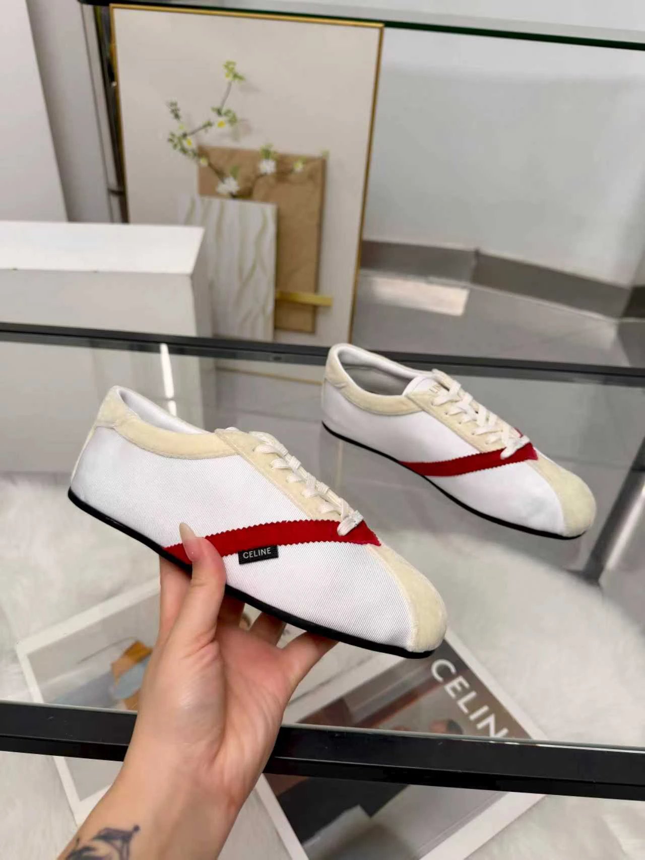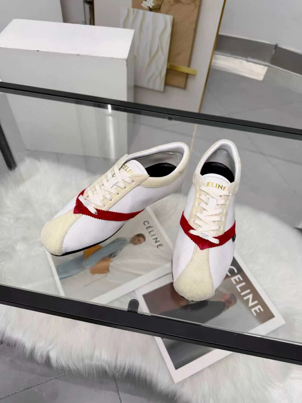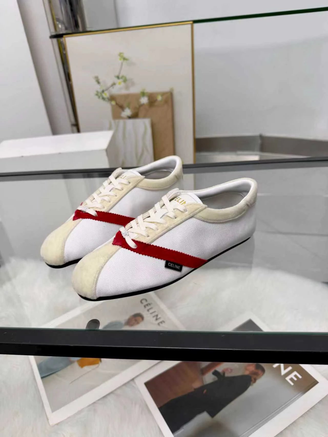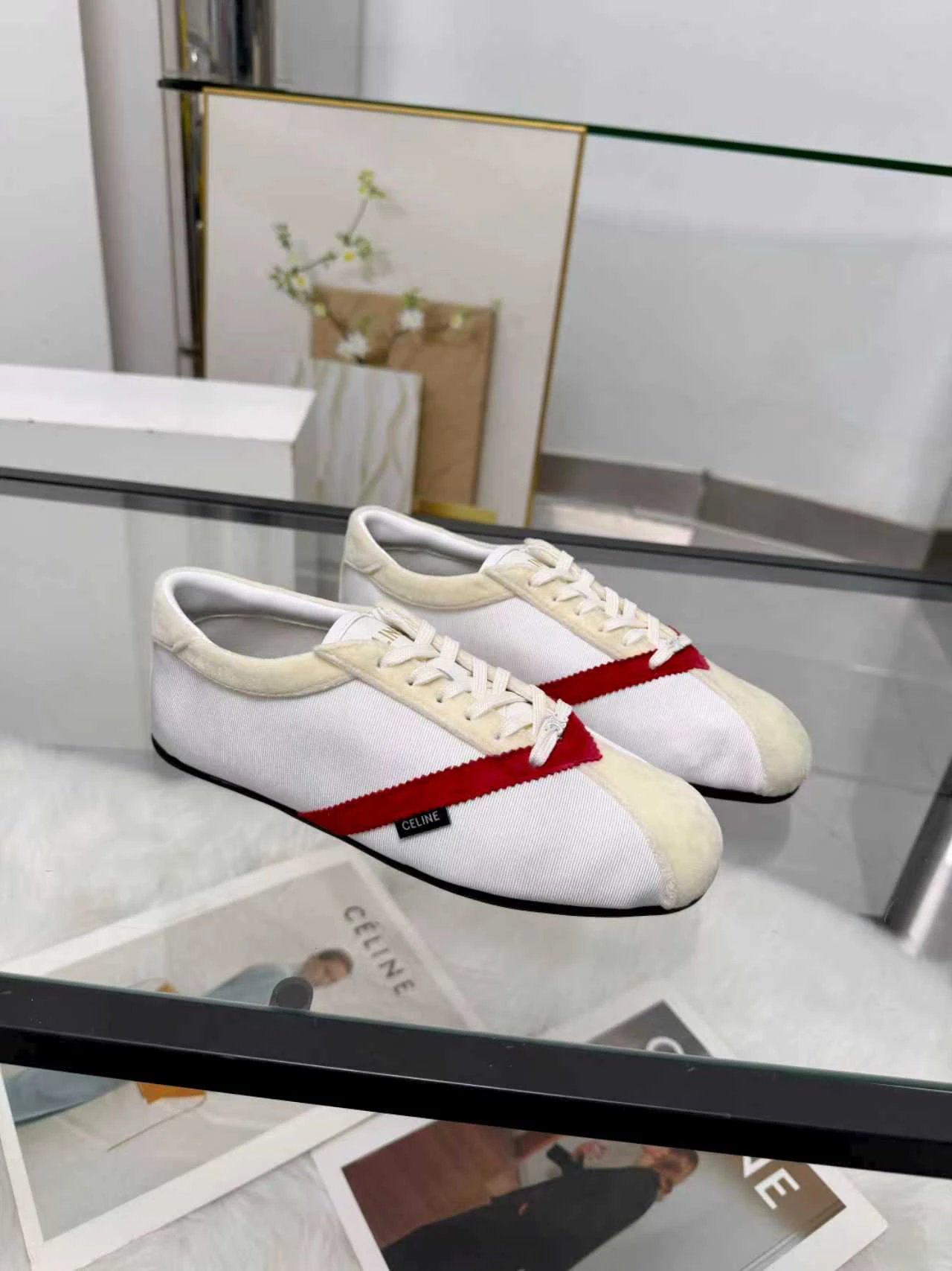 CELINE 26SS Women's Triomphe Logo Ballet Flats have velvet upper. Available in sizes 35-41.