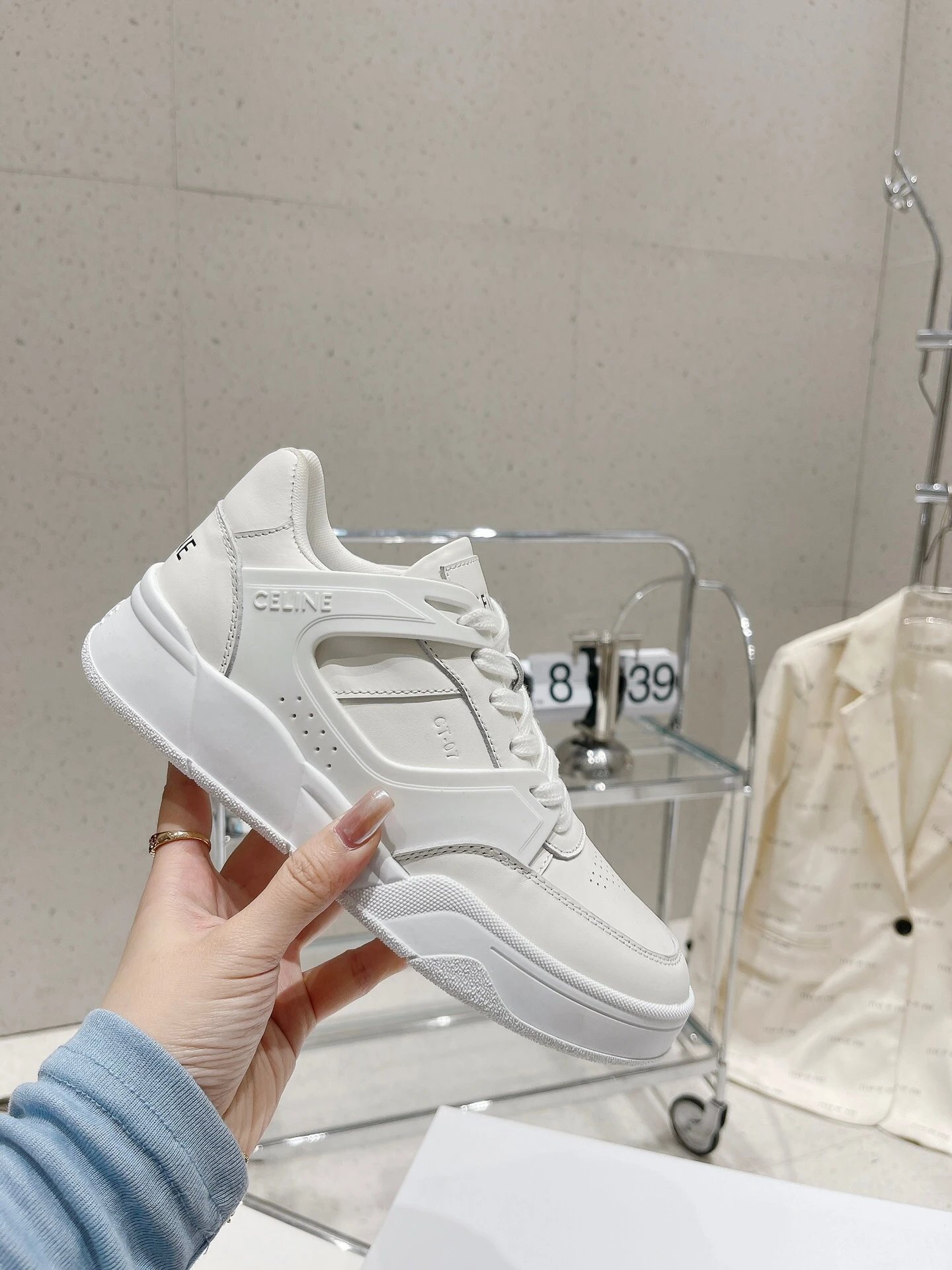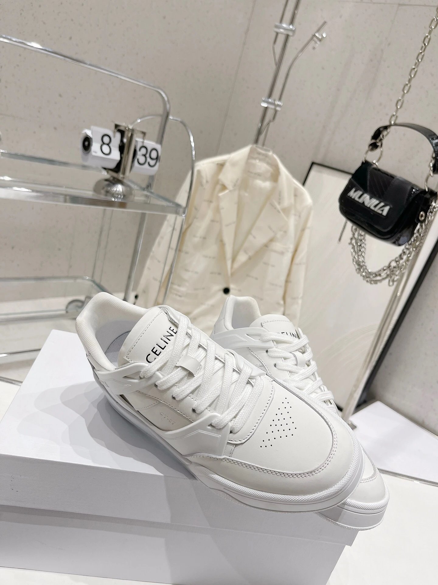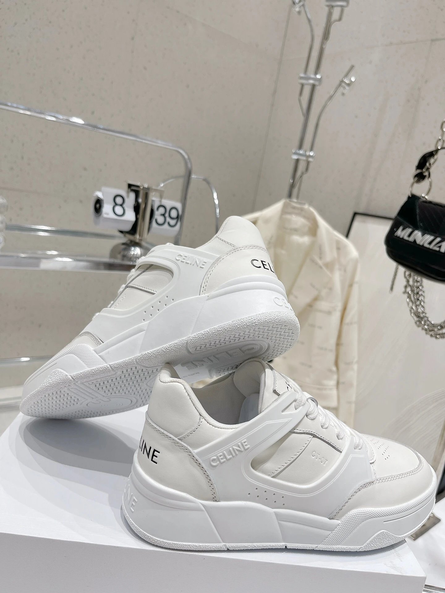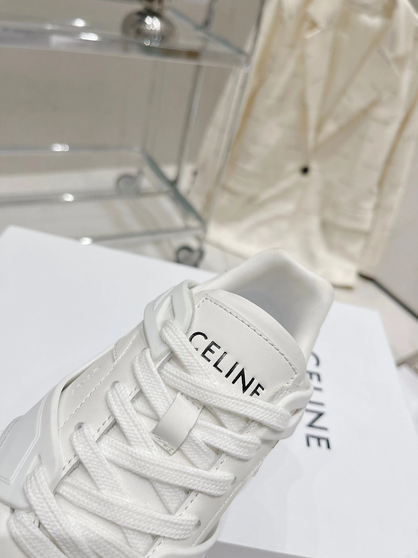 CELINE 195 2023 Unisex Colorblock Casual Sneakers have street-style design with unique colorblocking. Calfskin upper easy to clean, front hook-and-loop fastener distinctive, side/heels logos add style—perfect white sneaker!