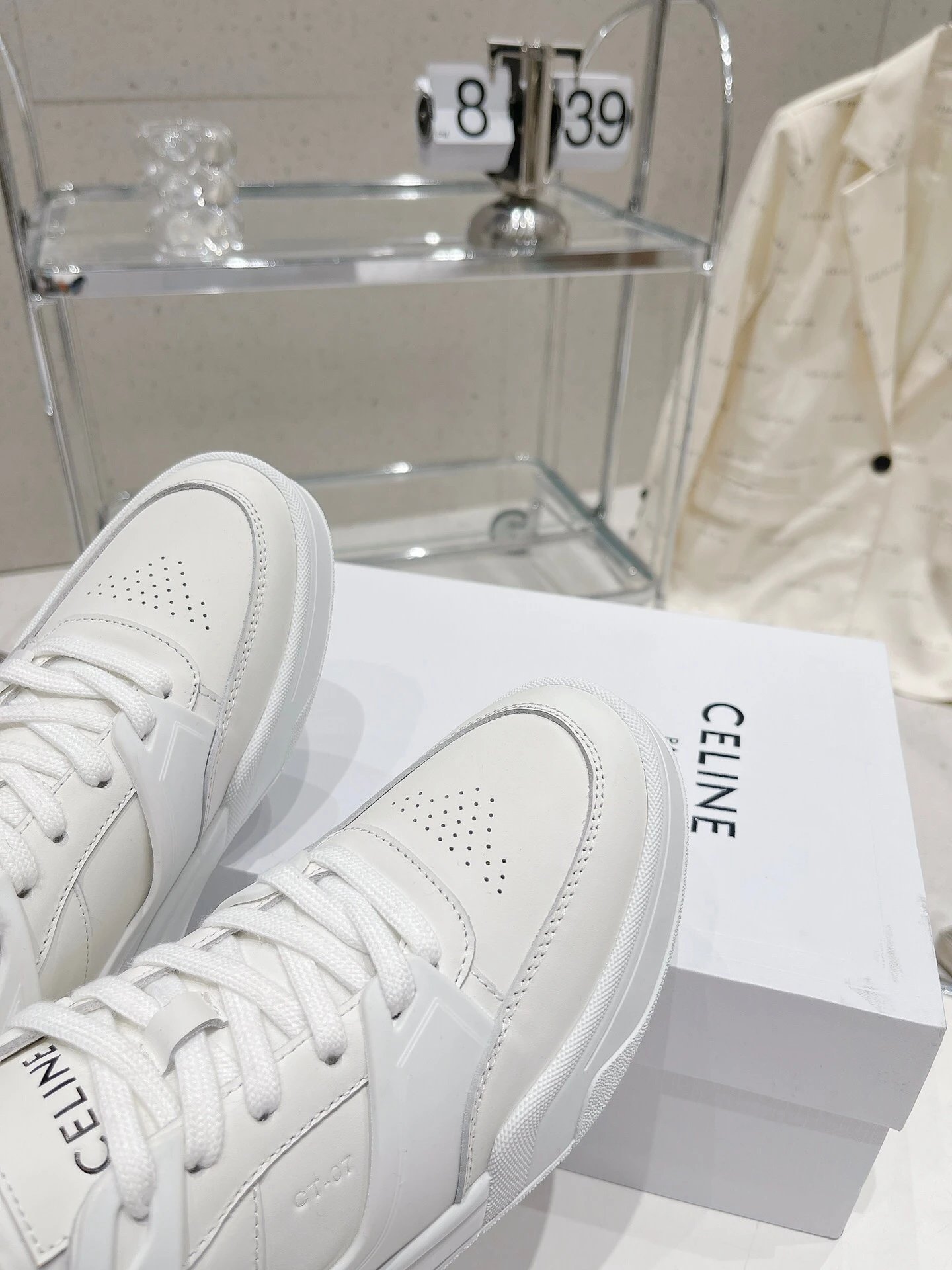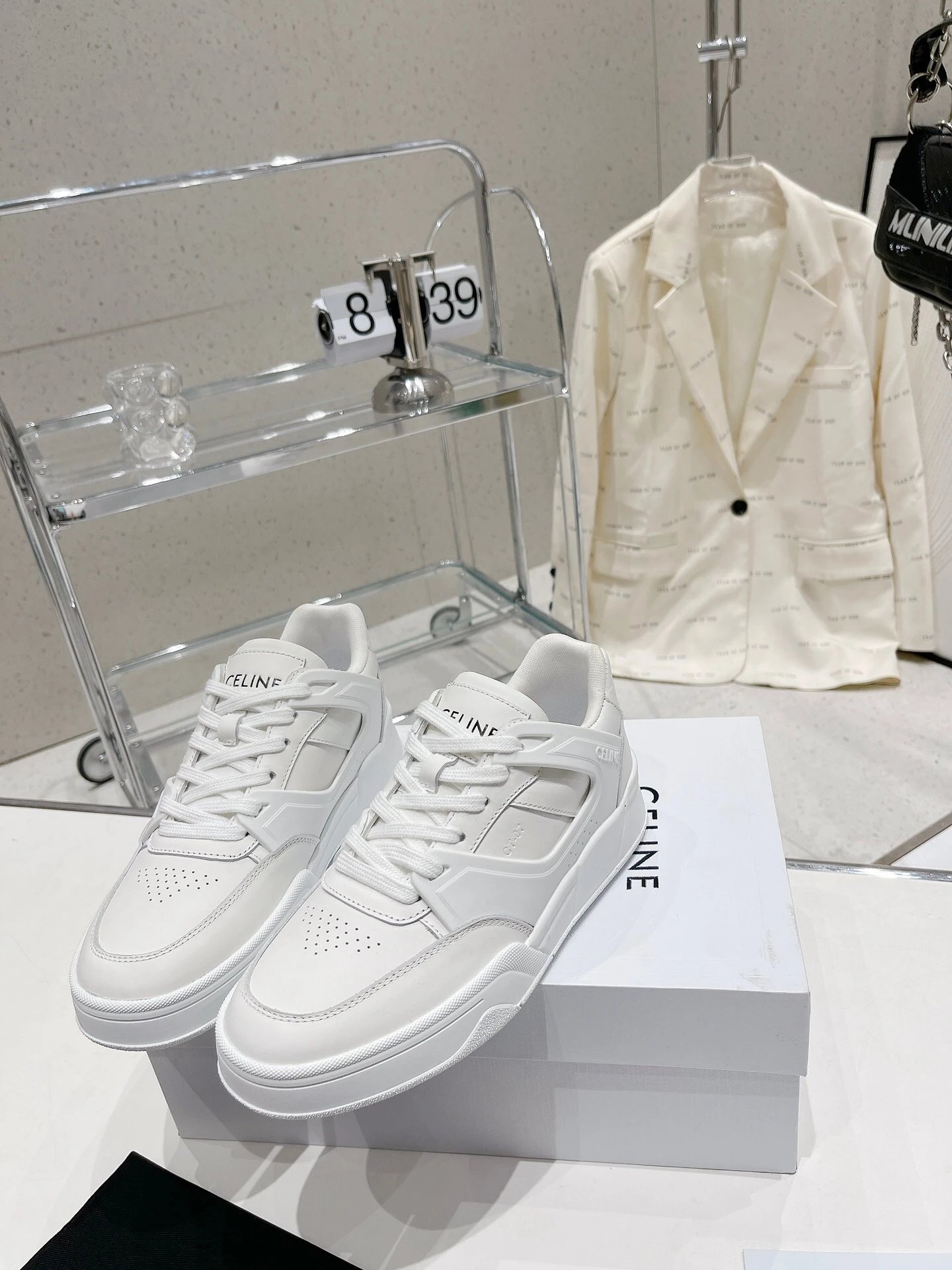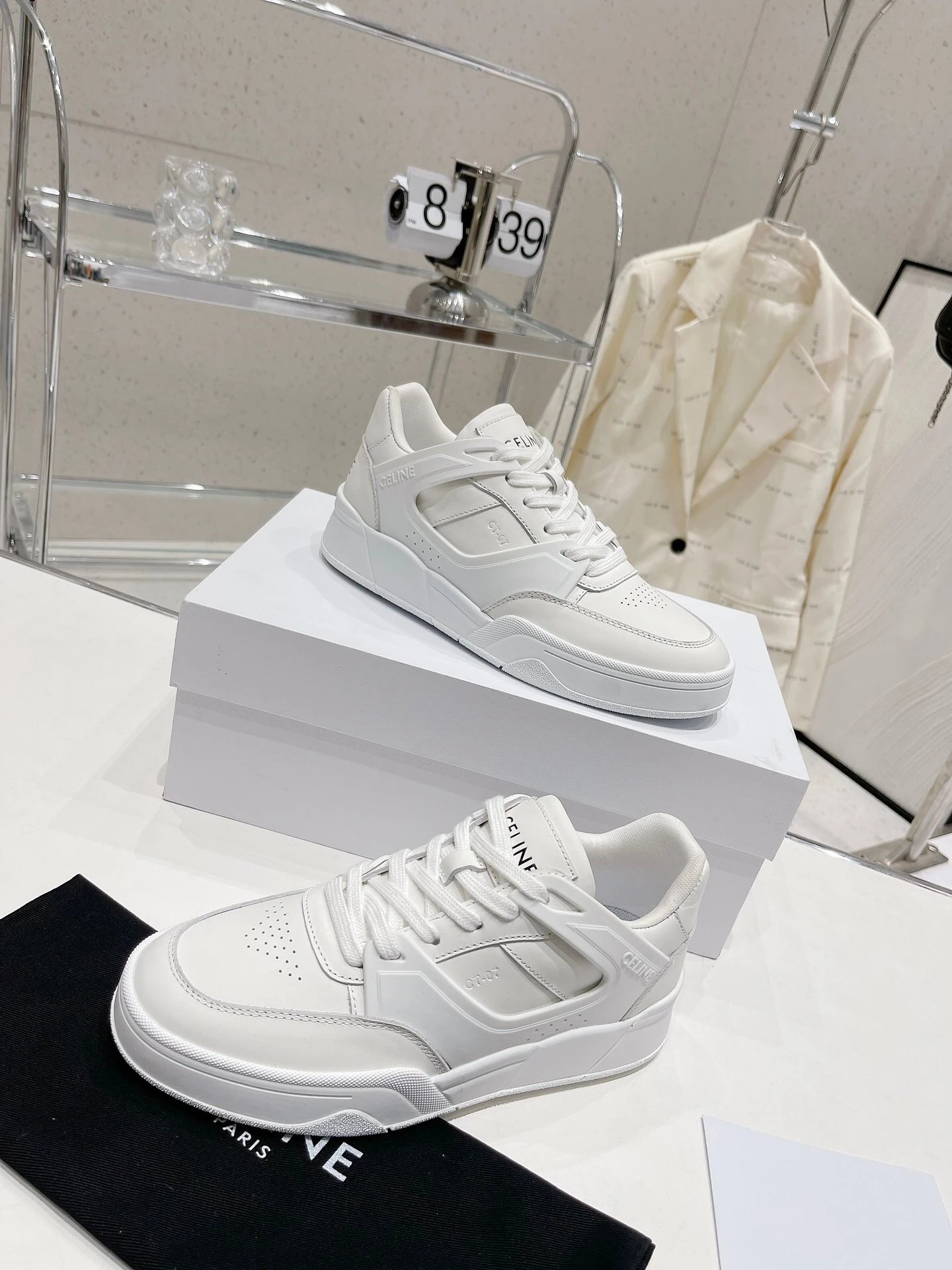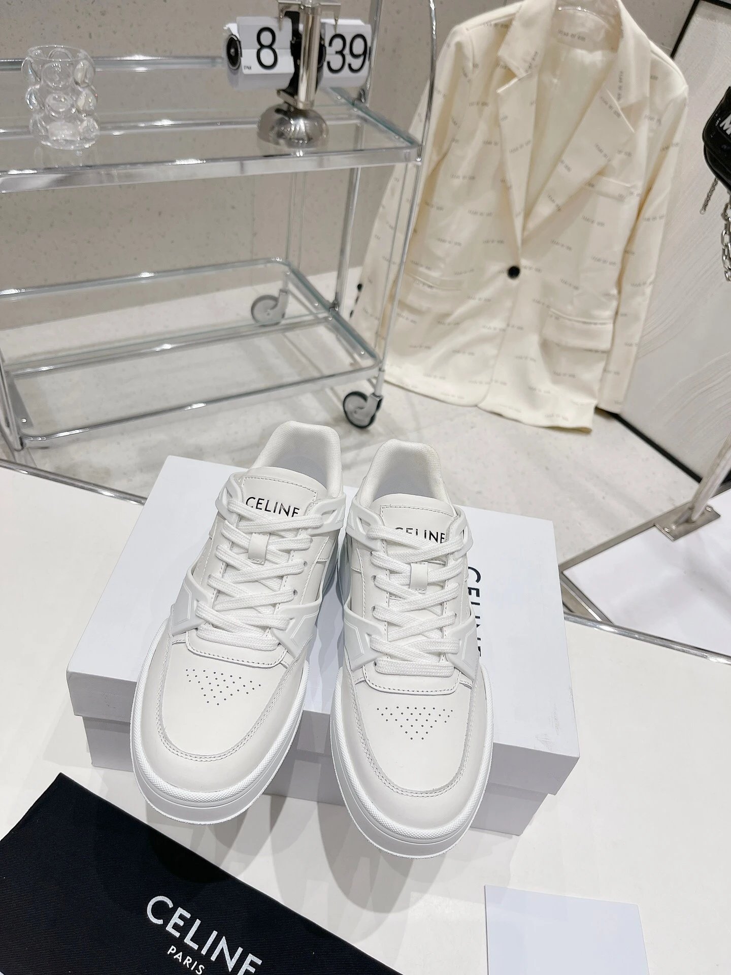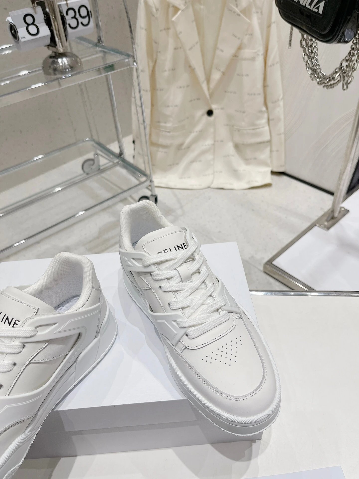 CELINE 195 2023 Unisex Colorblock Casual Sneakers have street-style design with unique colorblocking. Calfskin upper easy to clean, front hook-and-loop fastener distinctive, side/heels logos add style—perfect white sneaker!