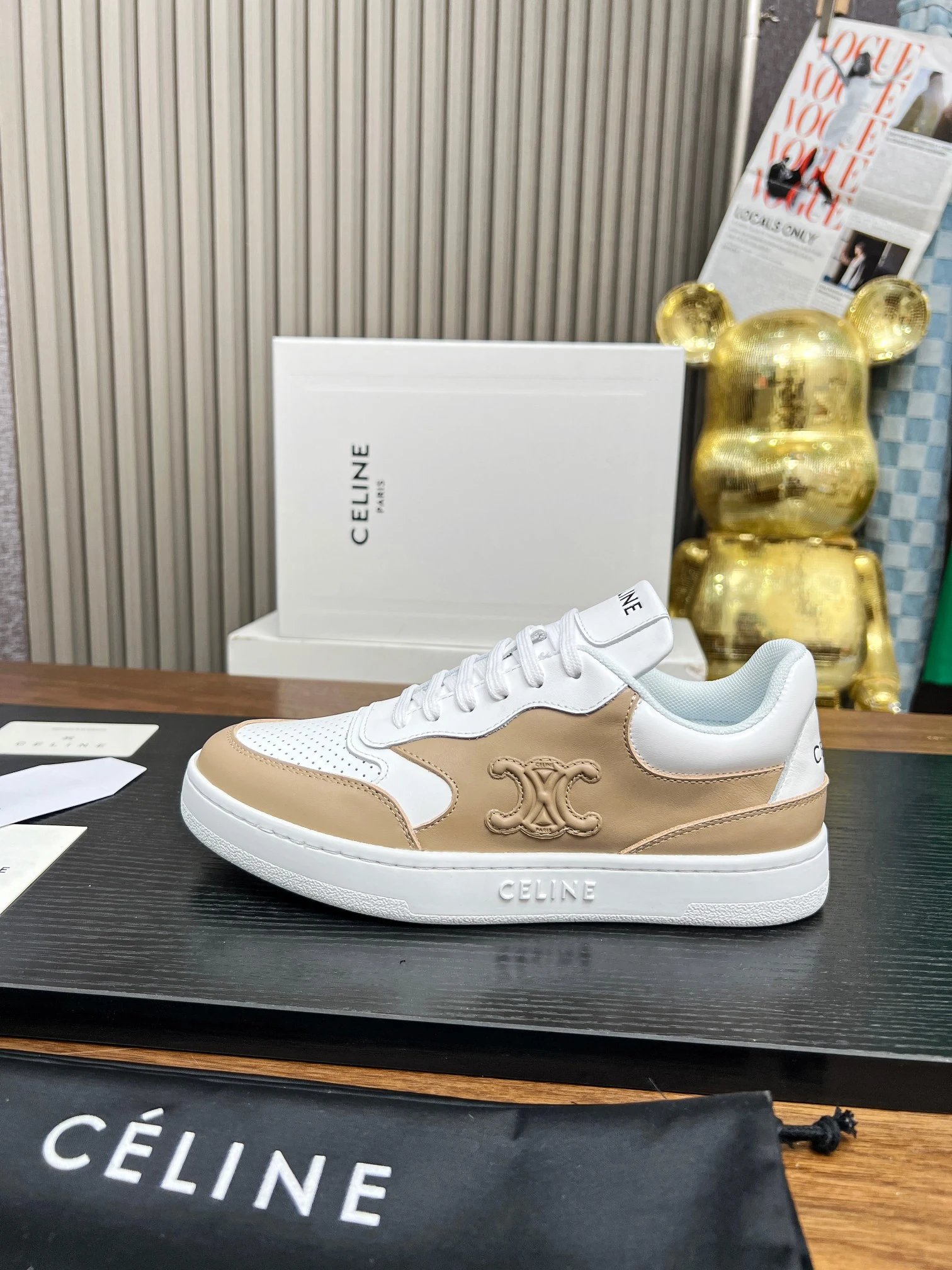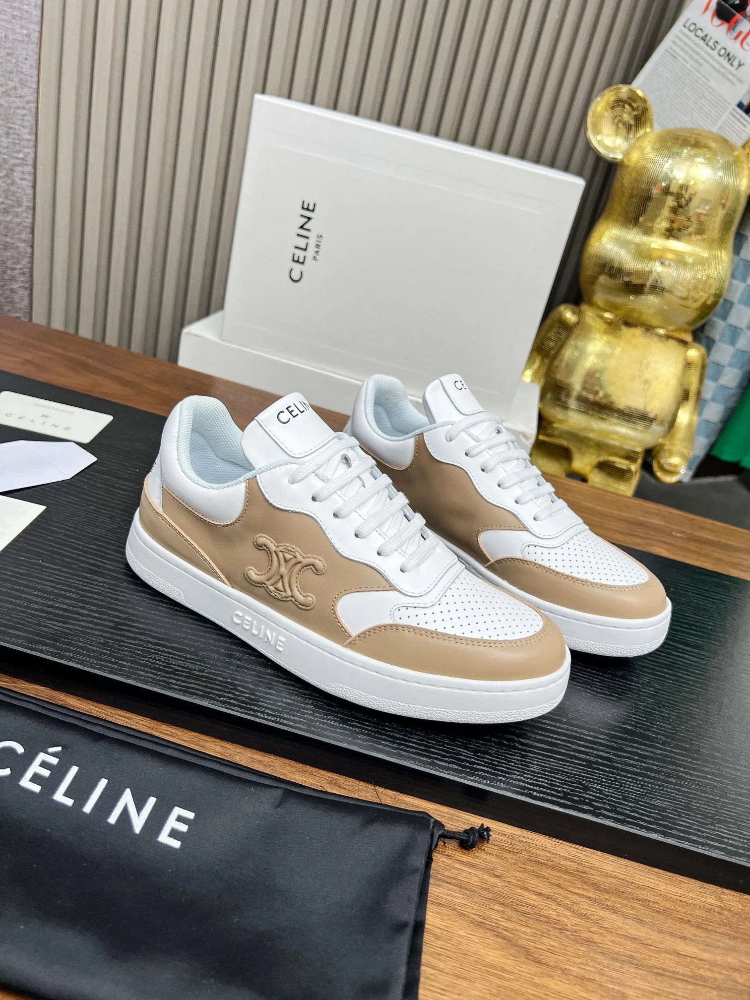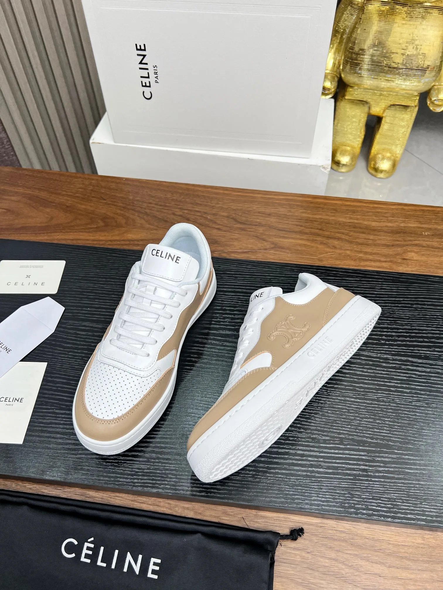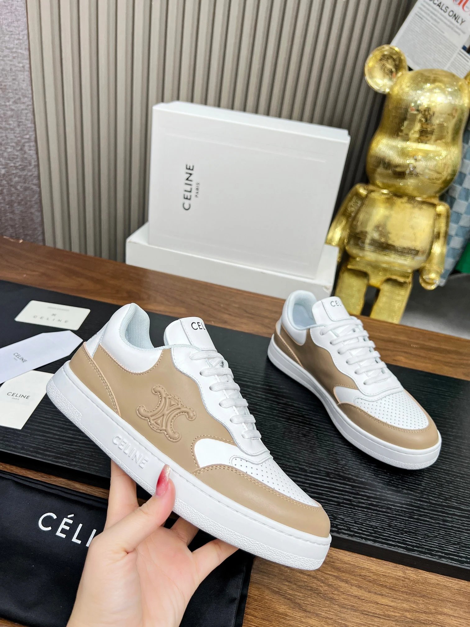 CELINE Blo Triomphe Wedge Sneakers are crafted from cowhide leather with embossed logos on heel & side.