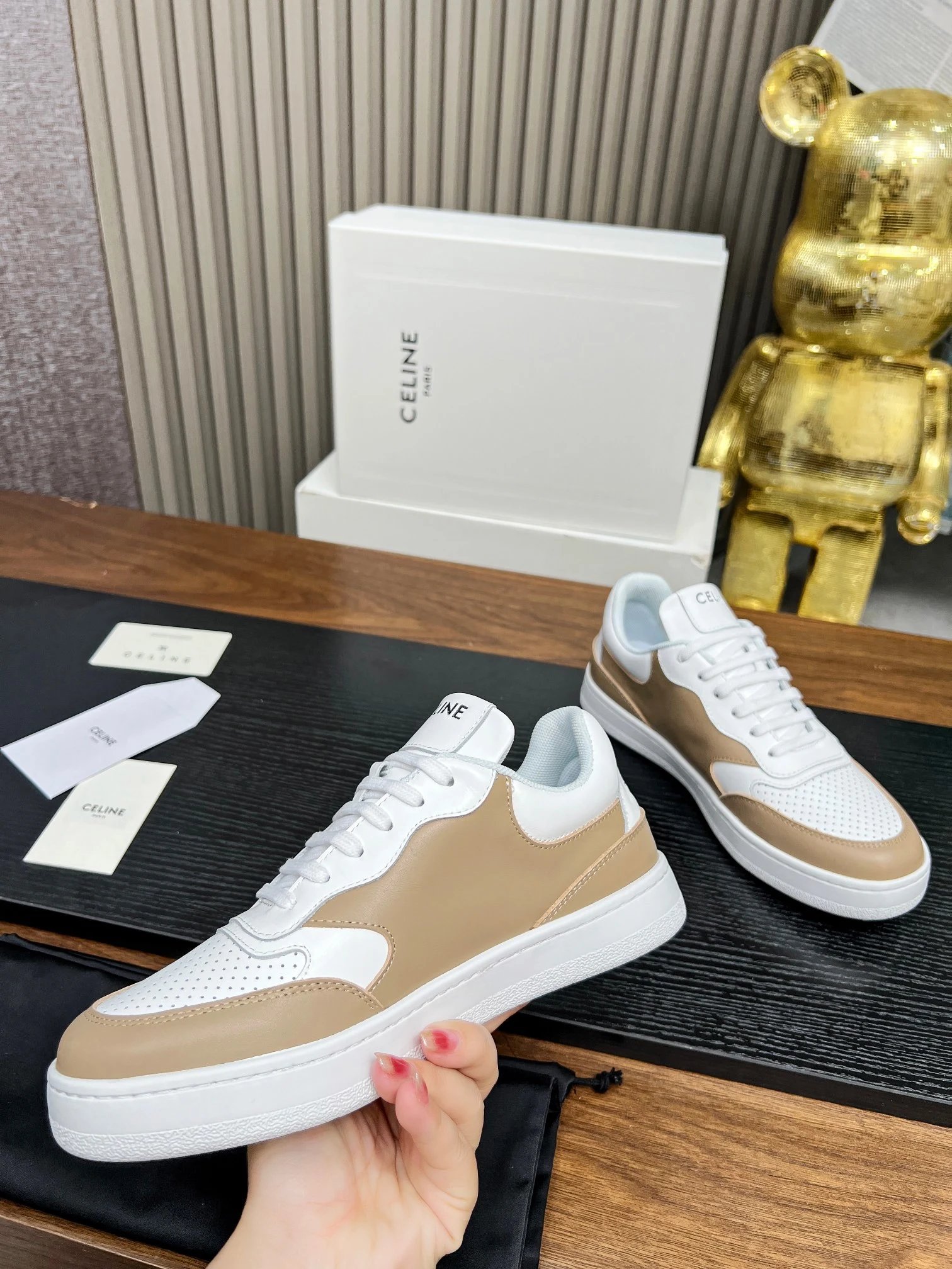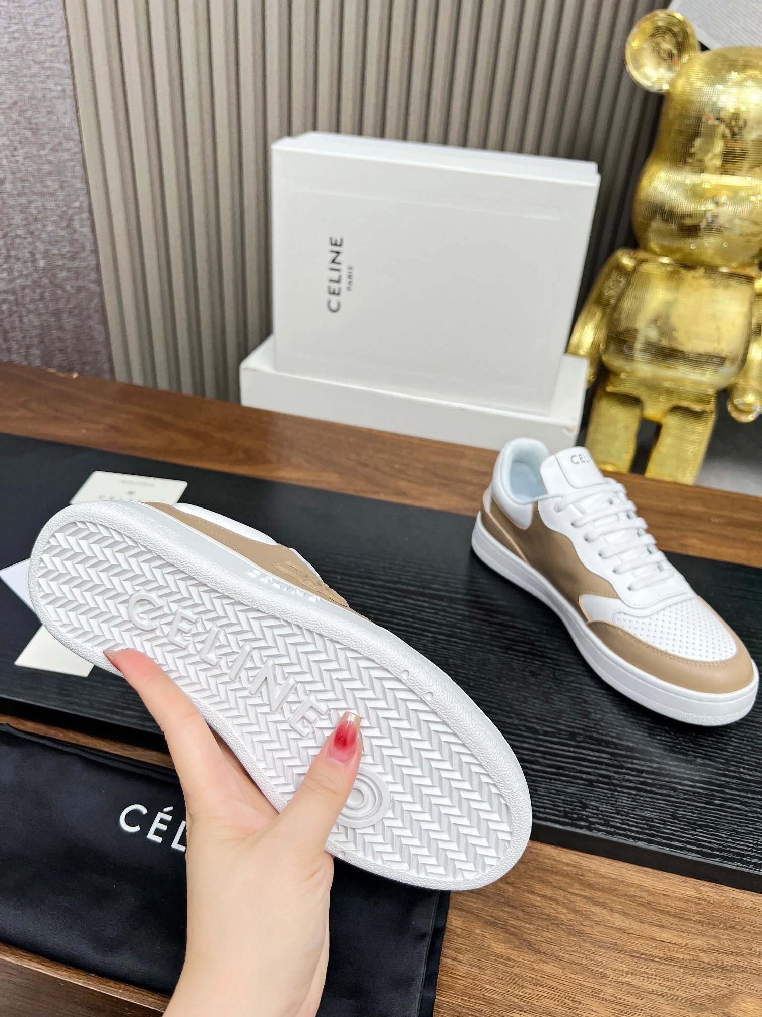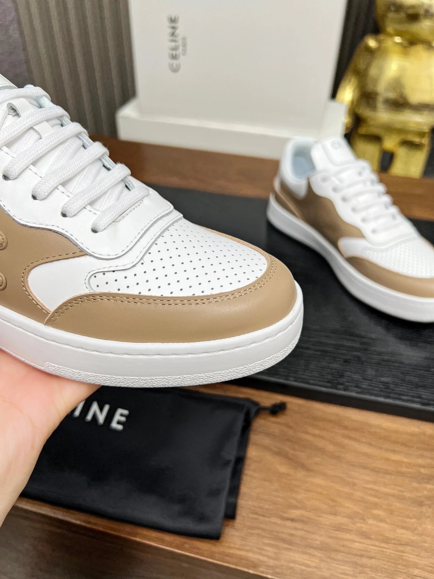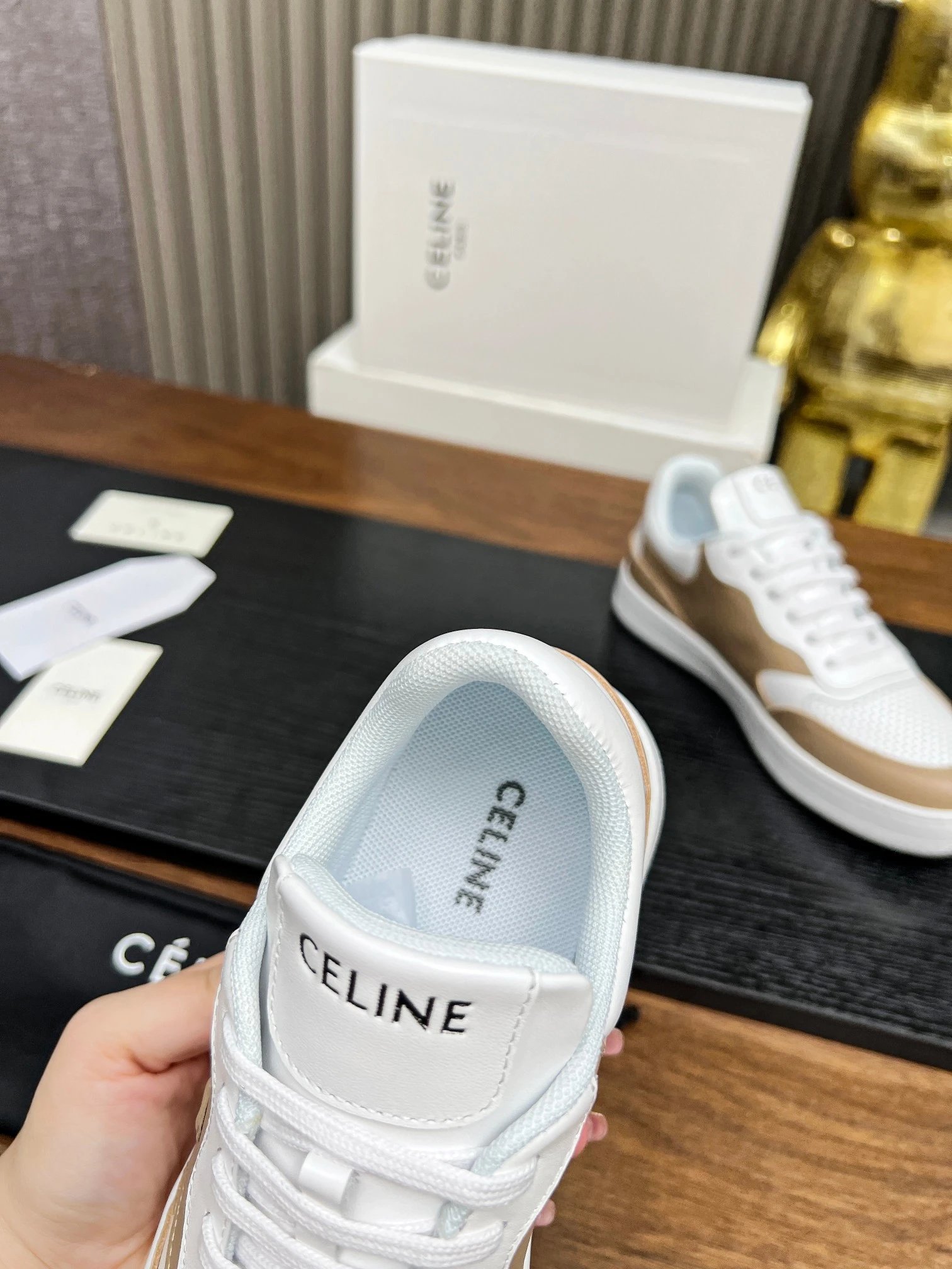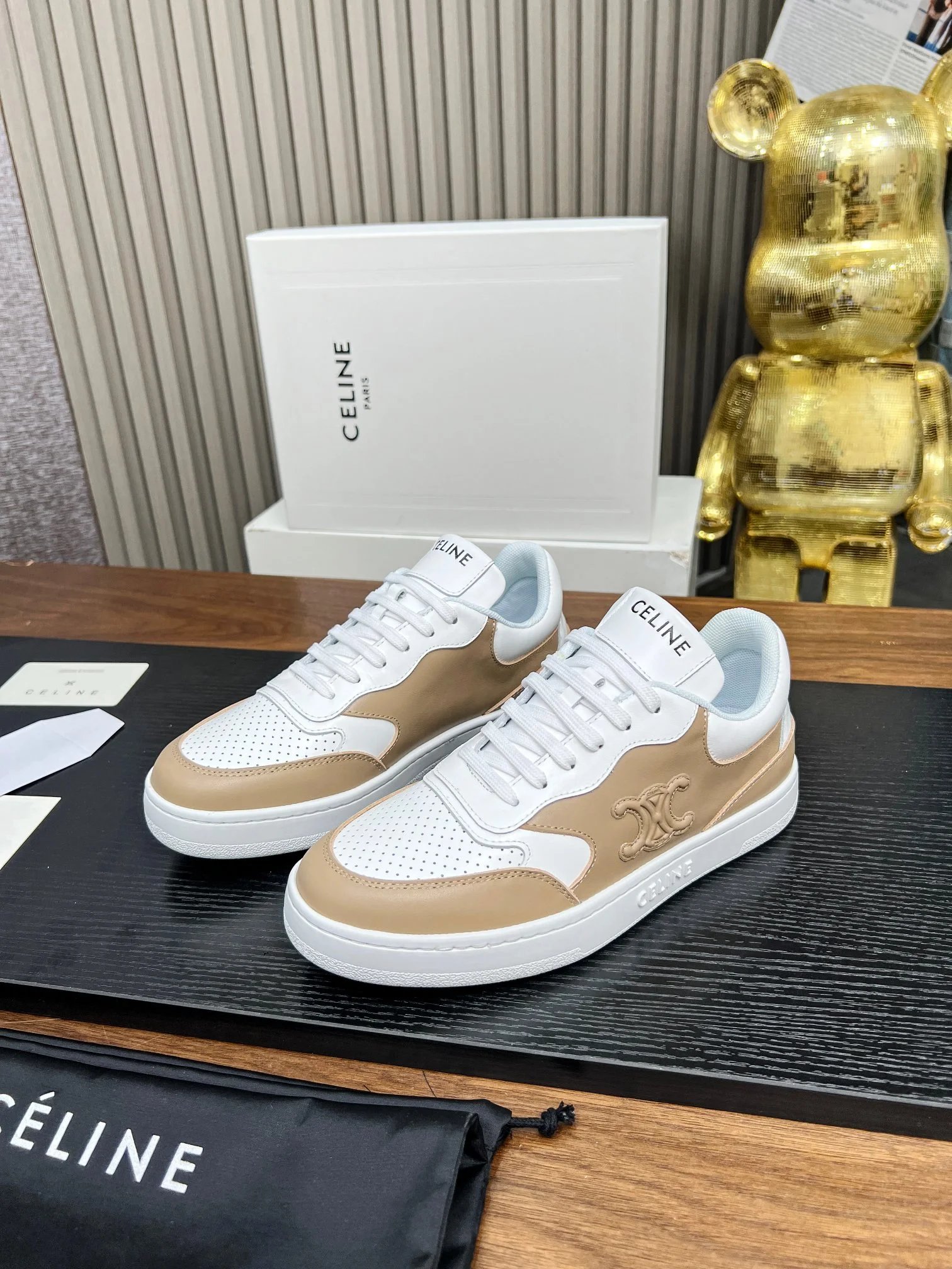CELINE Blo Triomphe Wedge Sneakers are crafted from cowhide leather with embossed logos on heel & side.