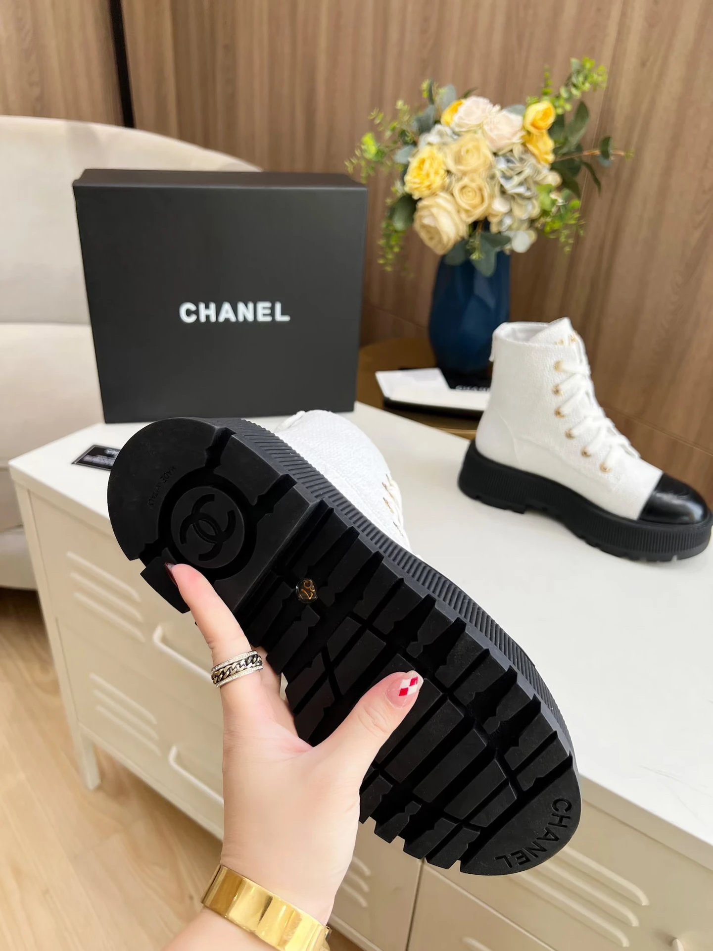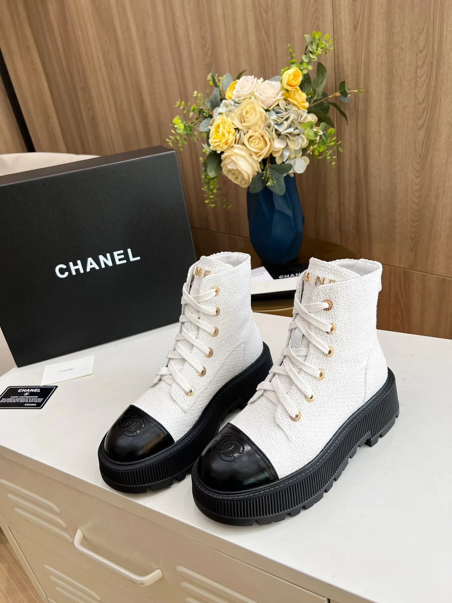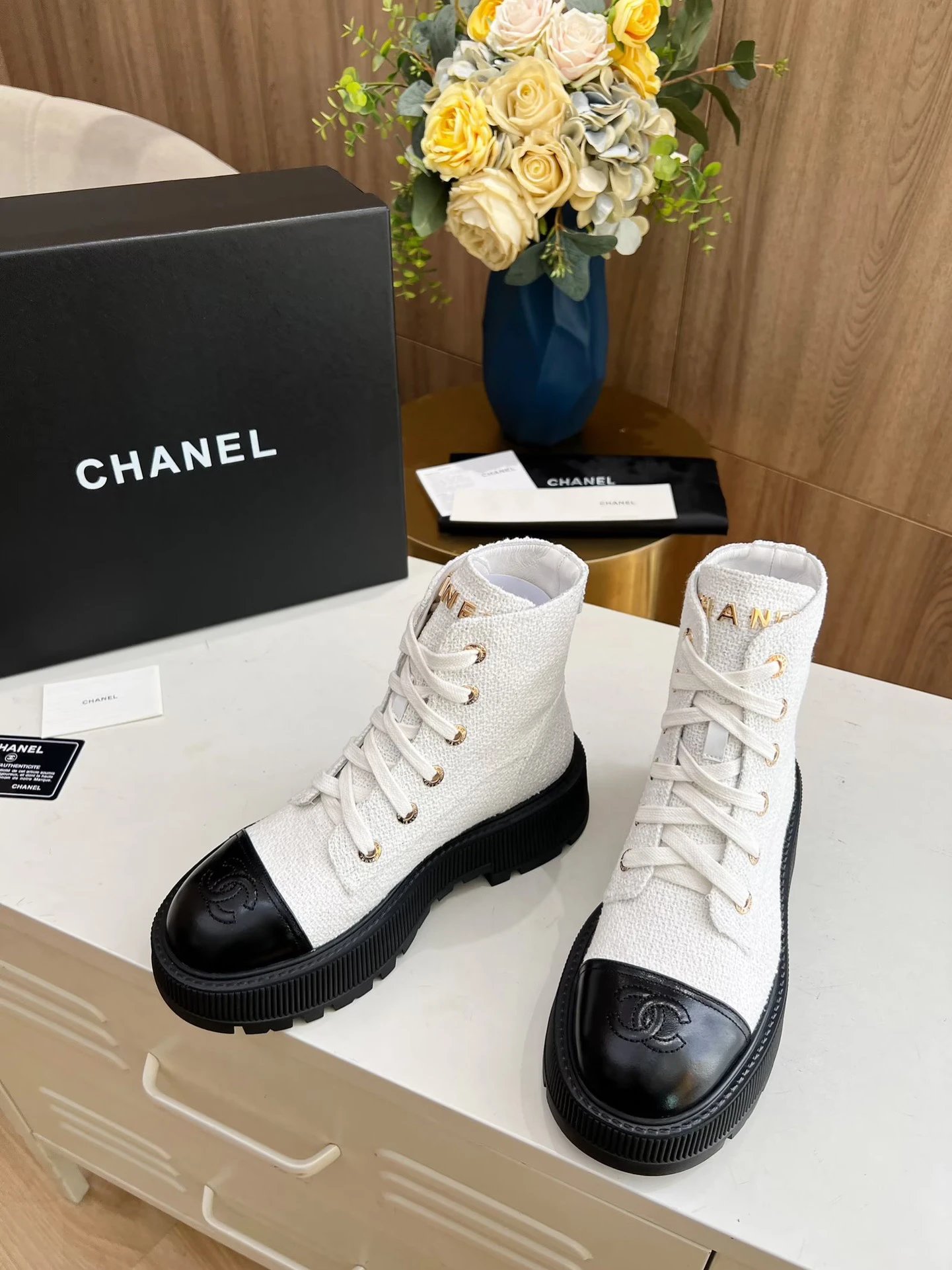 Chanel Fall Winter Ankle Boots feature original mold design with lace-up closure for easy wear.