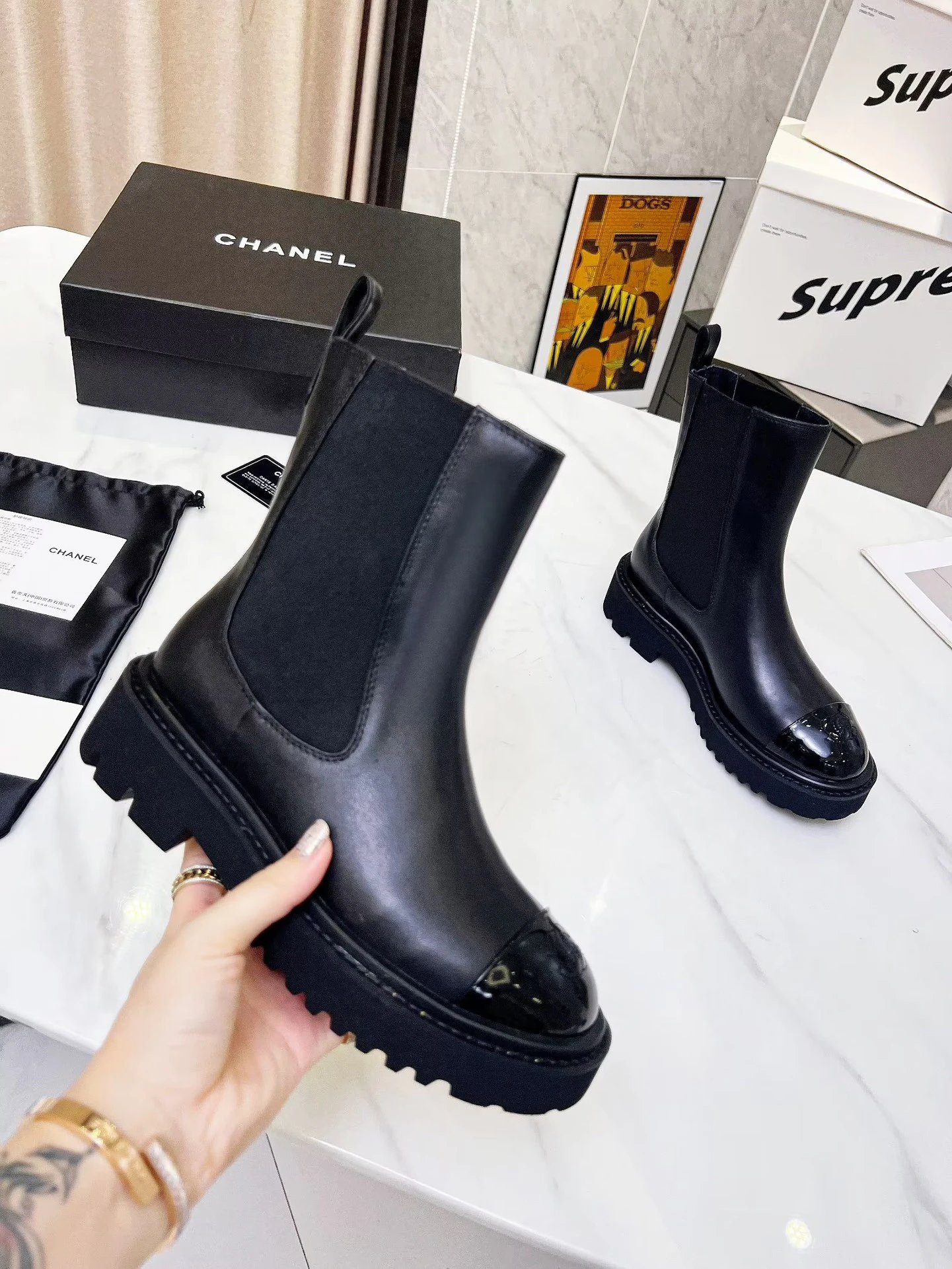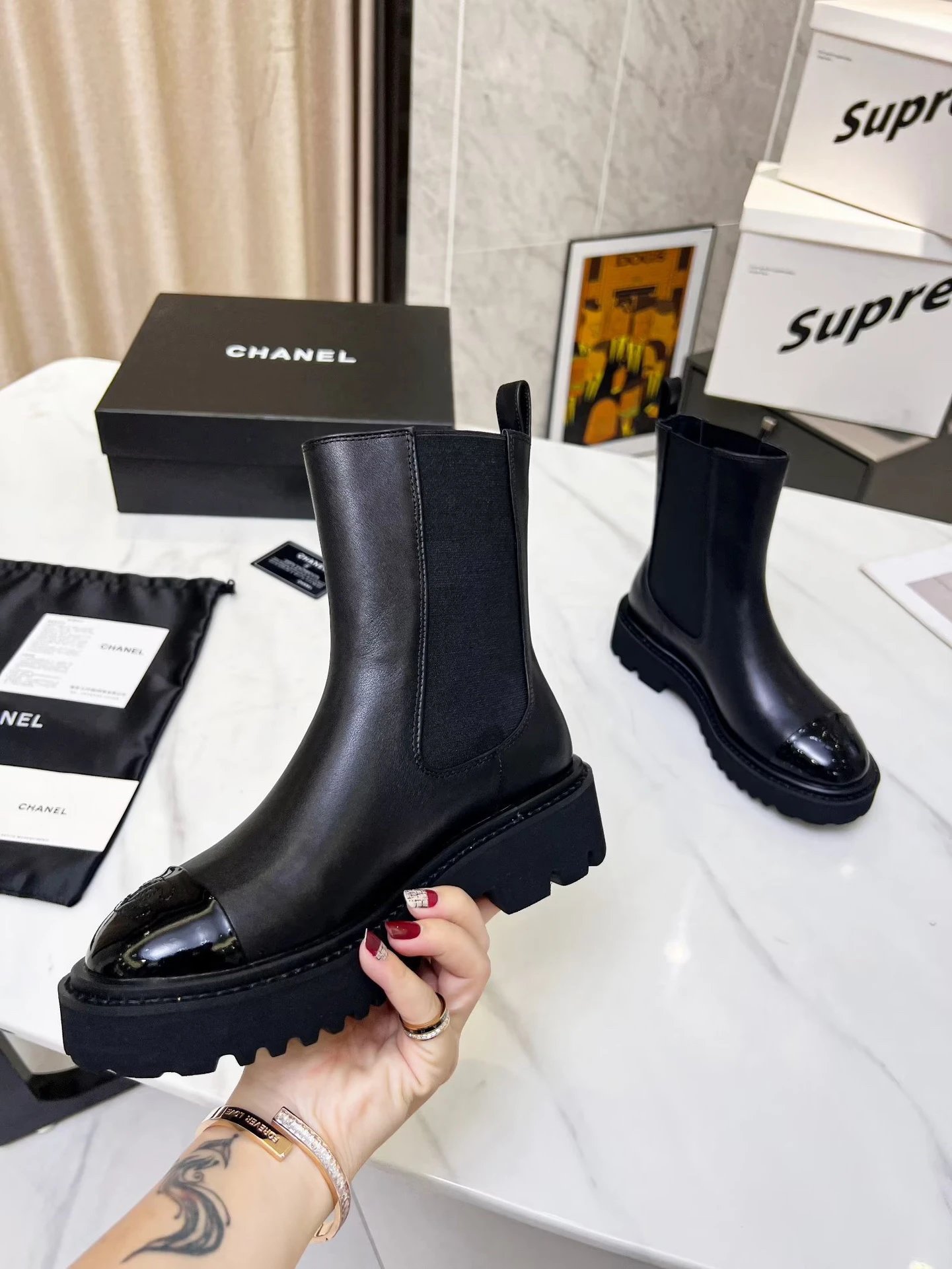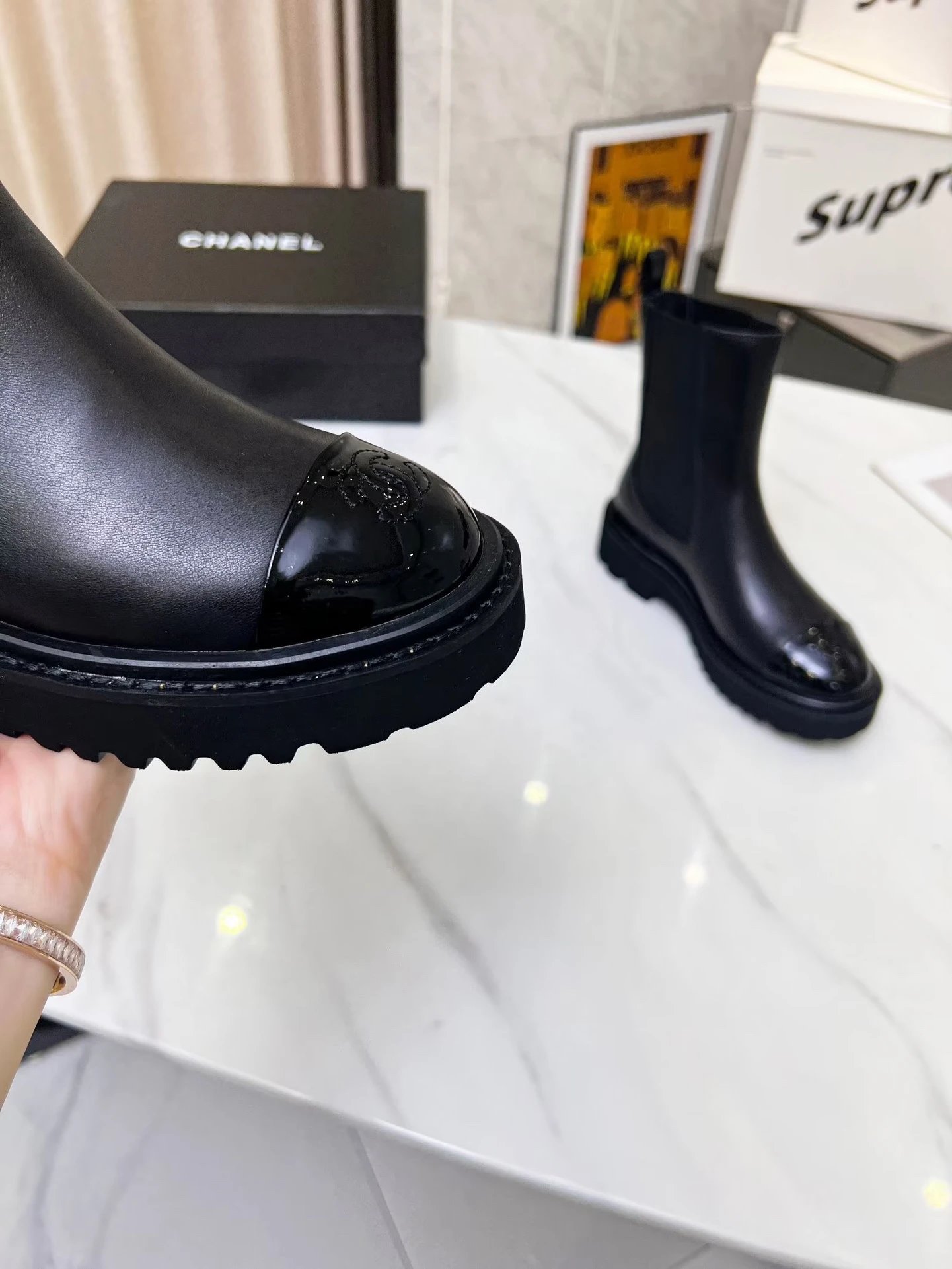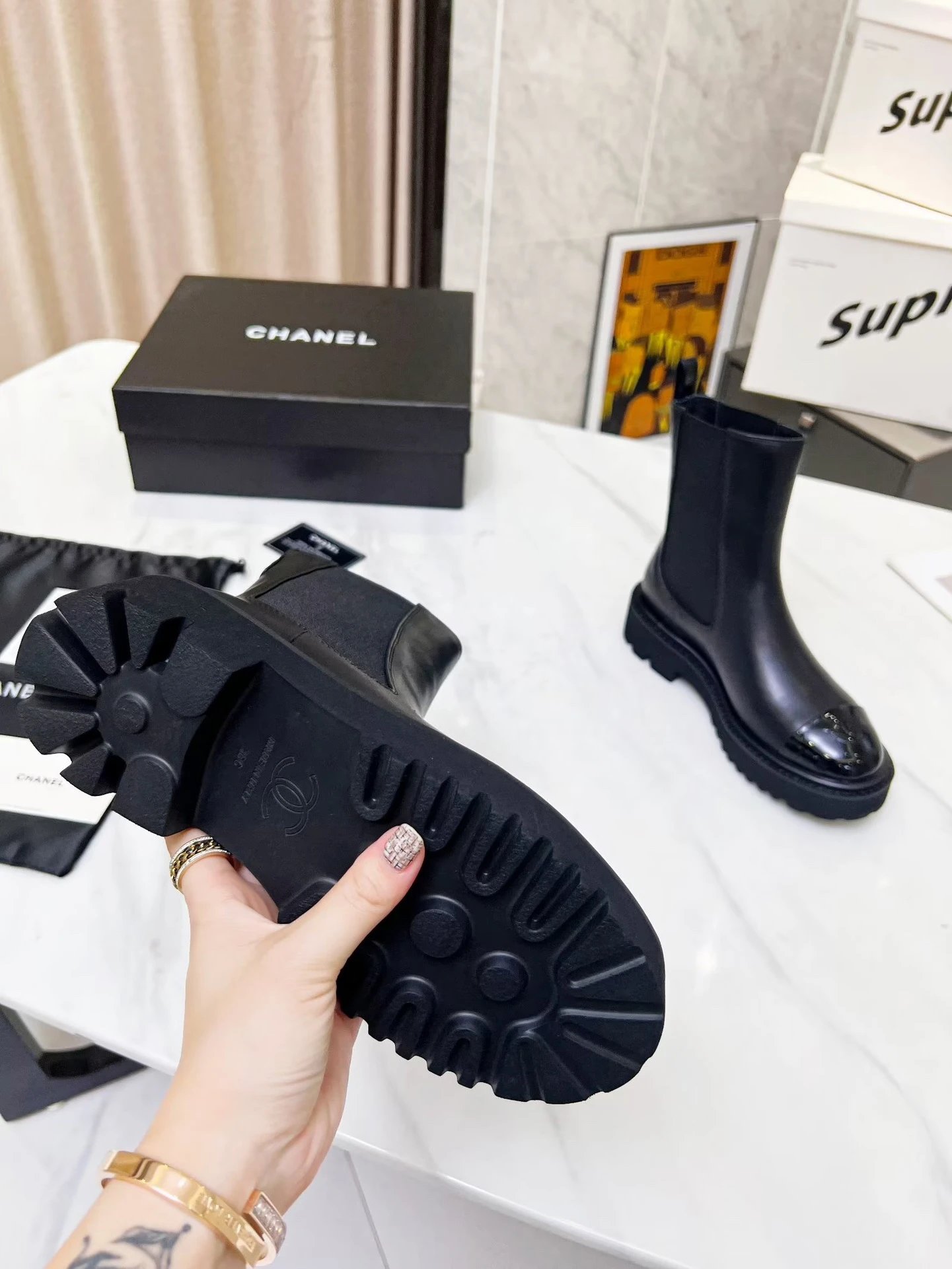 Chanel Fall Winter New Black Ankle Boots (original mold). Double side elastic for easy slip-on, toe logo embroidery.