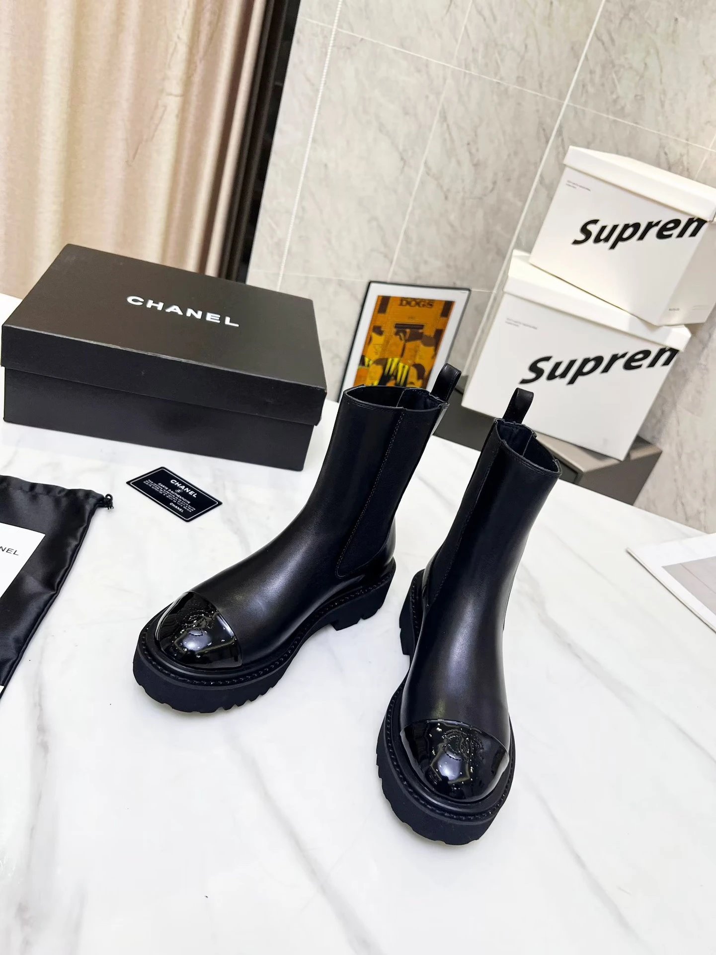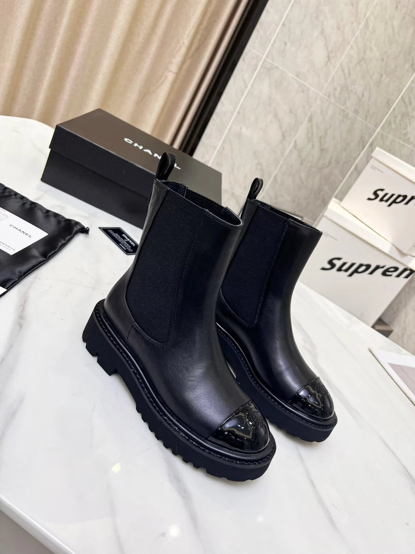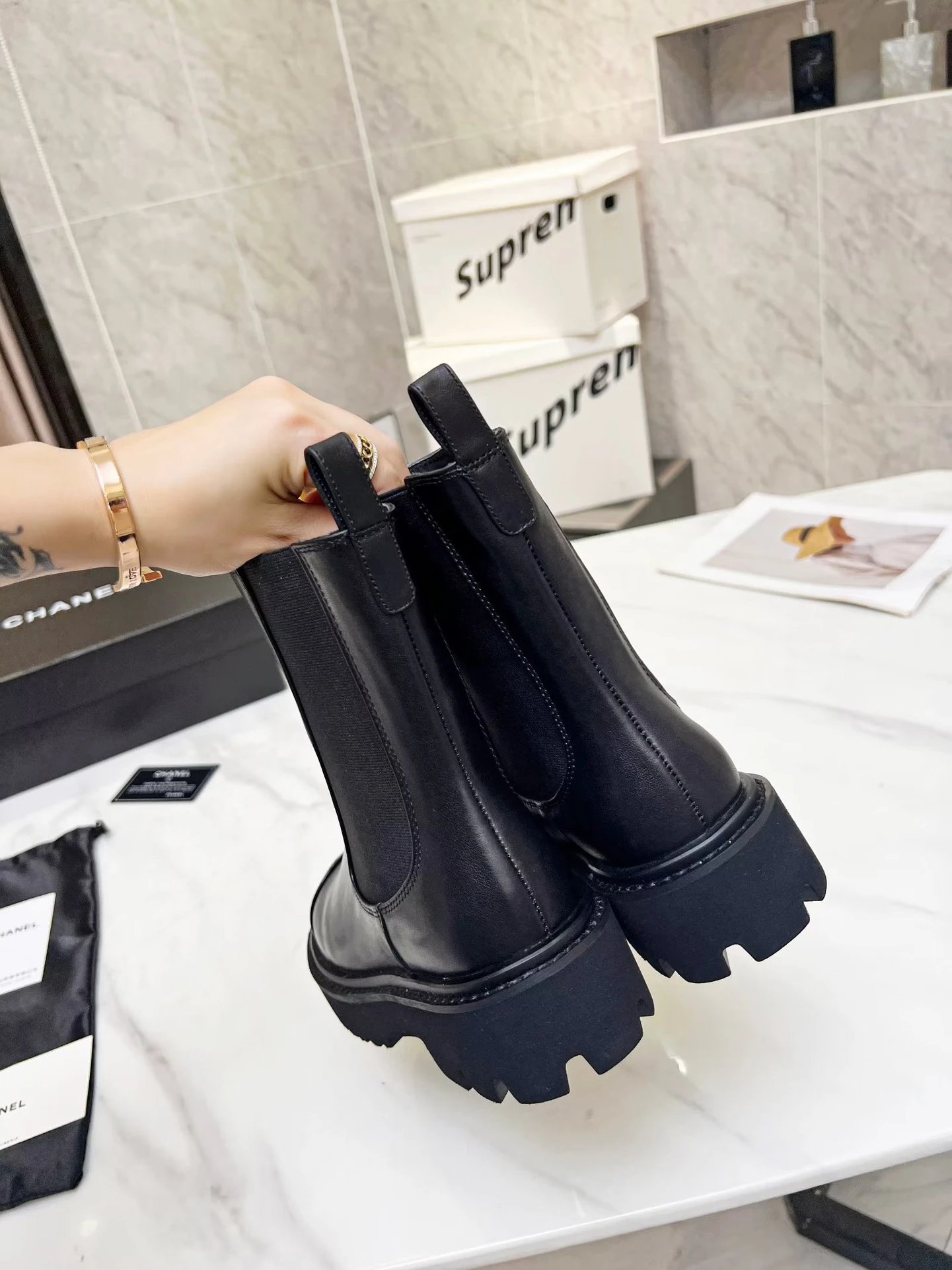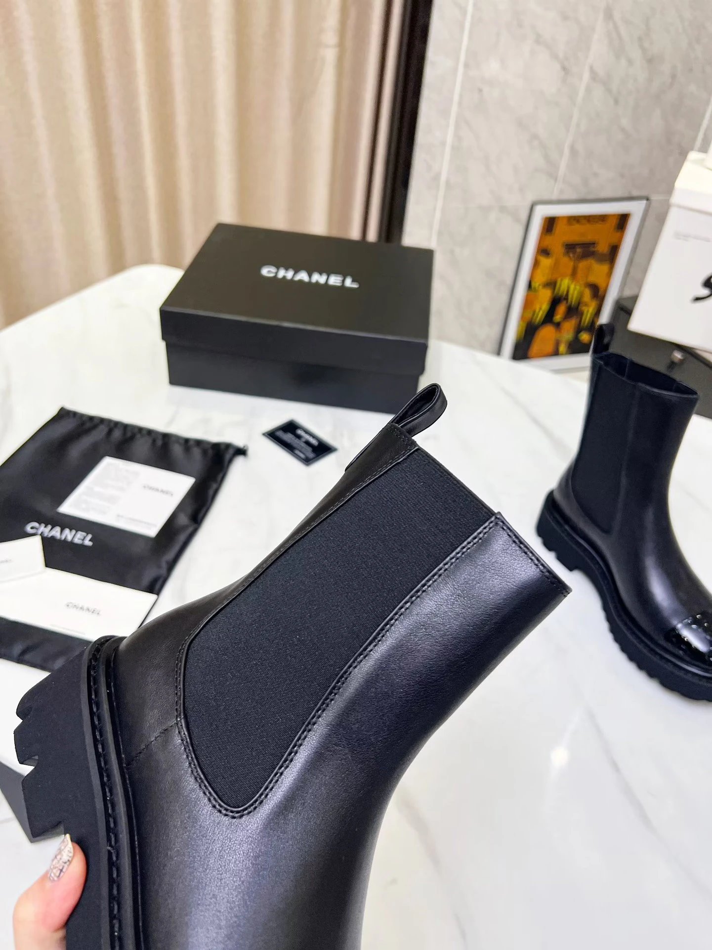 Chanel Fall Winter New Black Ankle Boots (original mold). Double side elastic for easy slip-on, toe logo embroidery.