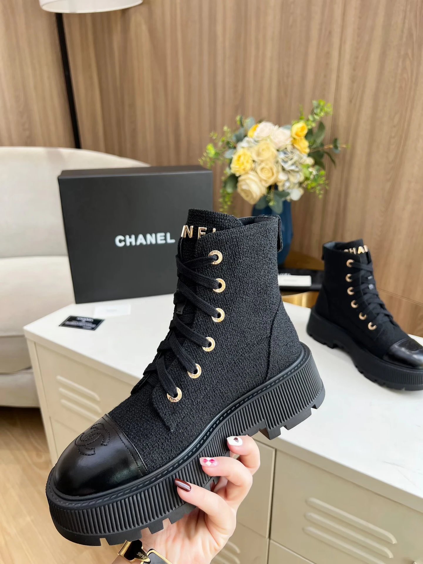 Chanel Fall Winter New Ankle Boots feature original mold design, easy-to-wear lace-up style, embroidered logo on toe & metal logo on tongue.