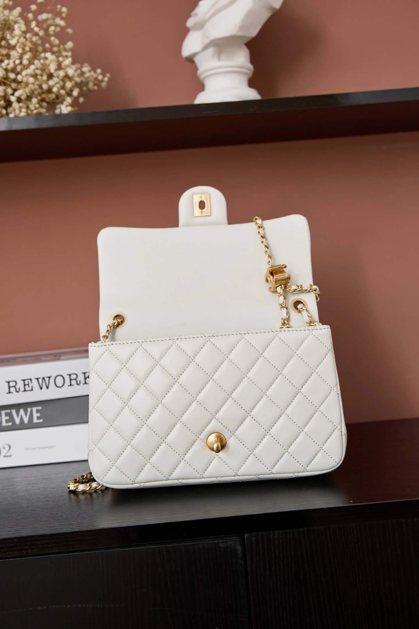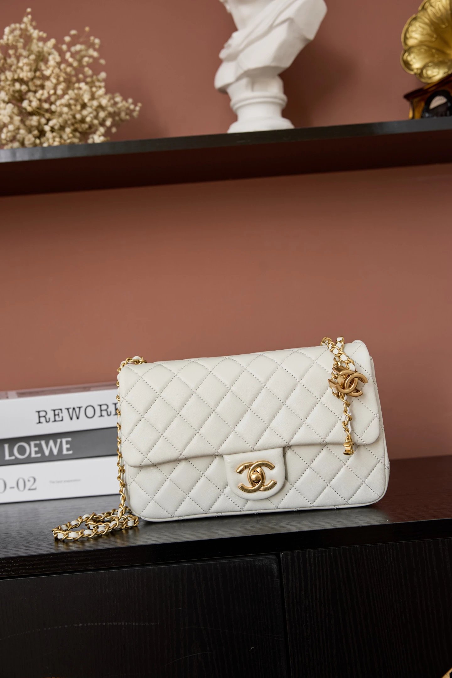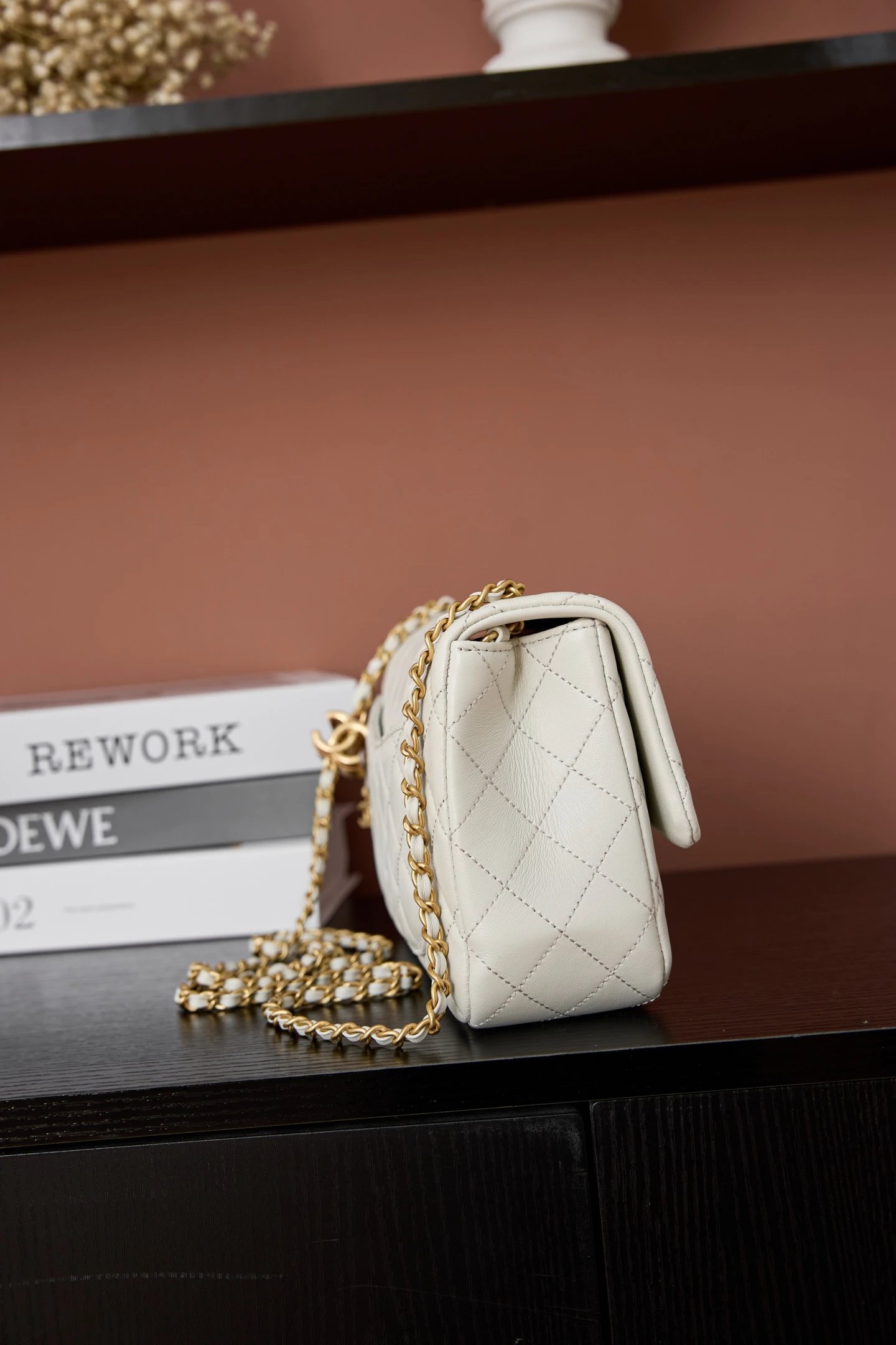 Retro hardware, adjustable chain, and square shape allow single-shoulder, crossbody, or hand carry.