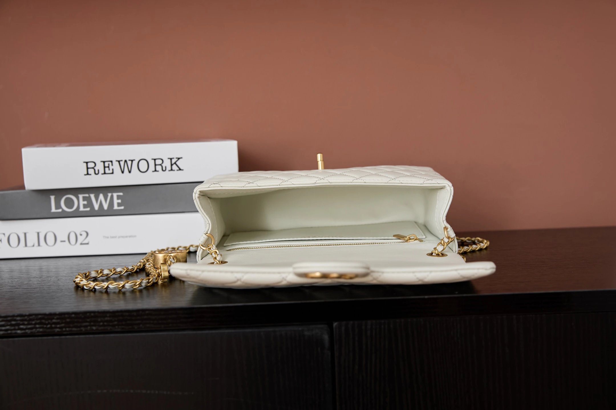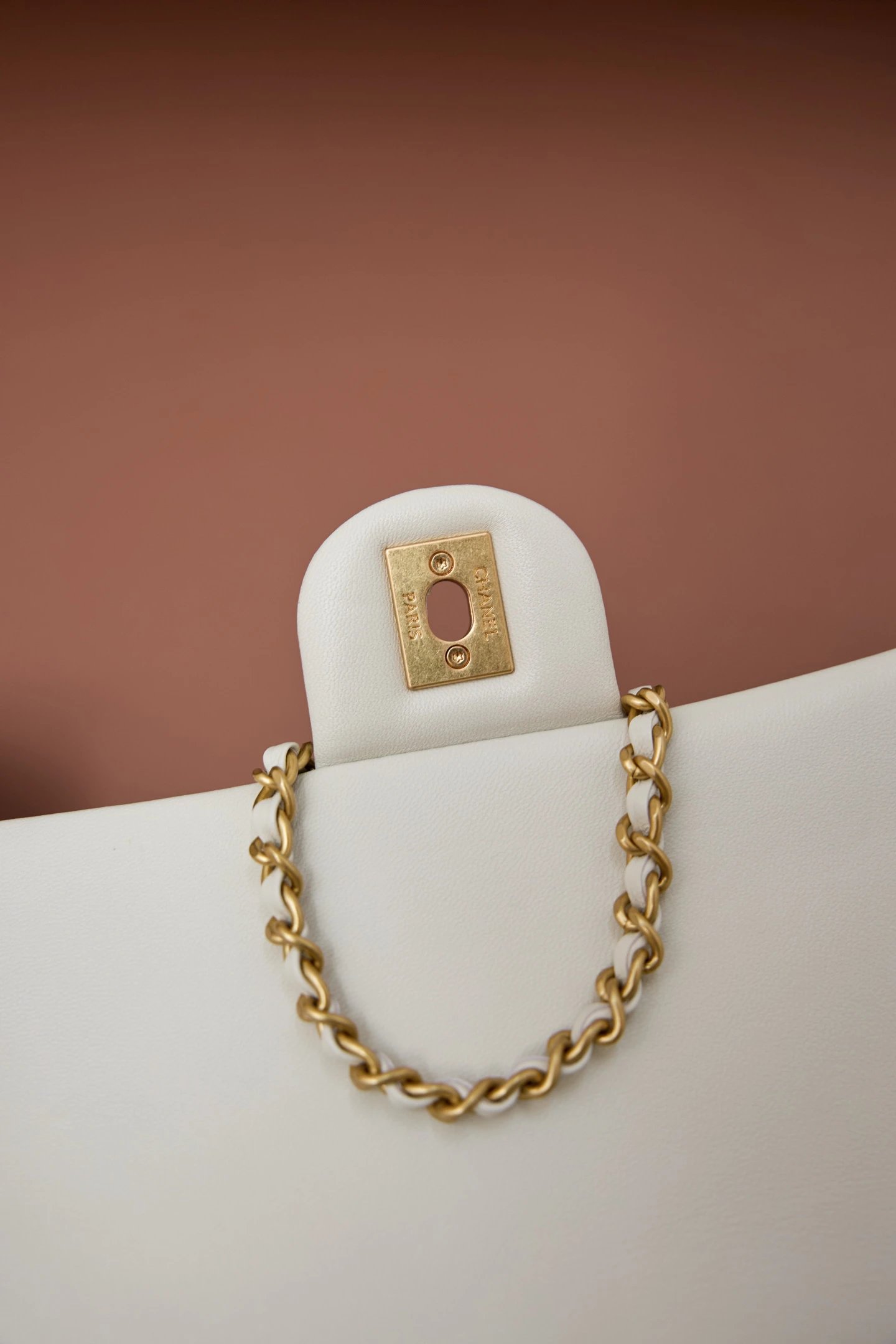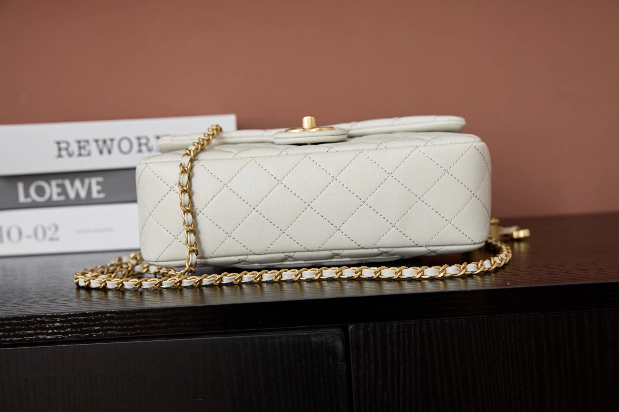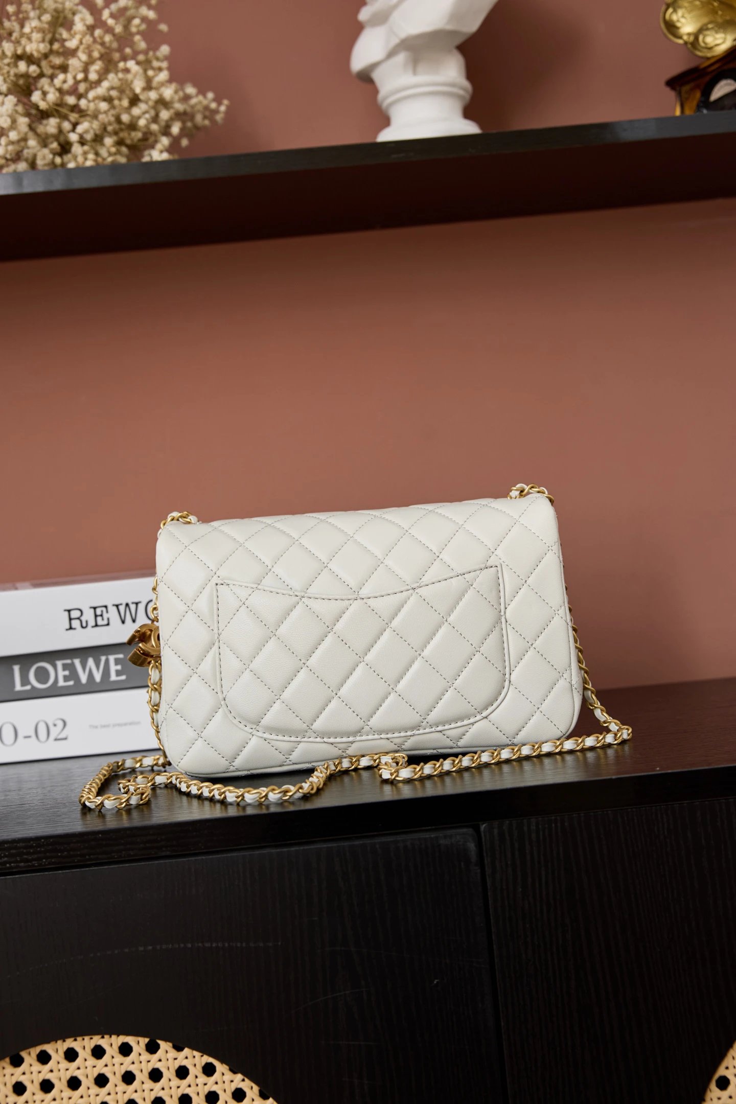 Retro hardware, adjustable chain, and square shape allow single-shoulder, crossbody, or hand carry.