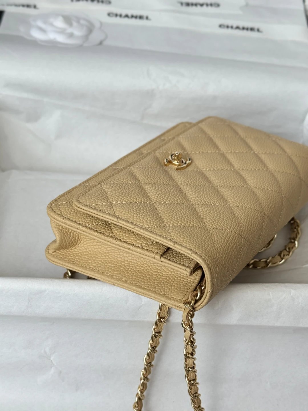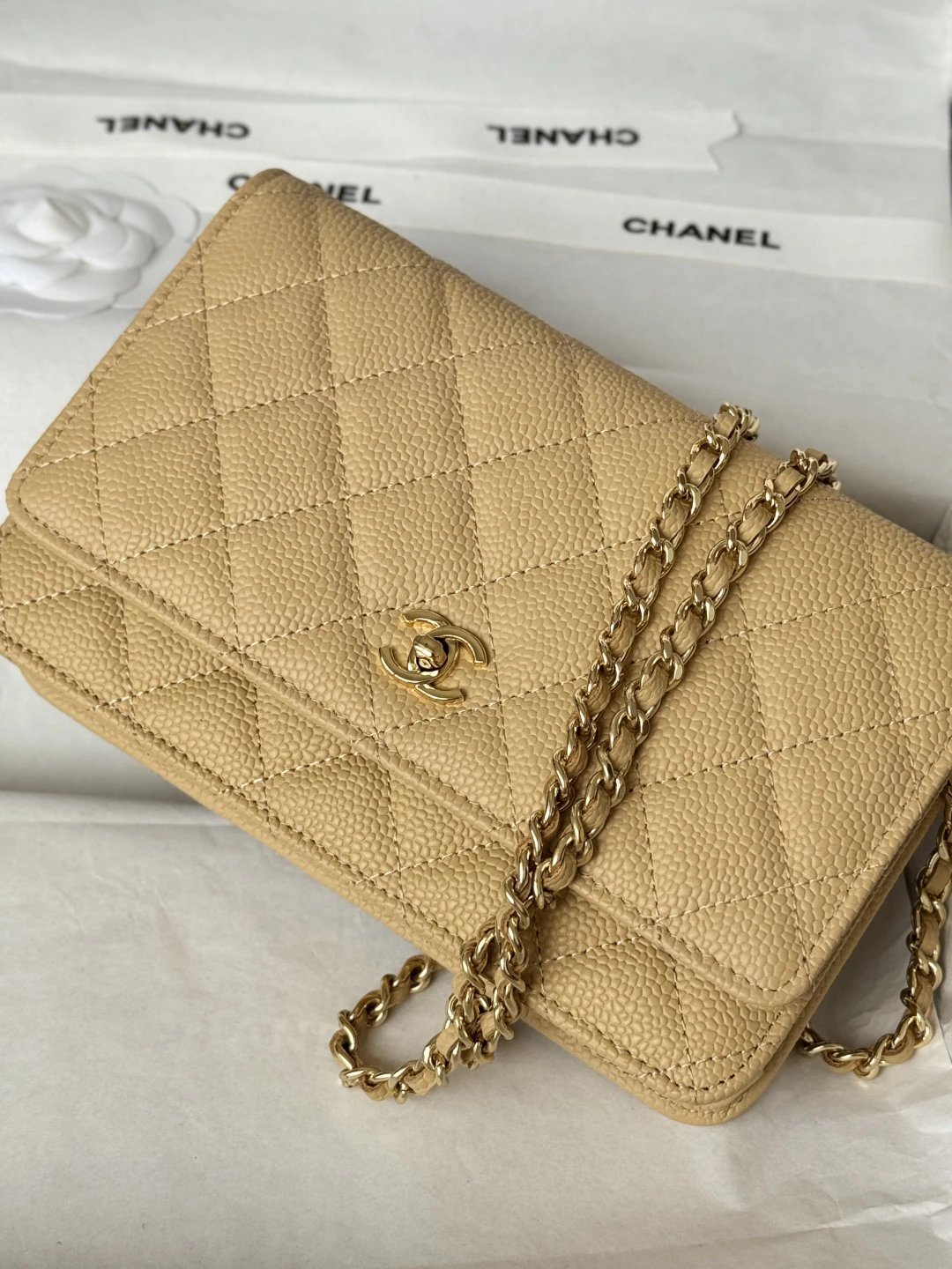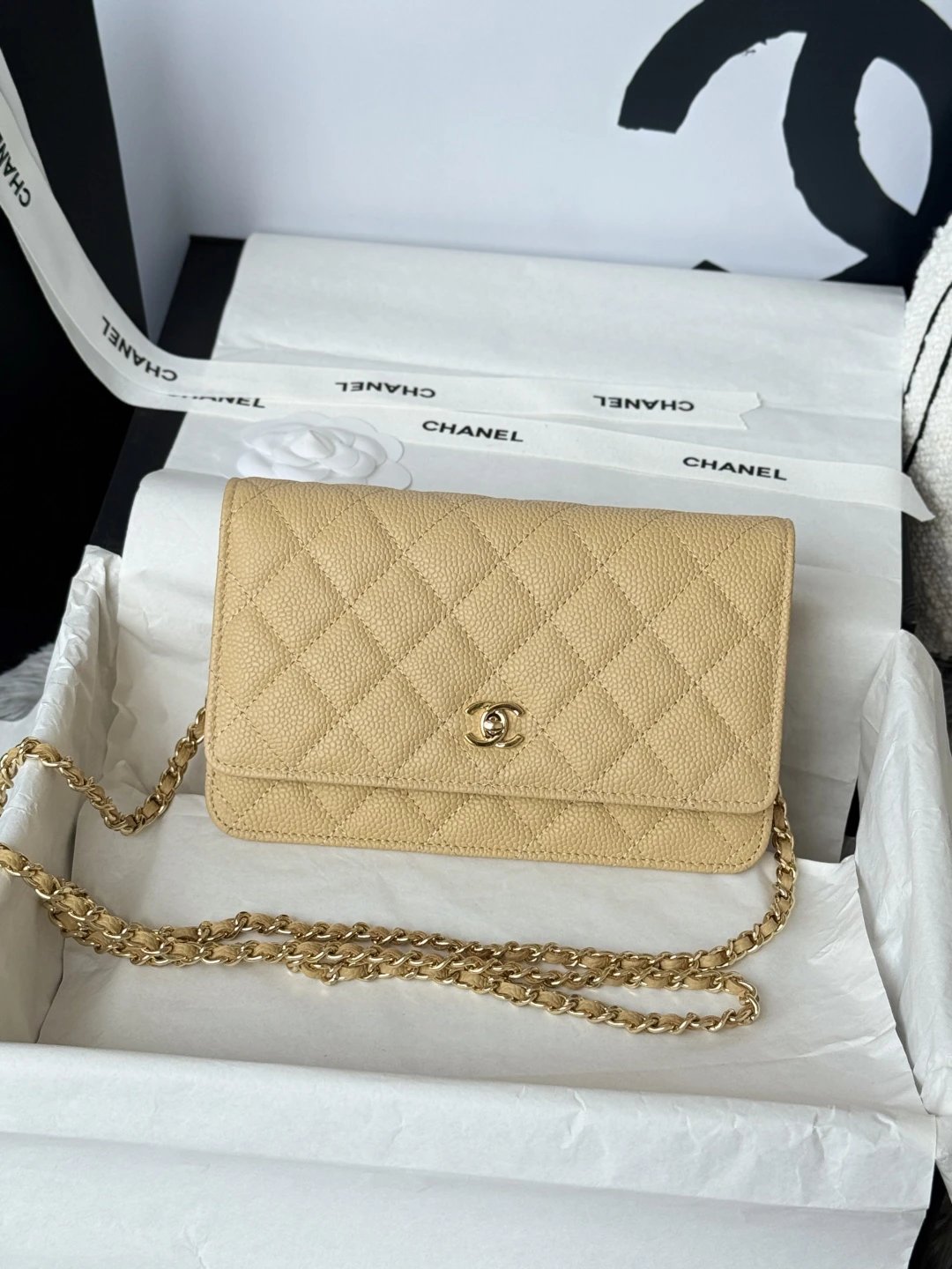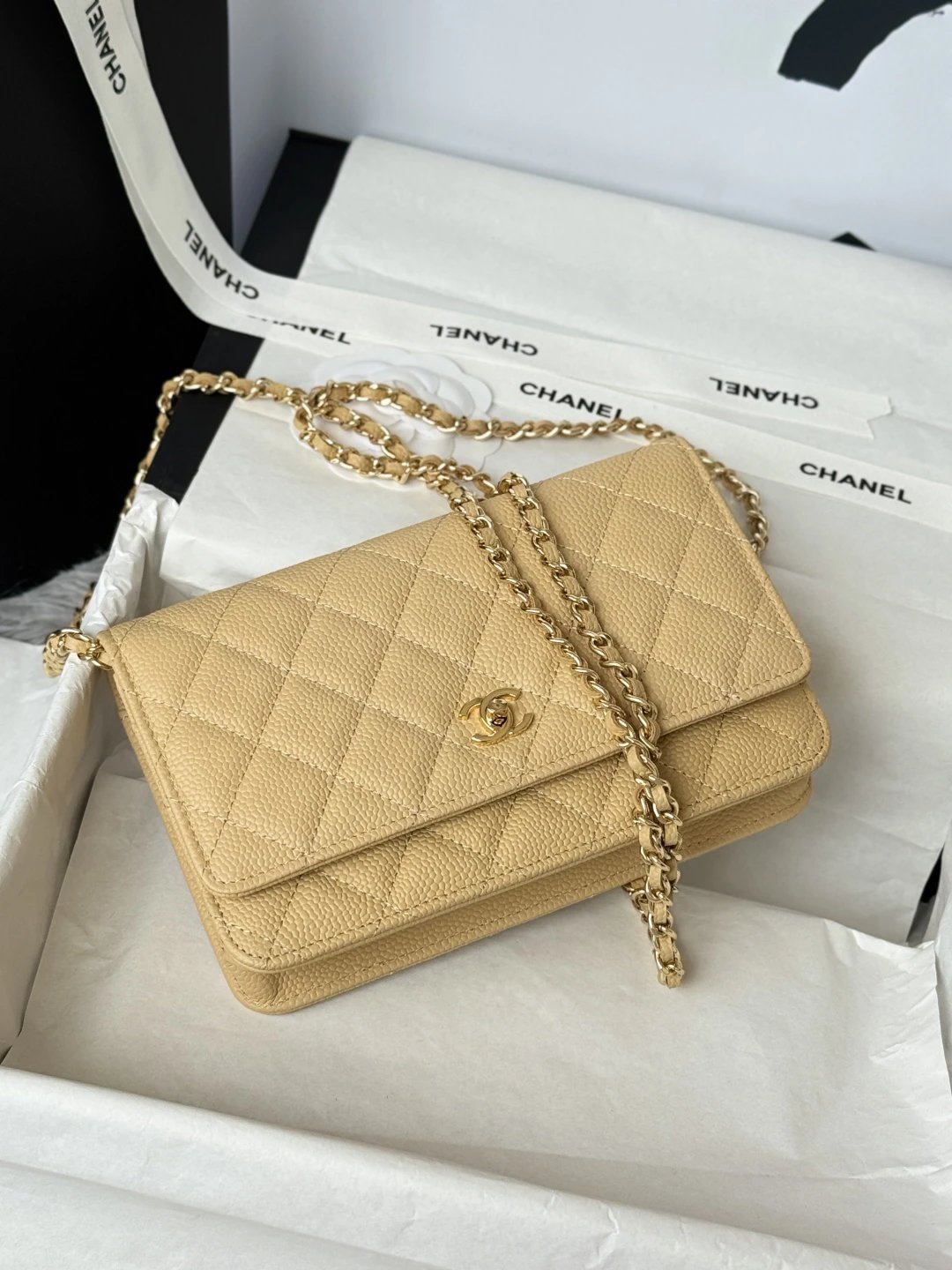 Chanel WOC Classic Multi-Way Handbag uses iconic caviar leather, square shape, multiple carry ways & versatile daily style. Quilted design is full but natural.
