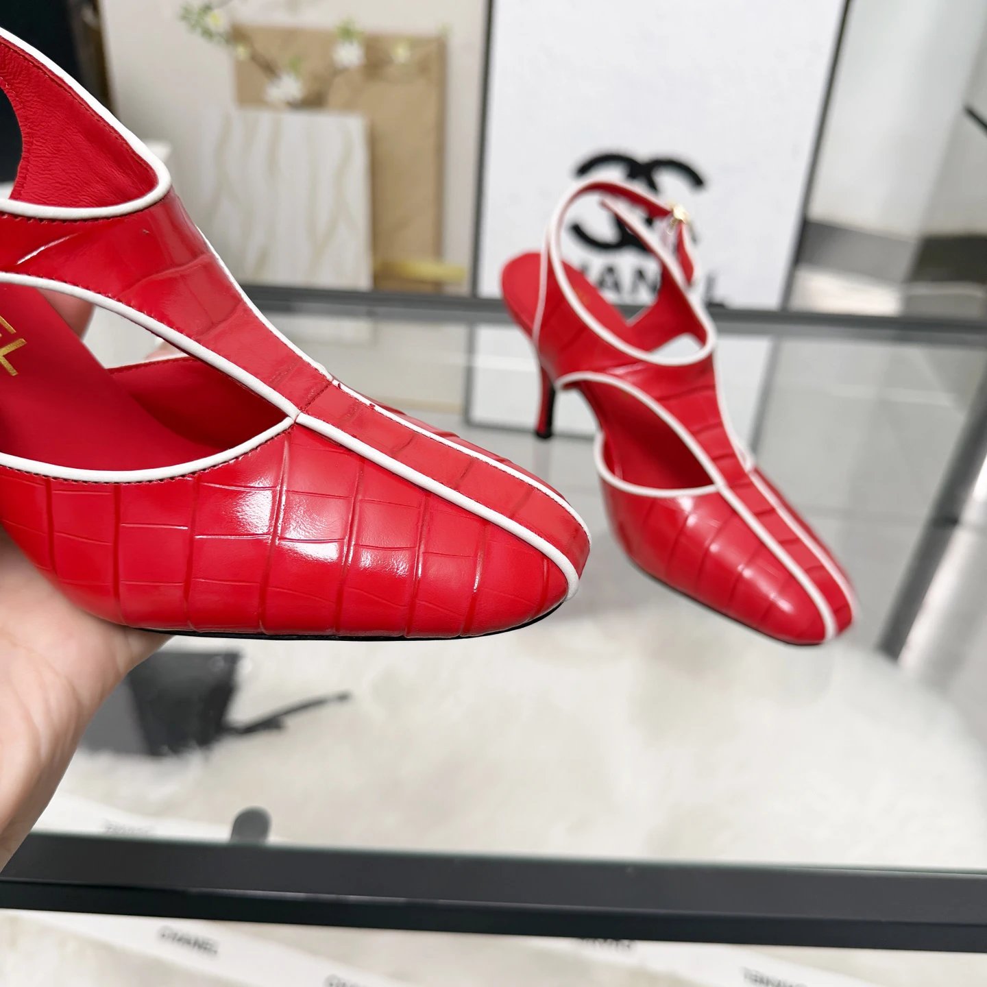 Materials: stone-grain calfskin + patent leather, sheepskin lining, genuine leather outsole; heel 8cm.