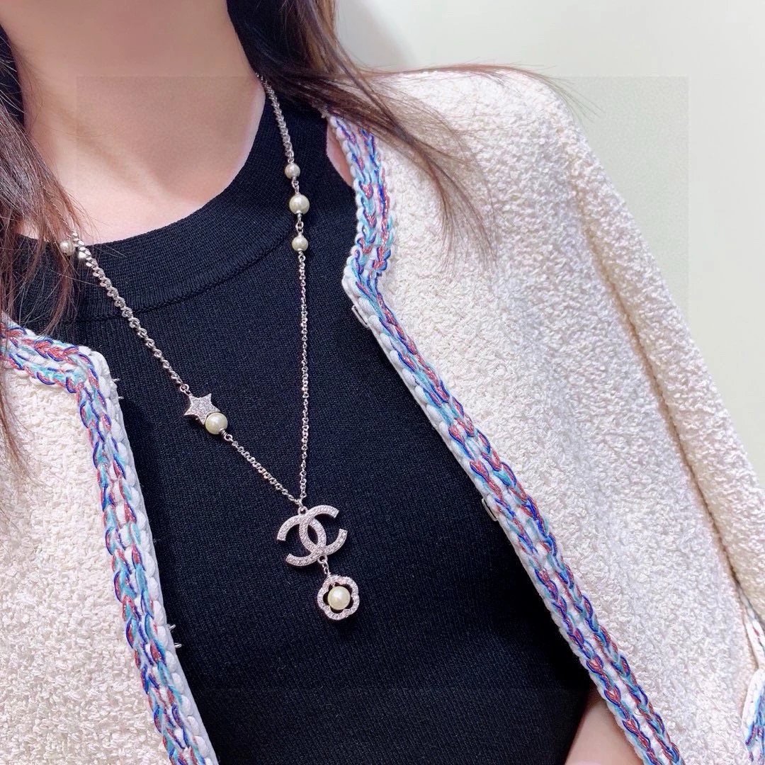 Crystal-embellished camellia design with glass pearls, crystal double C chain & pearl/star accents. High-quality, elegant & refined for any style.