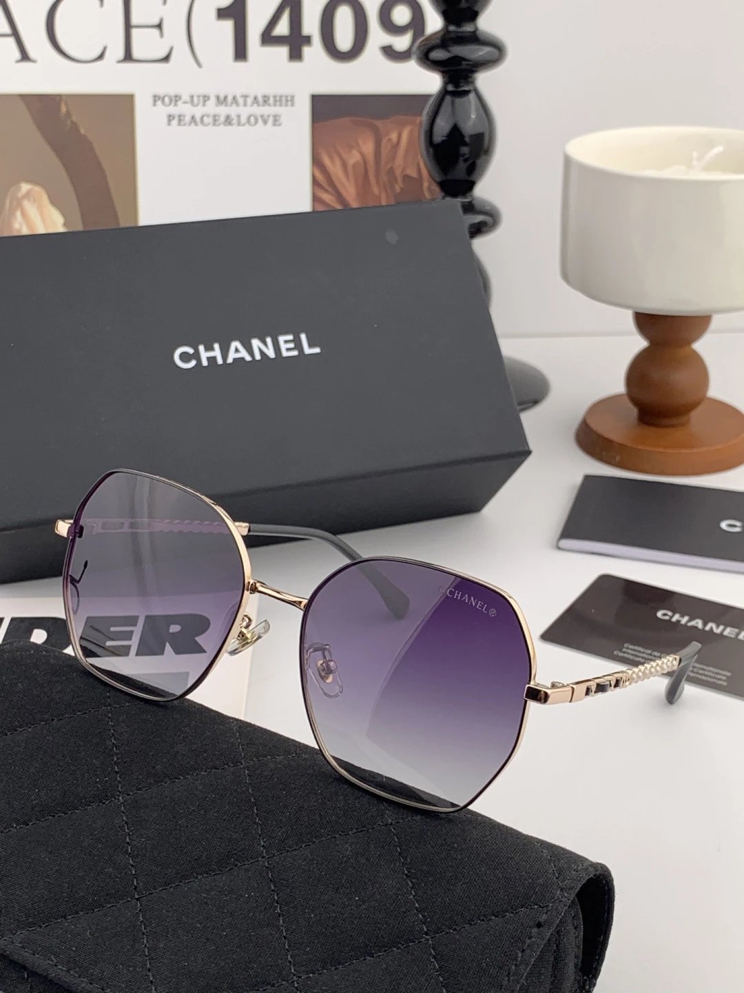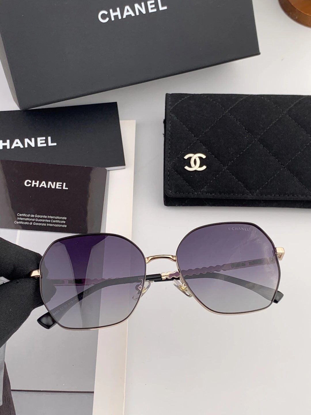 Chanel new square sunglasses feature unique charm & avant-garde style for spring-summer. Classic pearl accents, metal frame, comfortable wear, model CH5640.