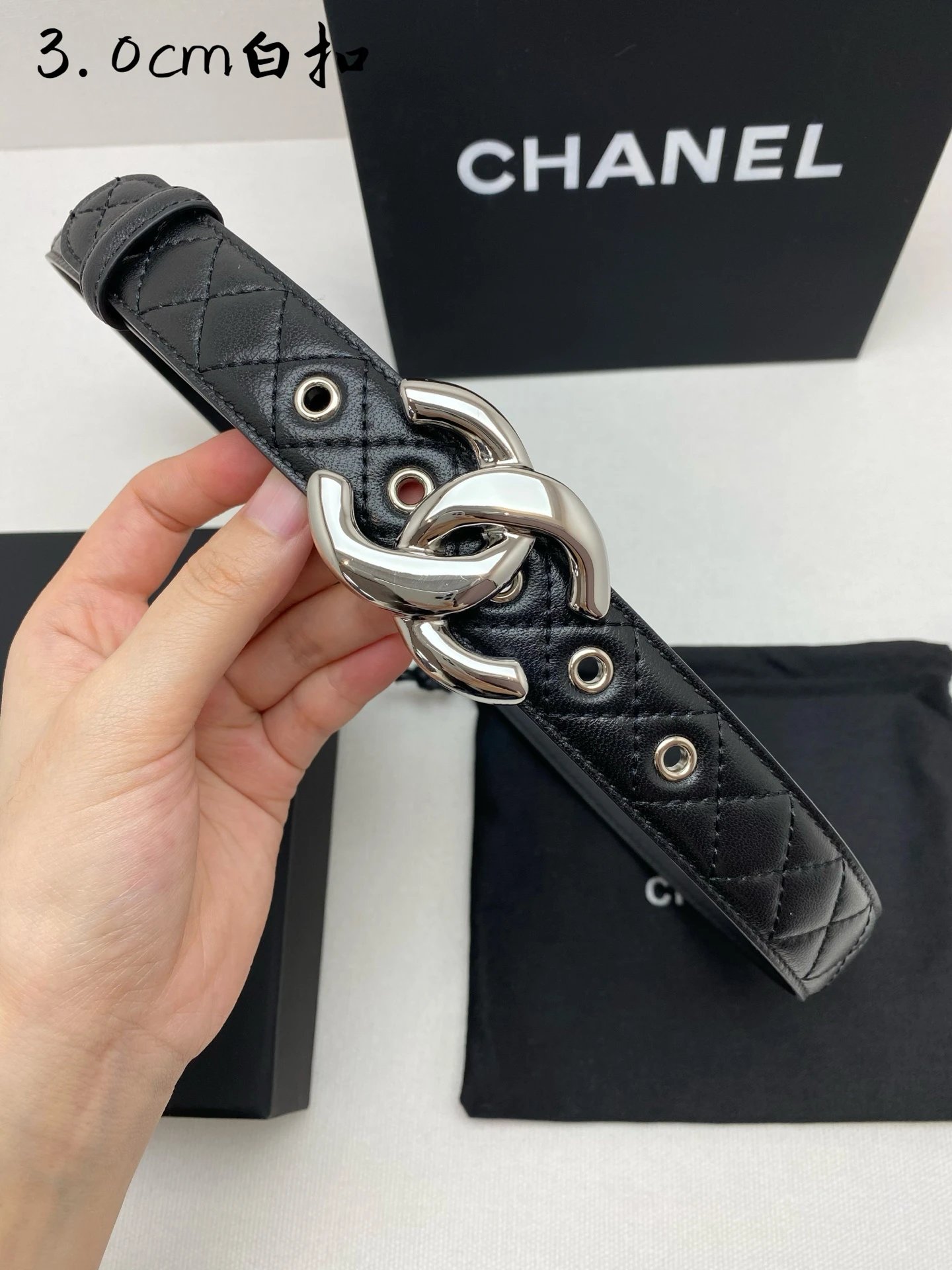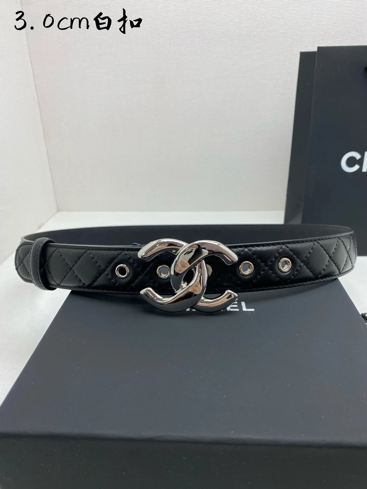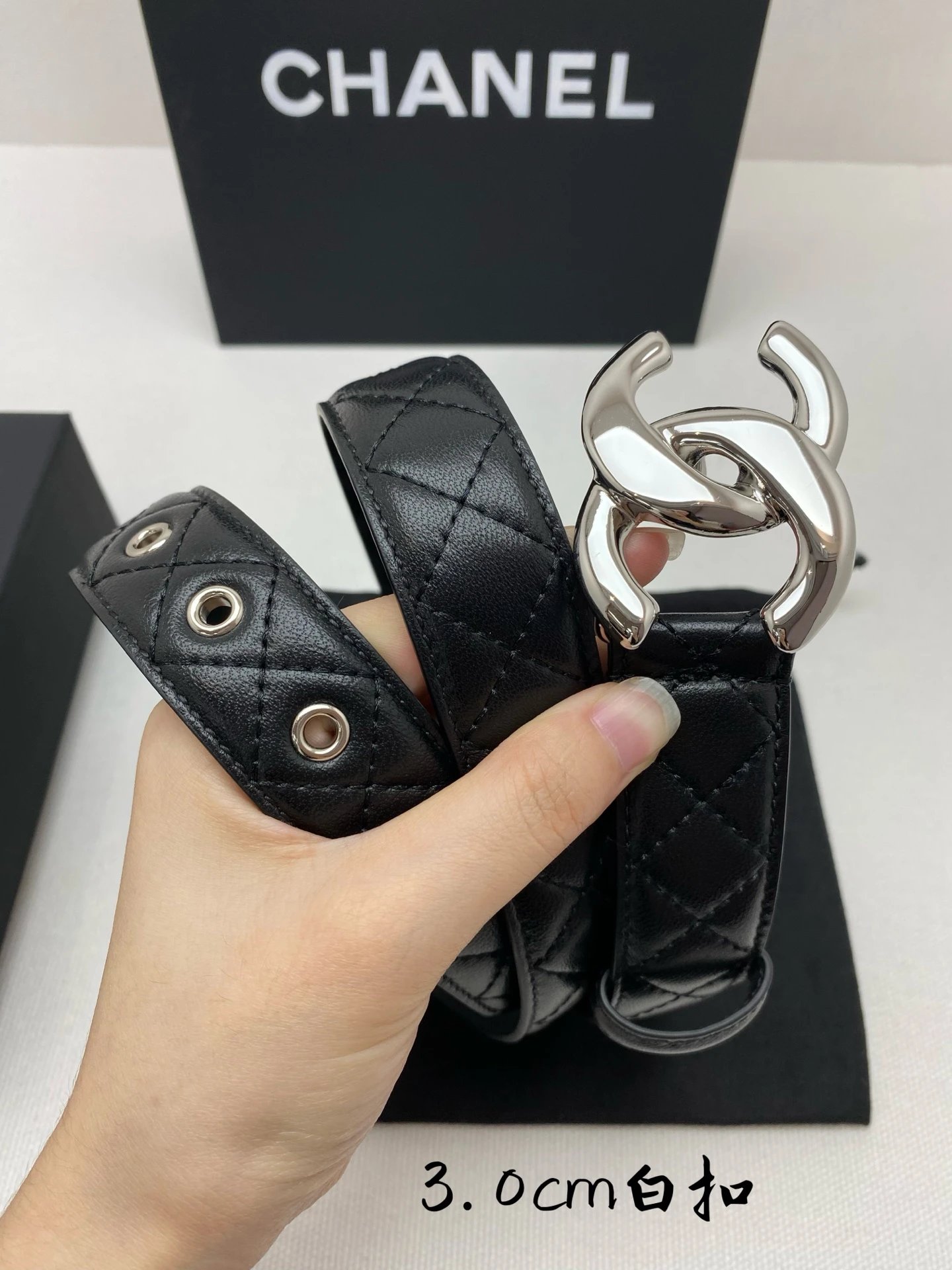 Chanel Logo Leather Belt features CC buckle, brass gold metal, 3.0cm width, soft lambskin, elegant design.
