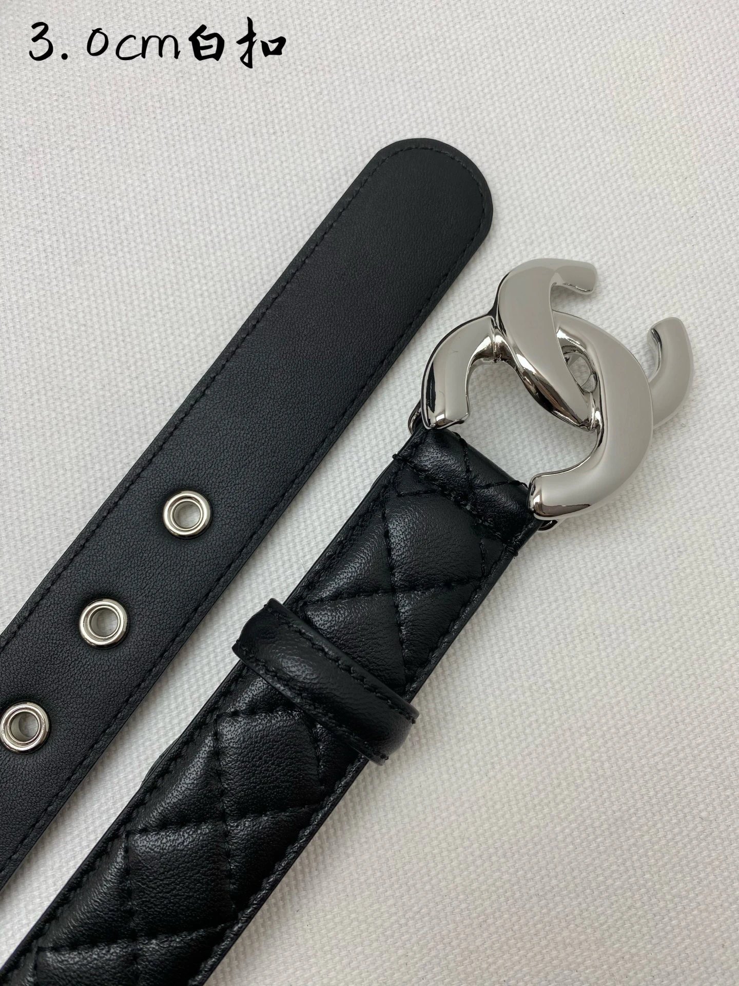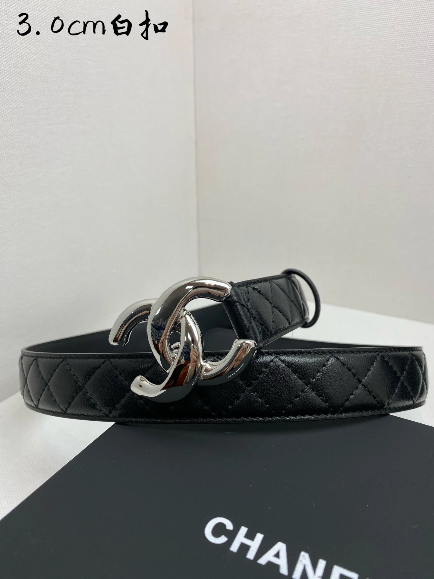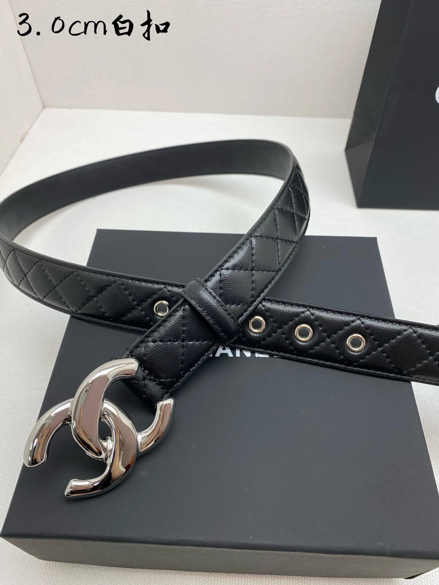 Chanel Logo Leather Belt features CC buckle, brass gold metal, 3.0cm width, soft lambskin, elegant design.