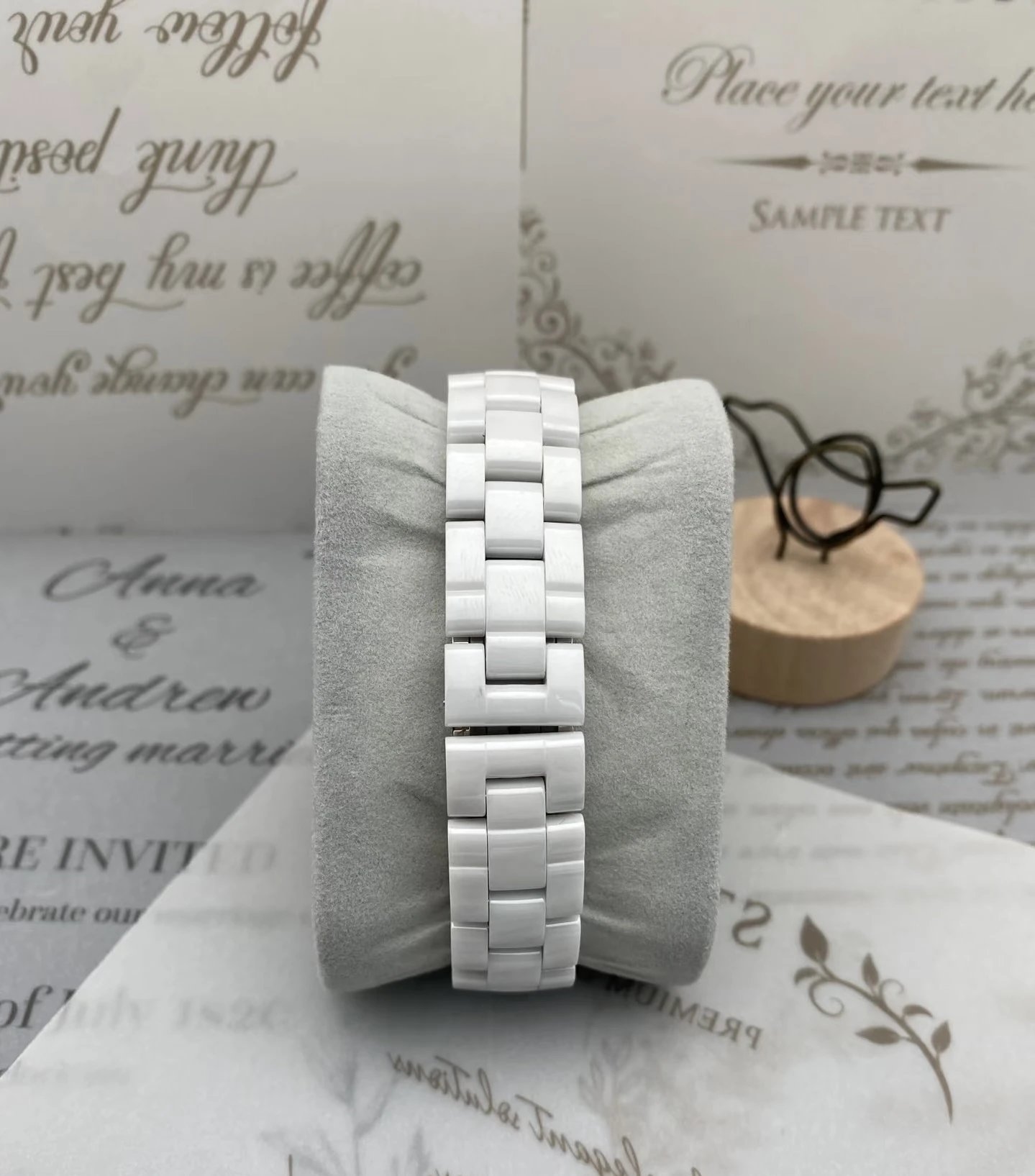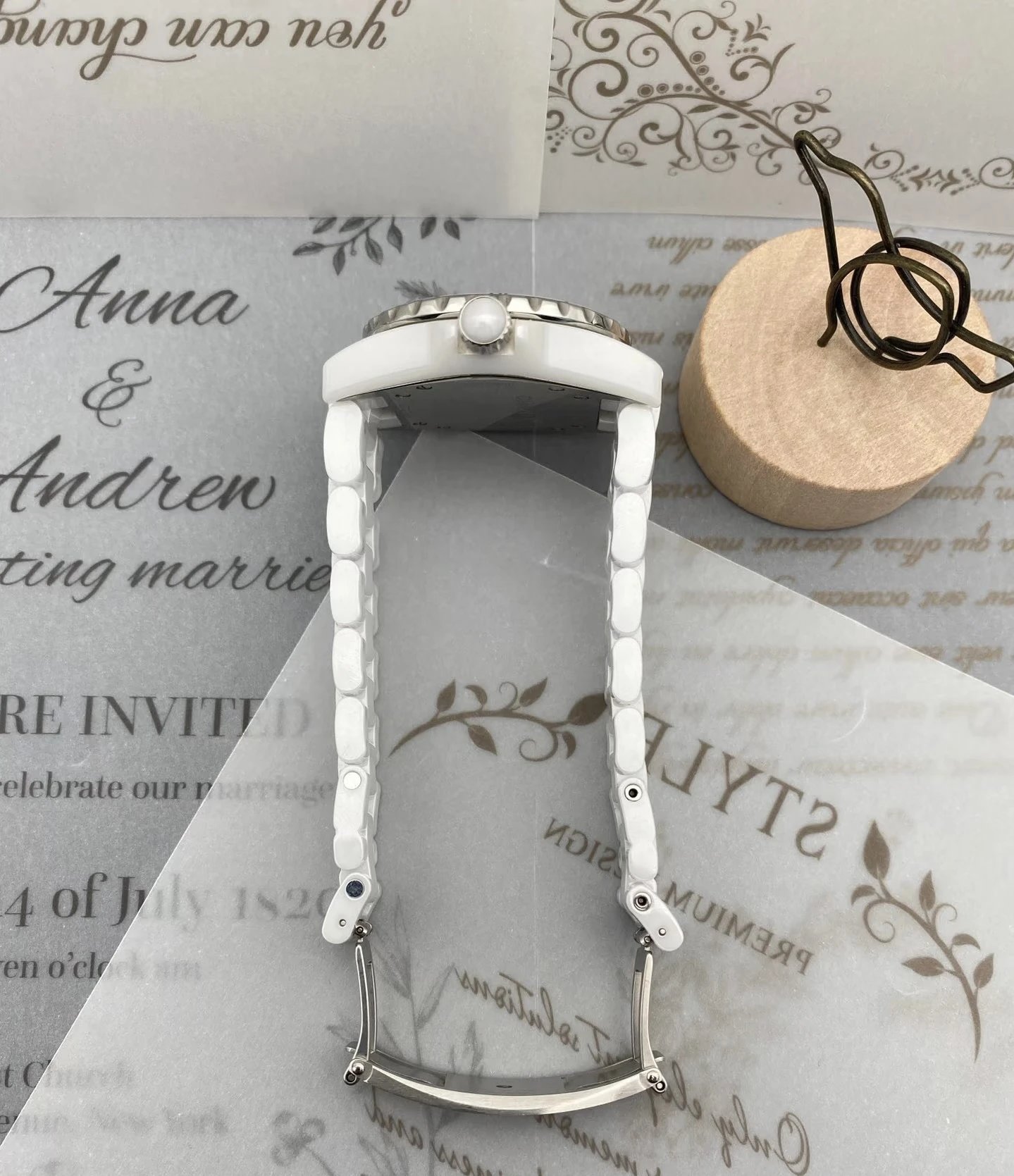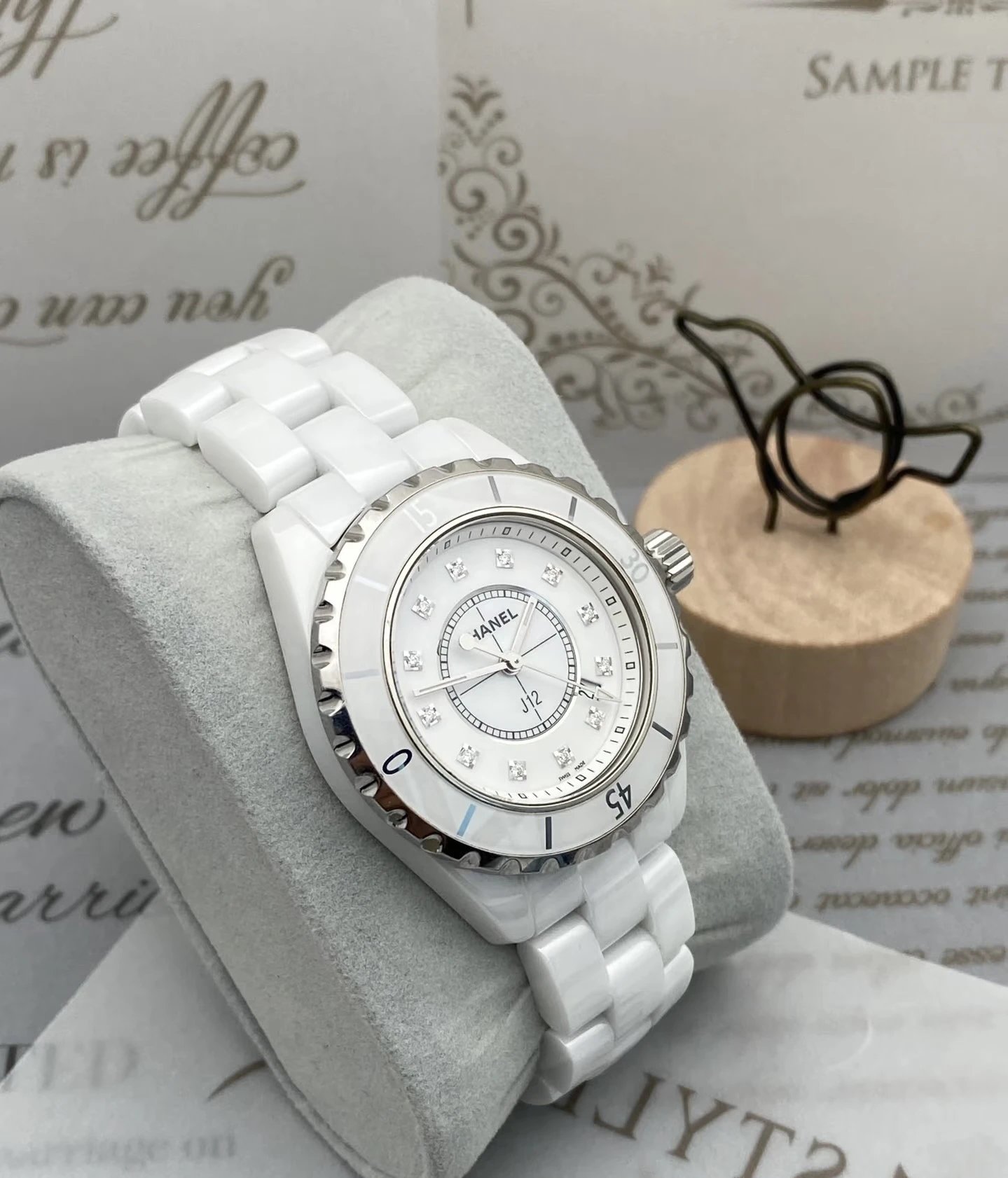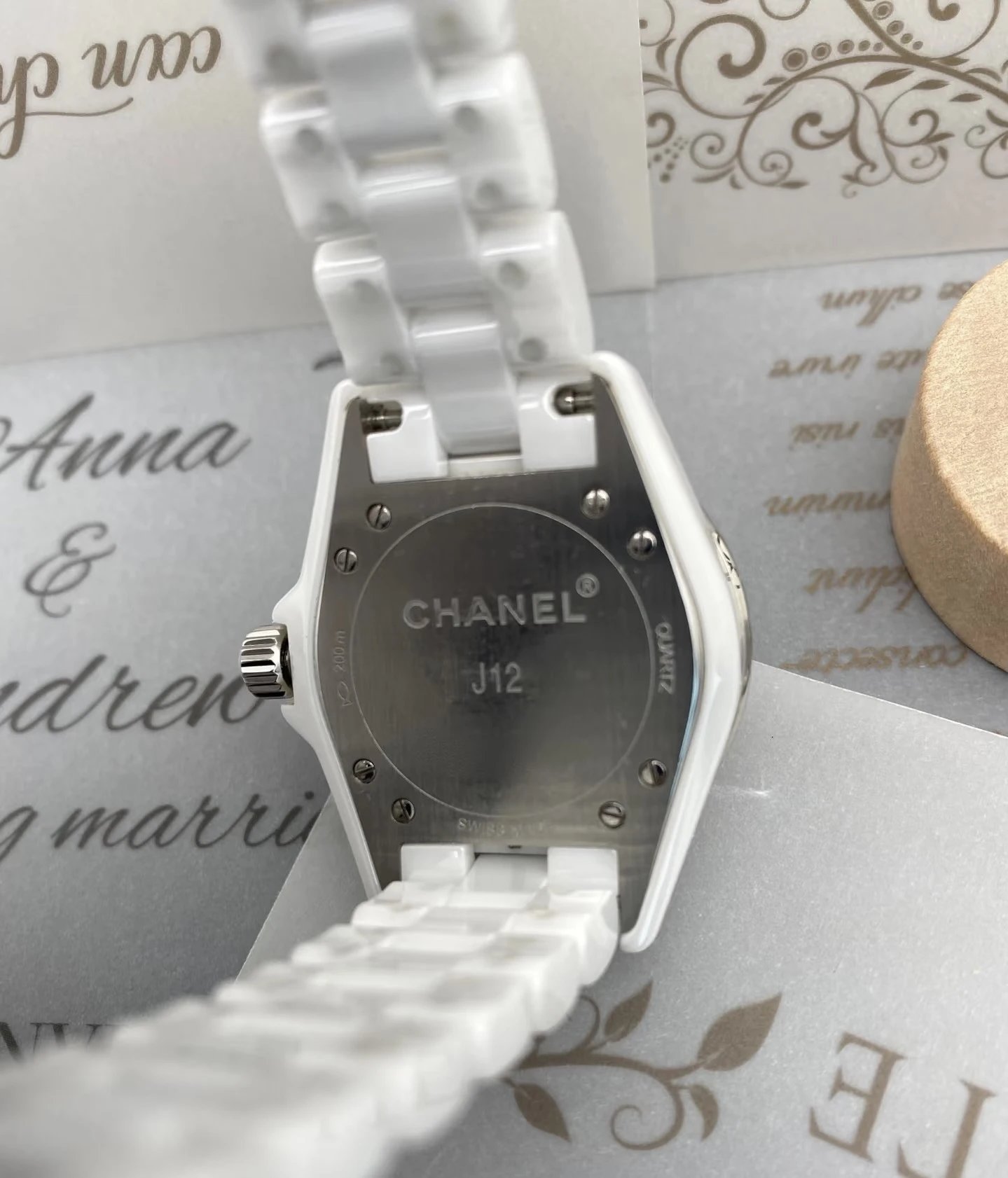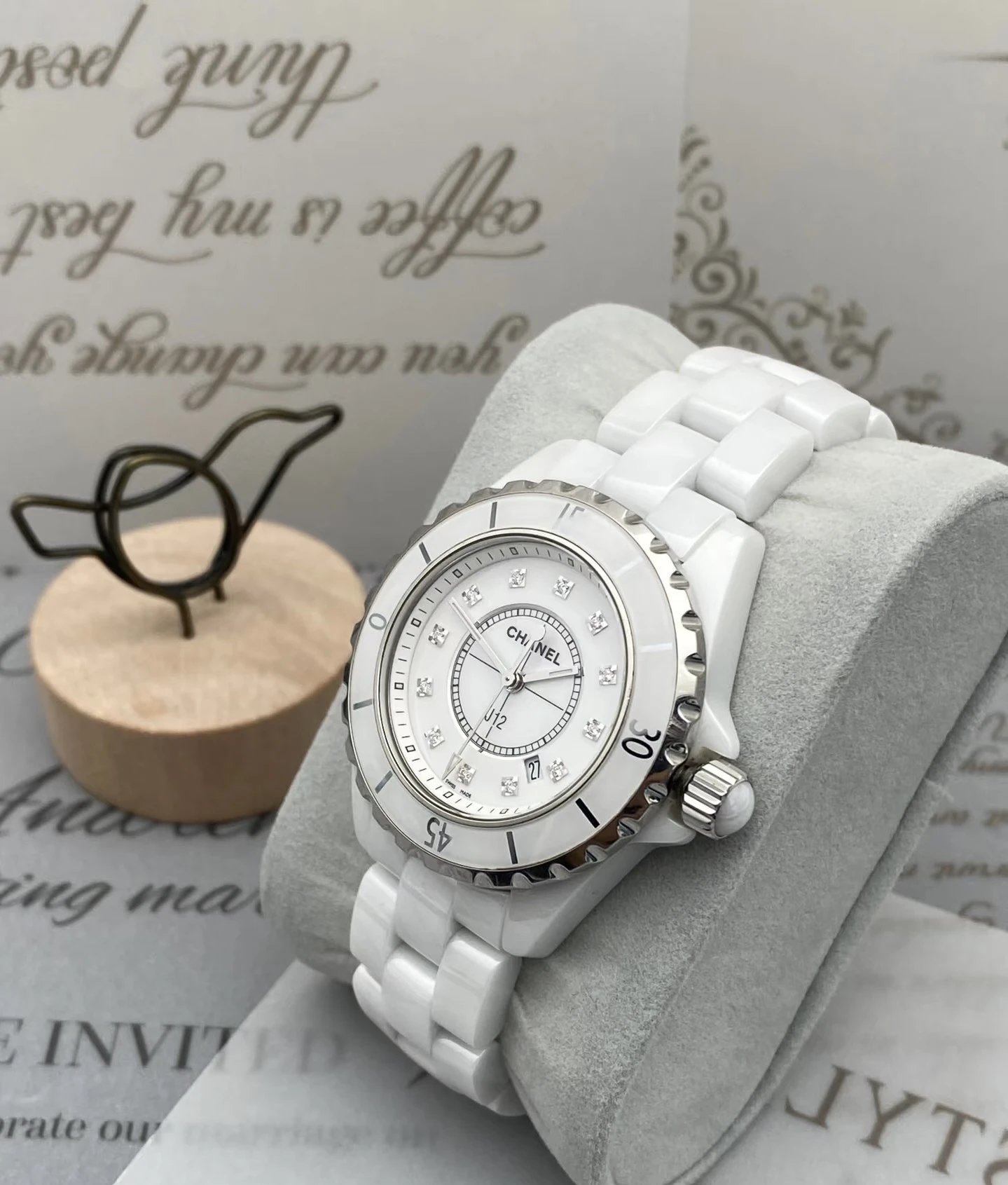 Chanel J12 H1628 Women's Quartz Watch blends modern & classic style. 33mm case, 12 diamond markers, sapphire crystal, white ceramic/steel screw-down crown. Single watch, no accessories.