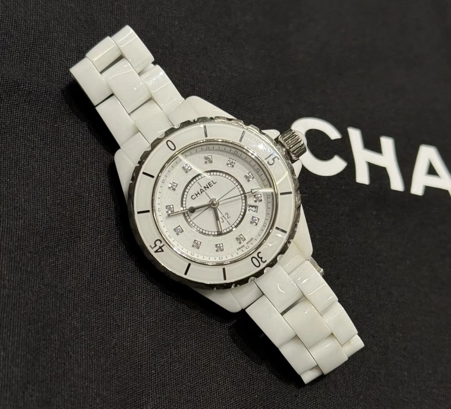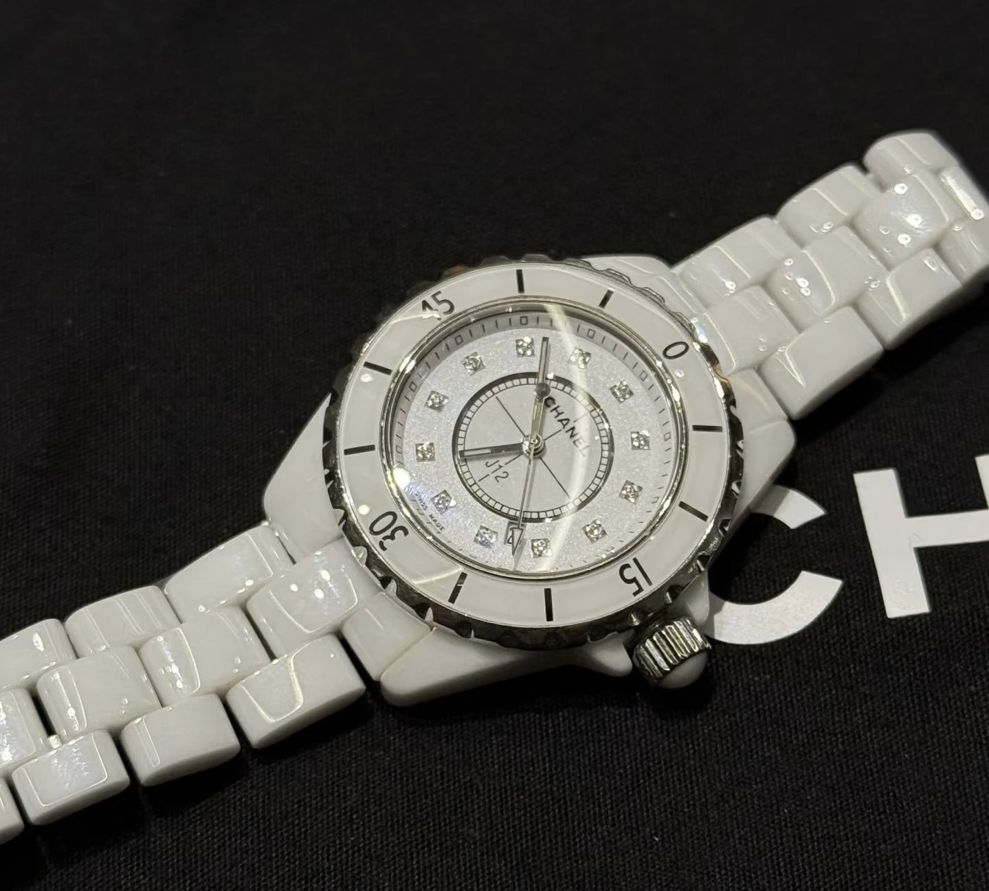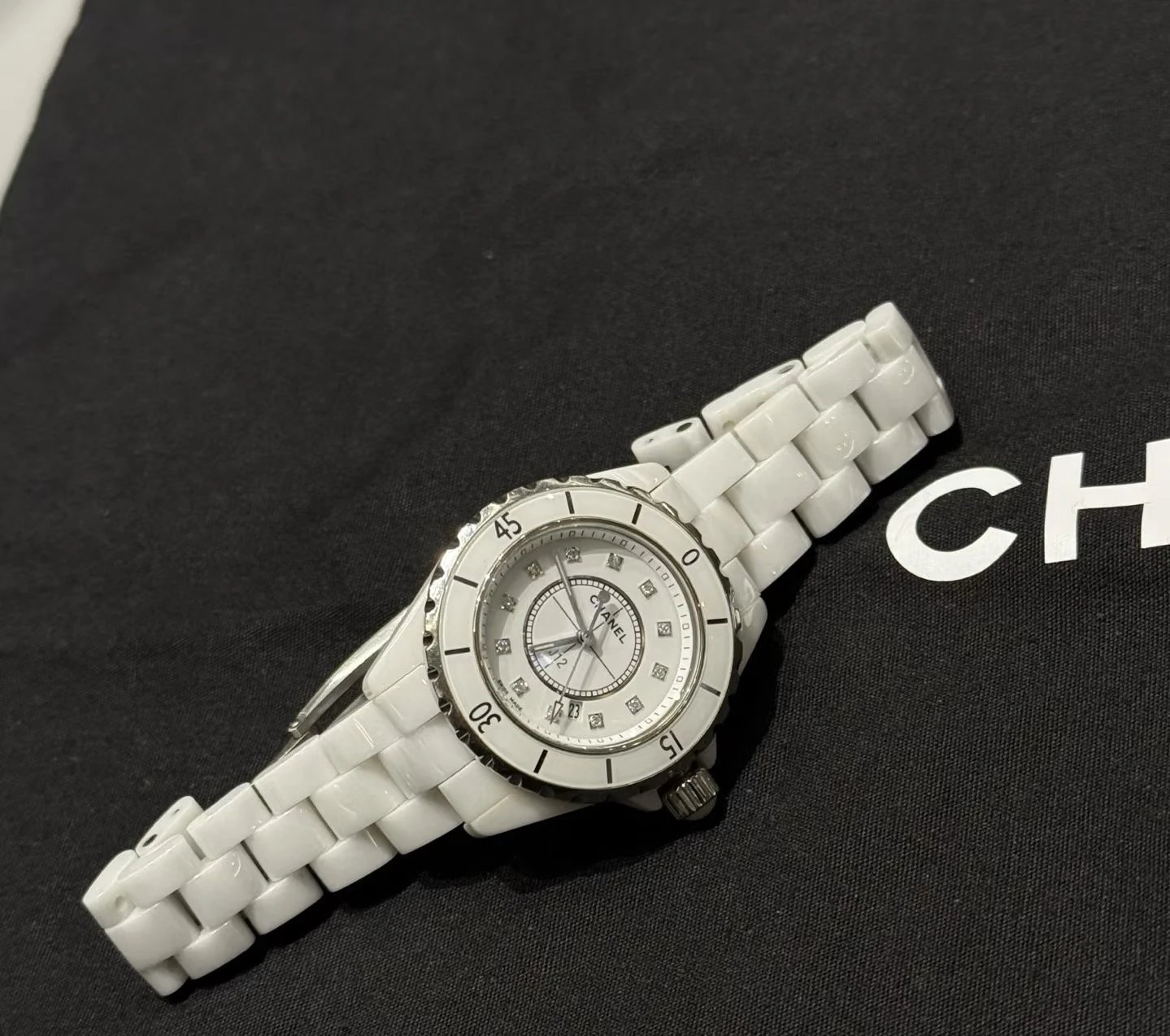 Chanel J12 Ceramic Watch features 33mm white high-tech ceramic, original diamond inlay, H5703 series, high-accuracy quartz movement for women.