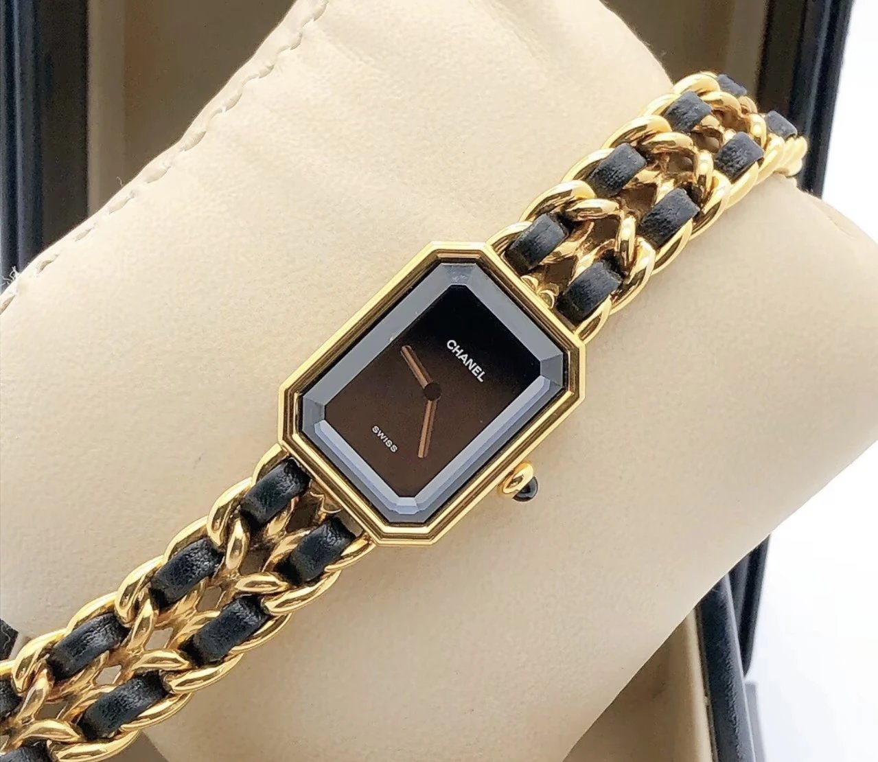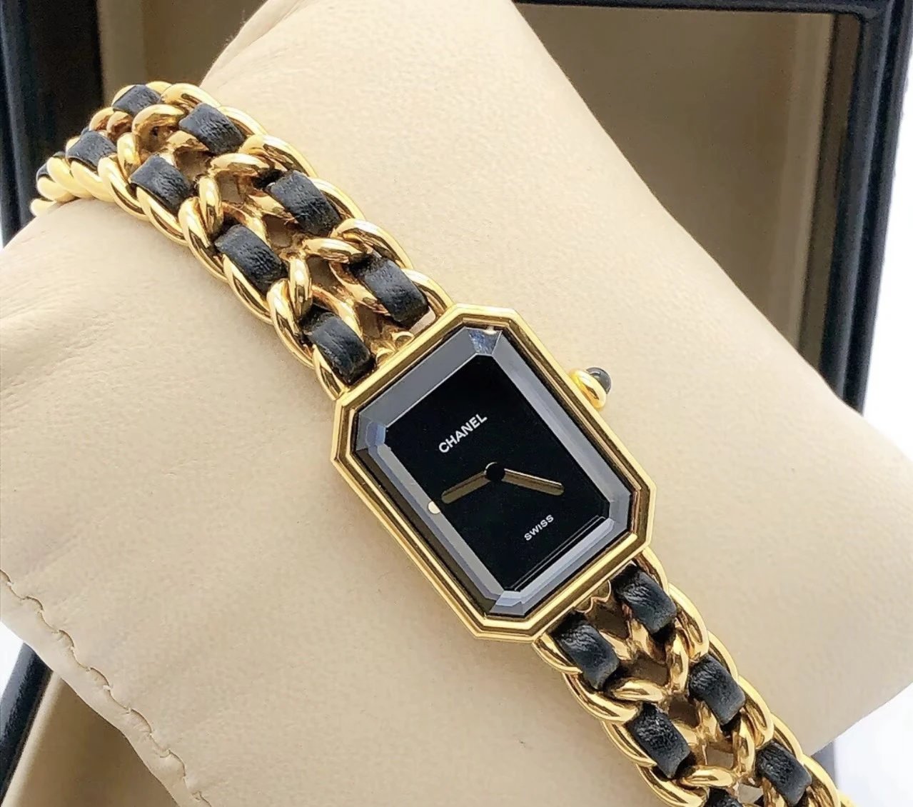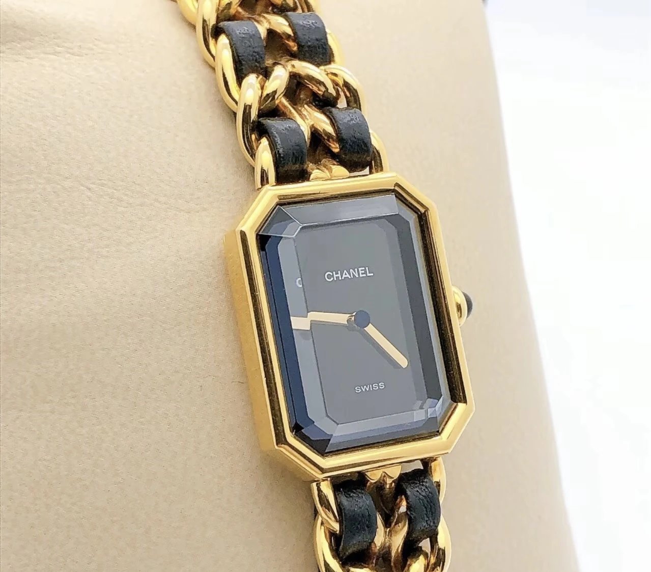 Chanel PREMIERE Series Square Black Gold Women's Watch: stainless steel gold-plated, woven strap, 20*26mm case, quartz movement, L size fits wrist under 165mm, minor strap wear.