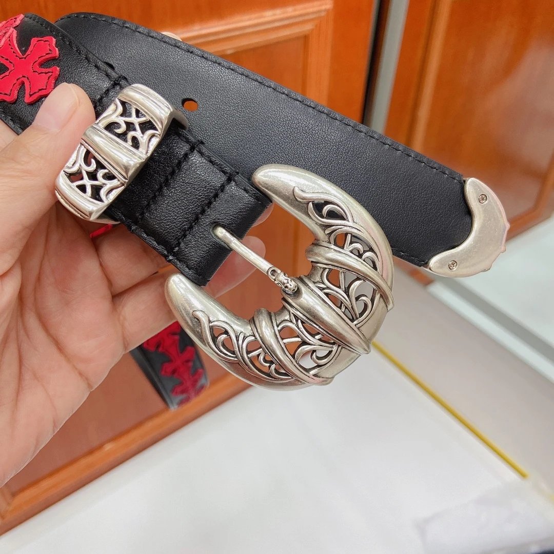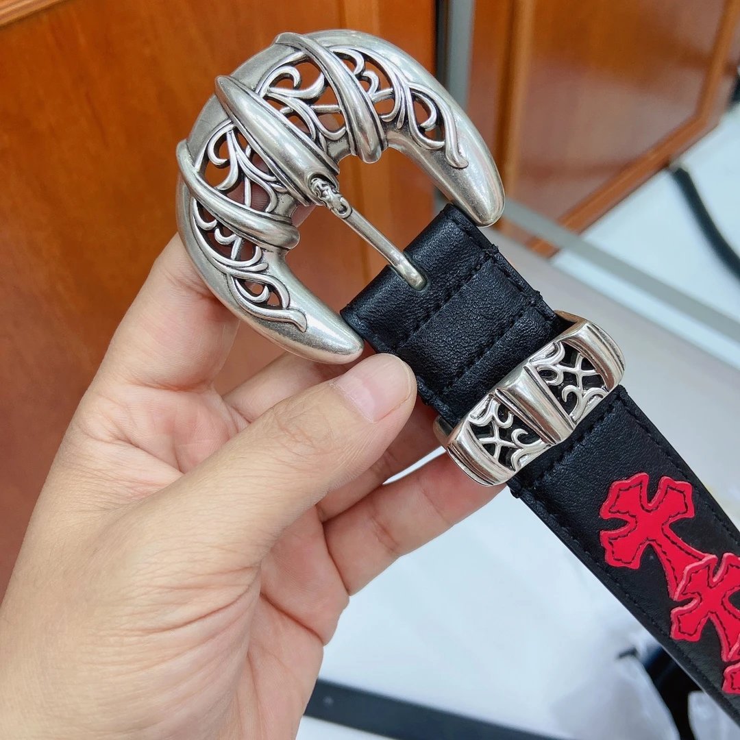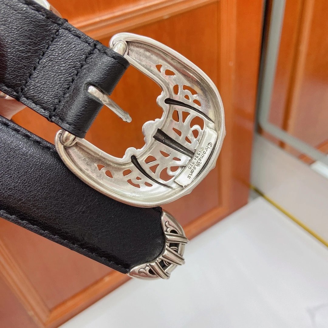 Chrome Hearts Cat Claw Buckle Belt (Fixed Style) features a pure copper silver-plated buckle and imported oiled leather strap with top-layer cross details.
