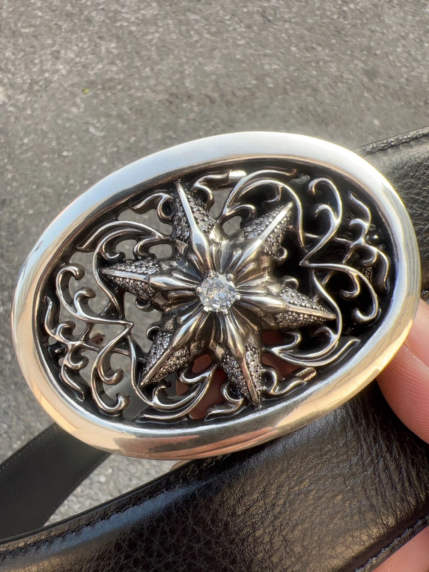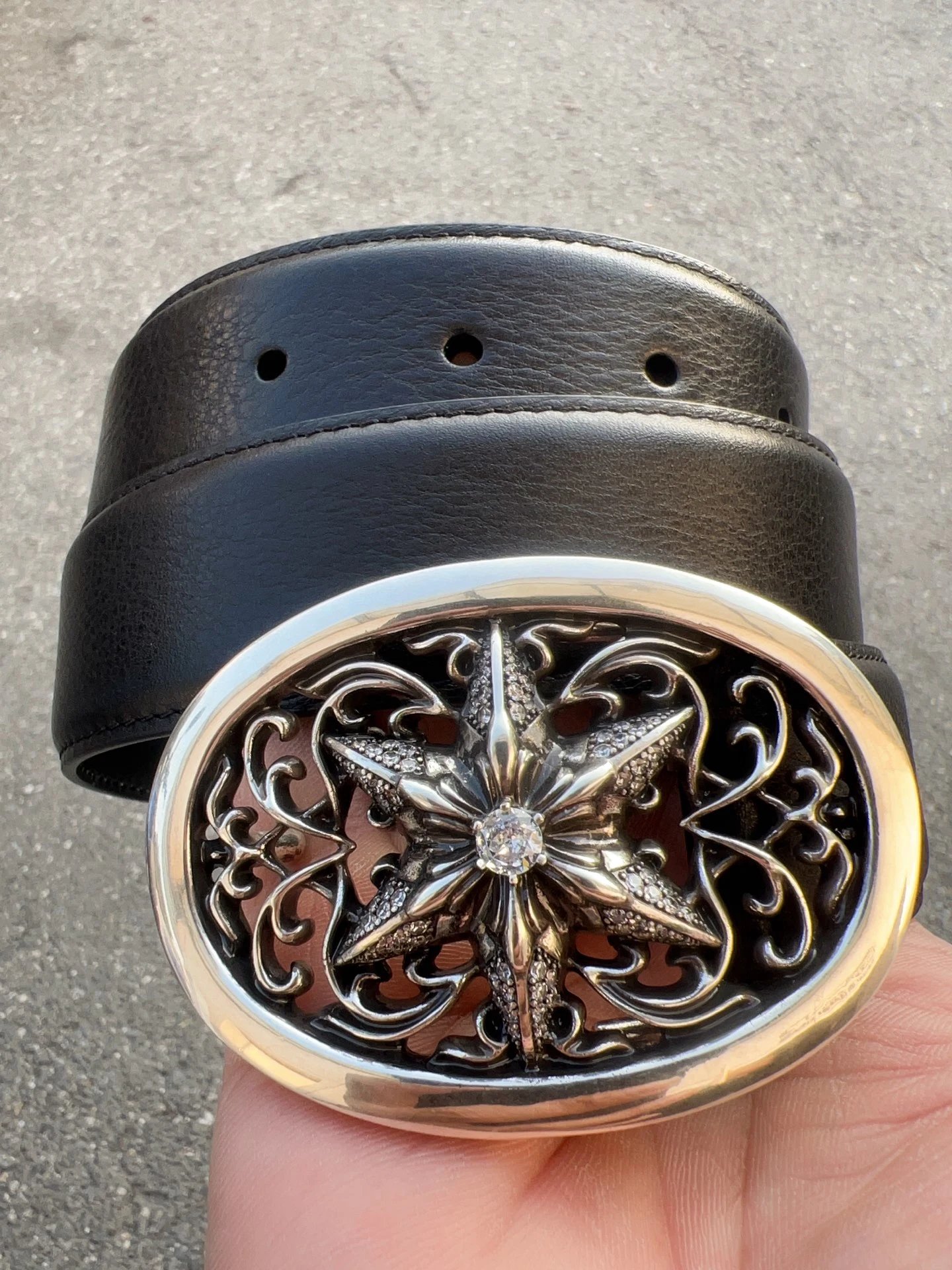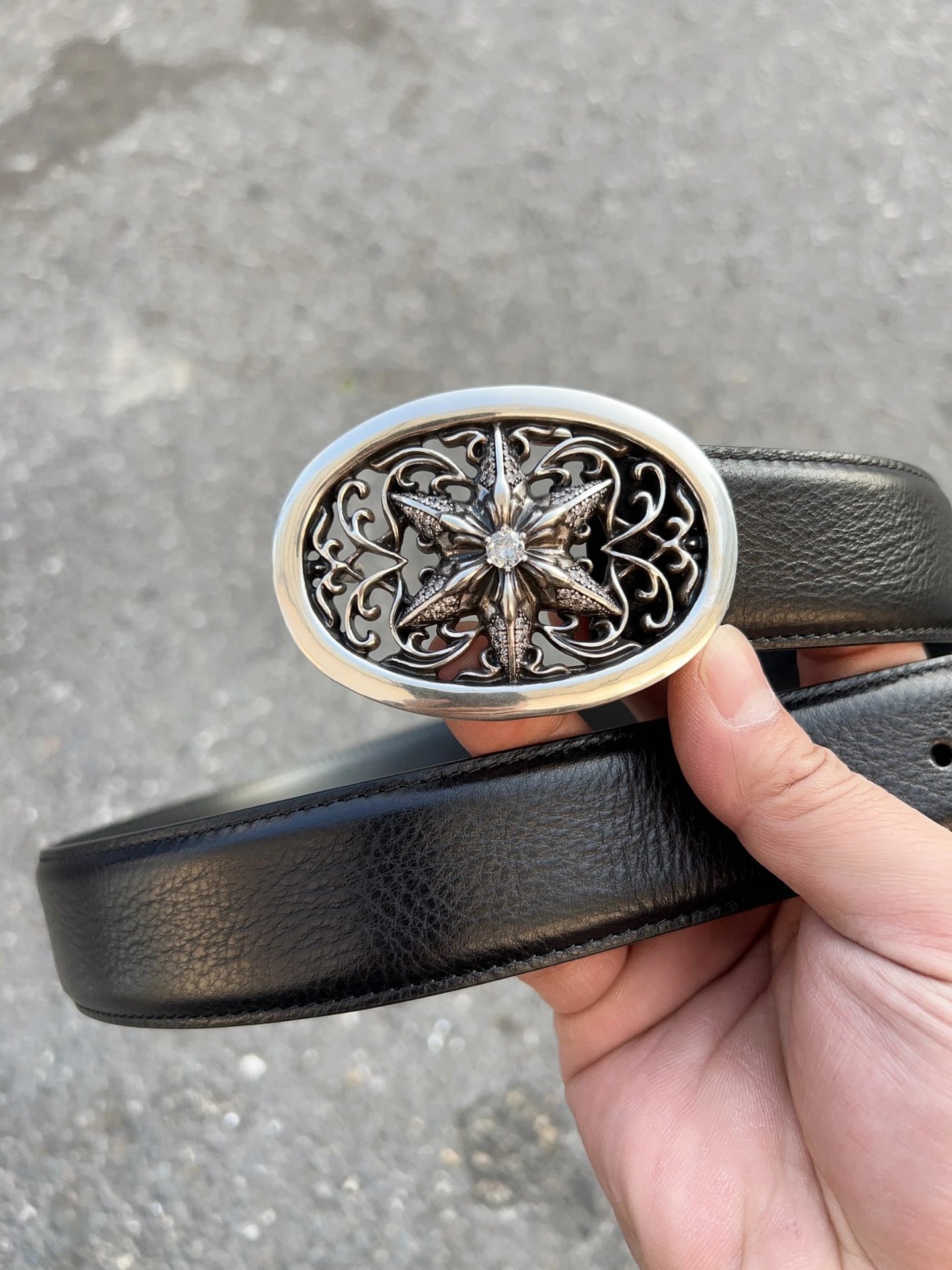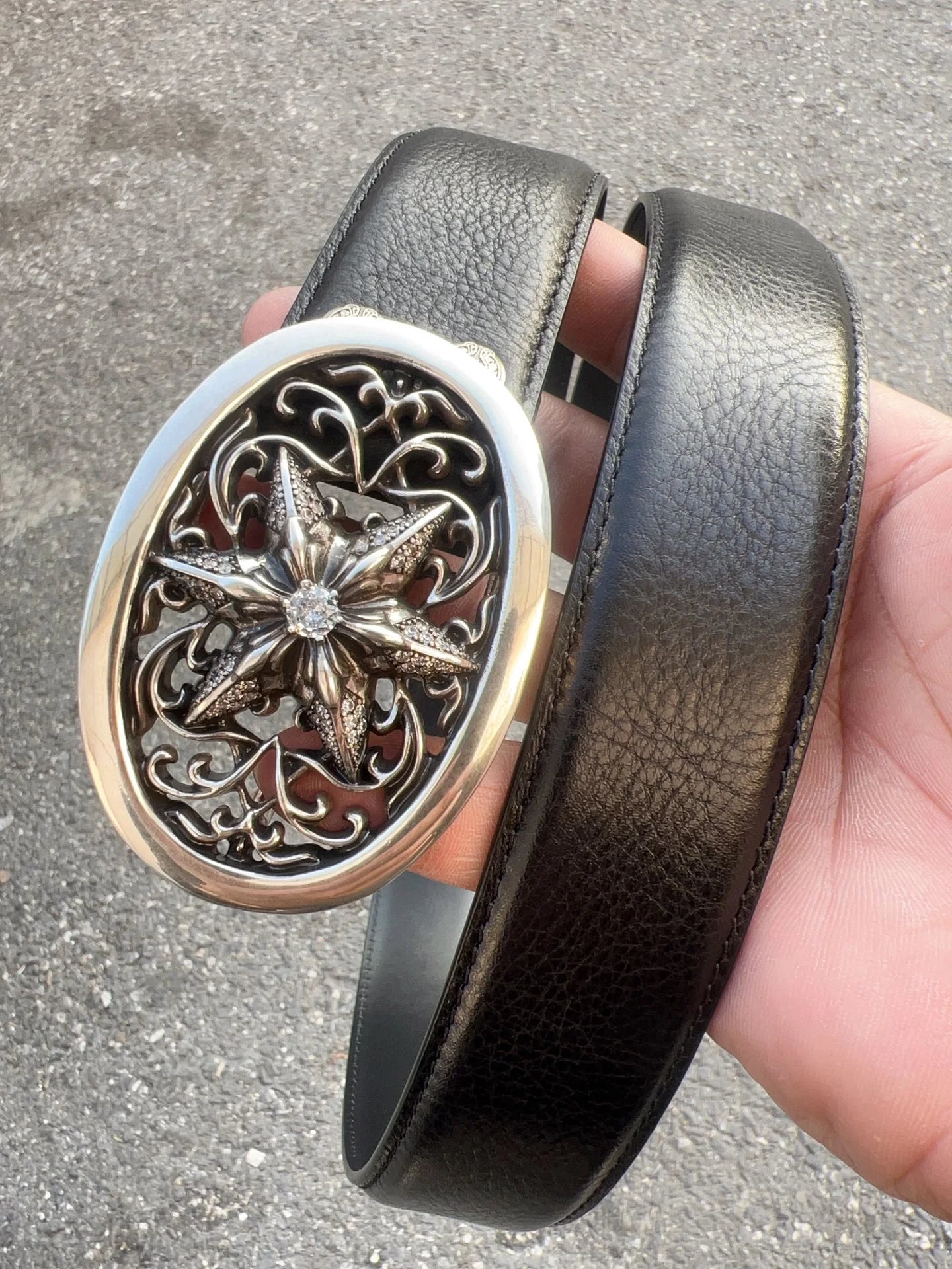 Come Hearts Star-embellished belt uses top layer oil wax cowhide, brass plated real silver hardware, 3.8cm width & 95-125cm length. Gothic/rock/punk/street hip-hop style, unisex.