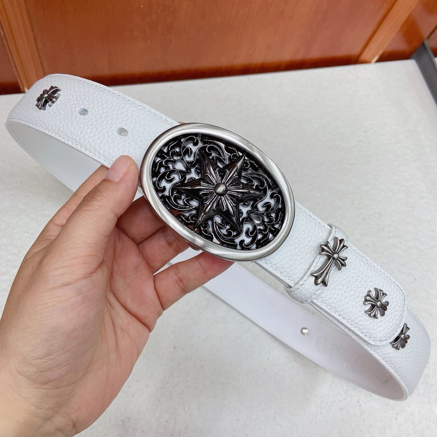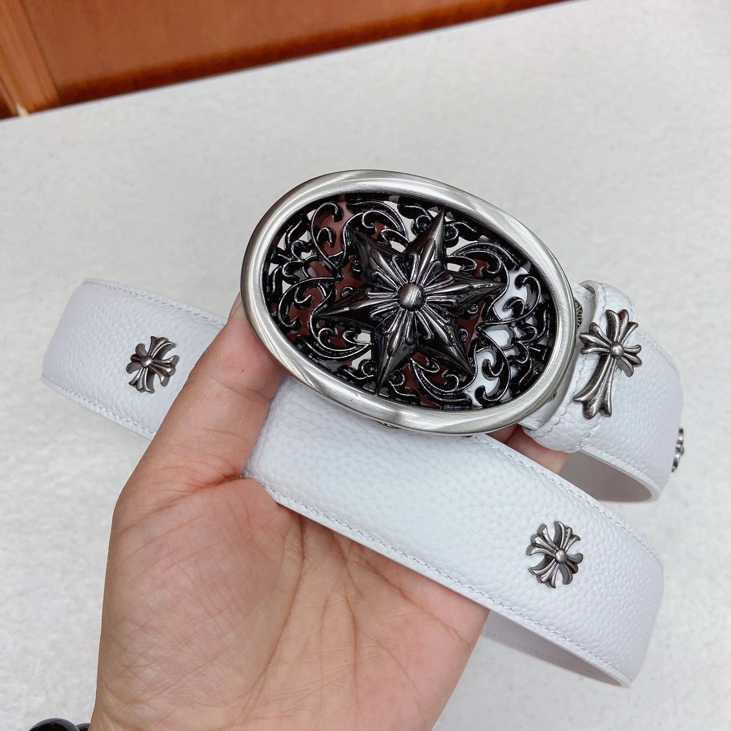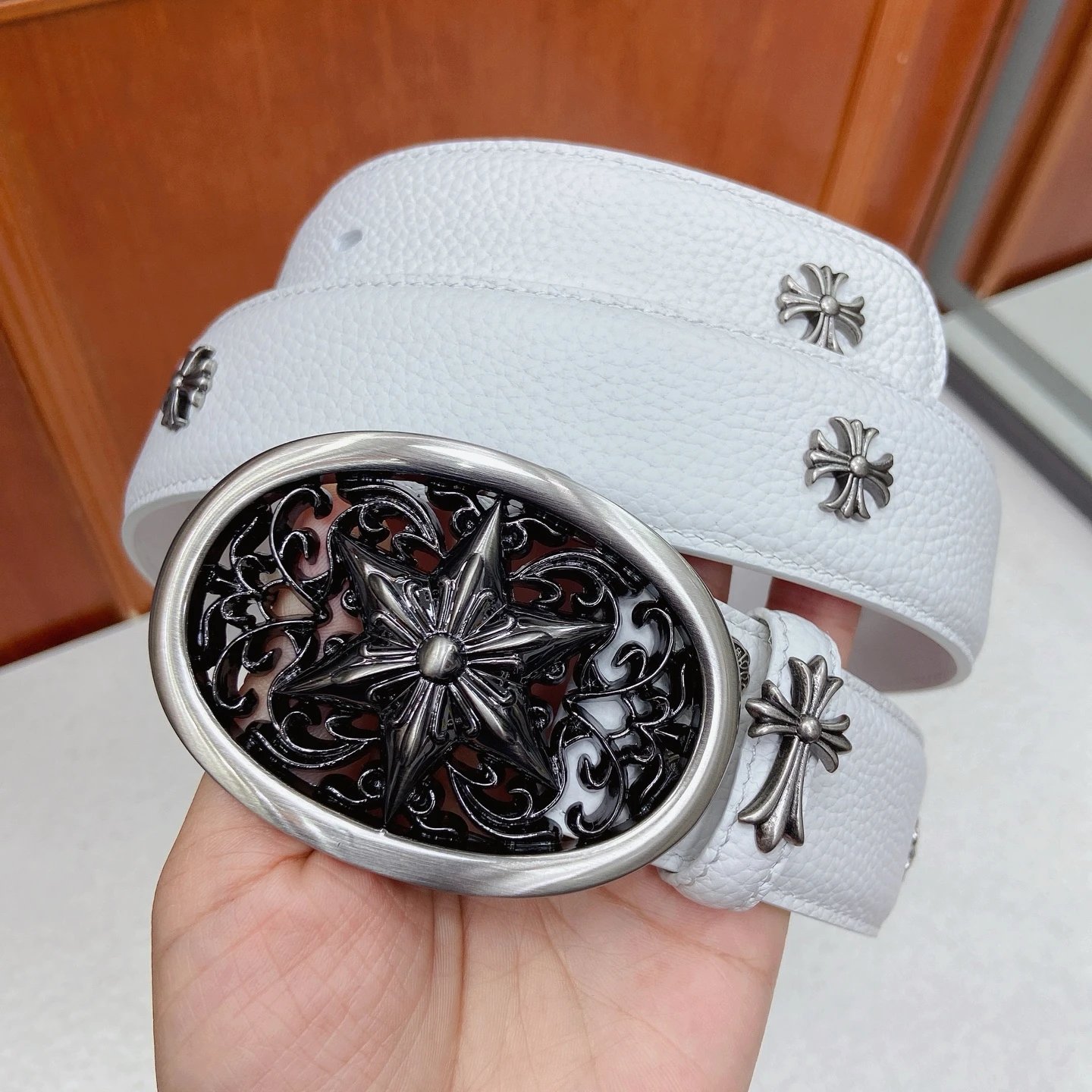 Chrome Hearts Cross Stud Belt has detachable six-pointed star brass plated 925 silver hardware, original oil waxed top layer cowhide (3.8cm width).